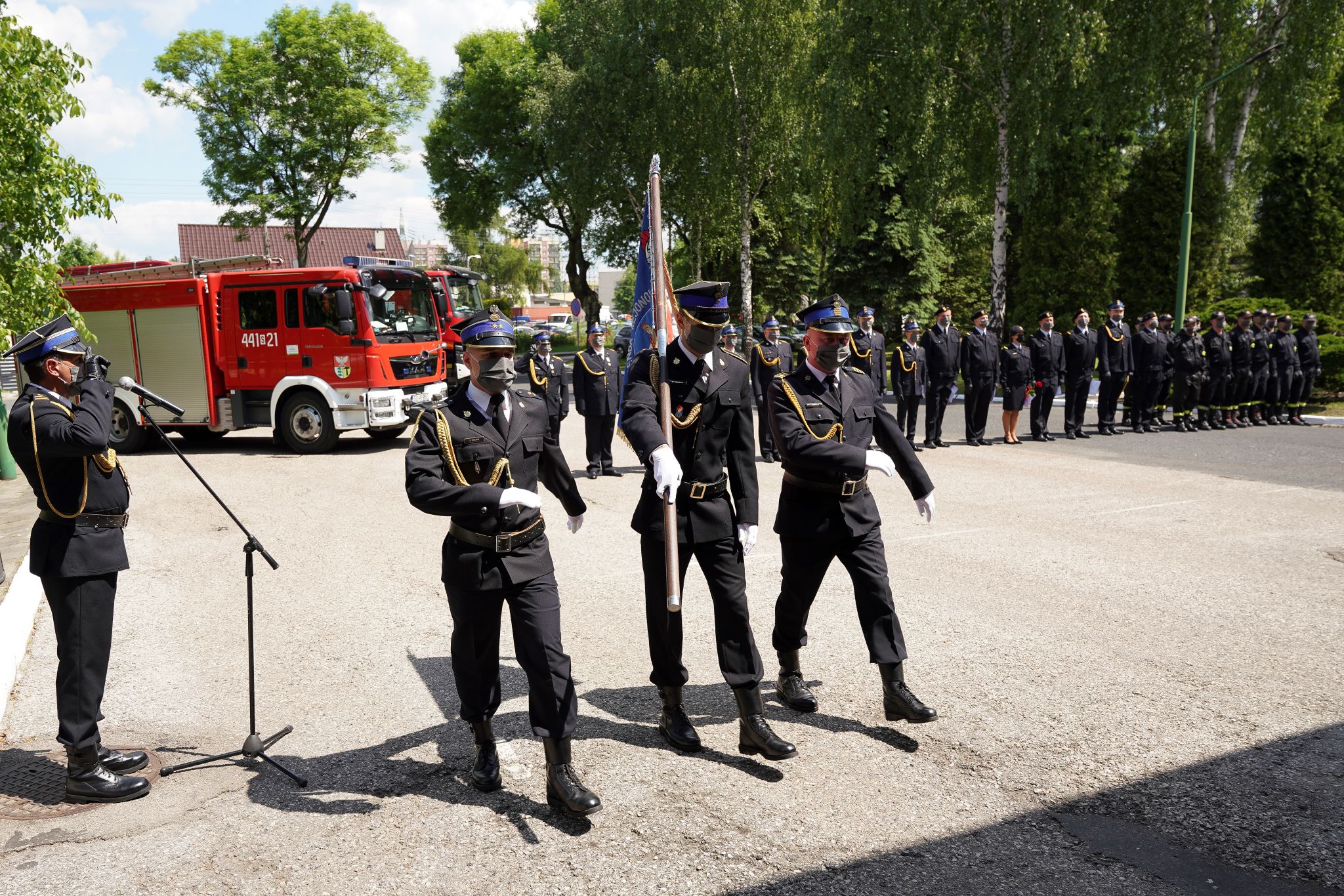 Uroczystości rozpoczęły się złożeniem meldunku przez Dowódcę uroczystości mł.bryg. Tomasza Lagnera Śląskiemu Komendantowi Wojewódzkiemu Państwowej Straży Pożarnej w Katowicach nadbryg. Jackowi Kleszczewskiemu. Następnie uroczyście podniesiono flagę państwową na maszt i został odegrany hymn państwowy. Komendant Miejski Państwowej Straży Pożarnej w Dąbrowie Górniczej st. kpt. Zbigniew Gnacik rozpoczął swoją przemowę minutą ciszy ku czci wszystkich poległych strażaków, a także członków ich rodzin, szczególnie ofiar COVID-19, a następnie przywitał zaproszonych gości.