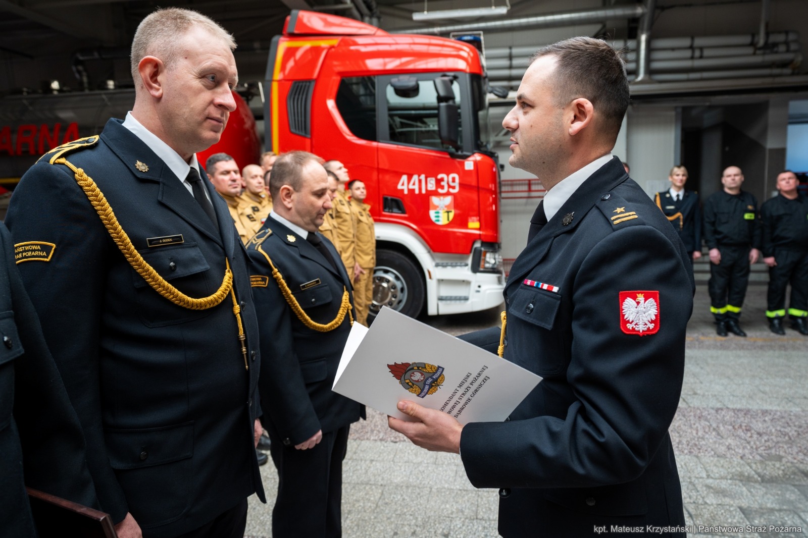 Po przyjęciu meldunku przez Komendanta Miejskiego PSP w Dąbrowie Górniczej, odczytano decyzję o odwołaniu Zastępcy Komendanta Miejskiego PSP w Dąbrowie Górniczej, bryg. Łukasza Musialika, którą Śląski Komendant Wojewódzki PSP nadbryg. Wojciech Kruczek, wręczył osobiście w dniu dzisiejszym w Komendzie Wojewódzkiej PSP w Katowicach. .