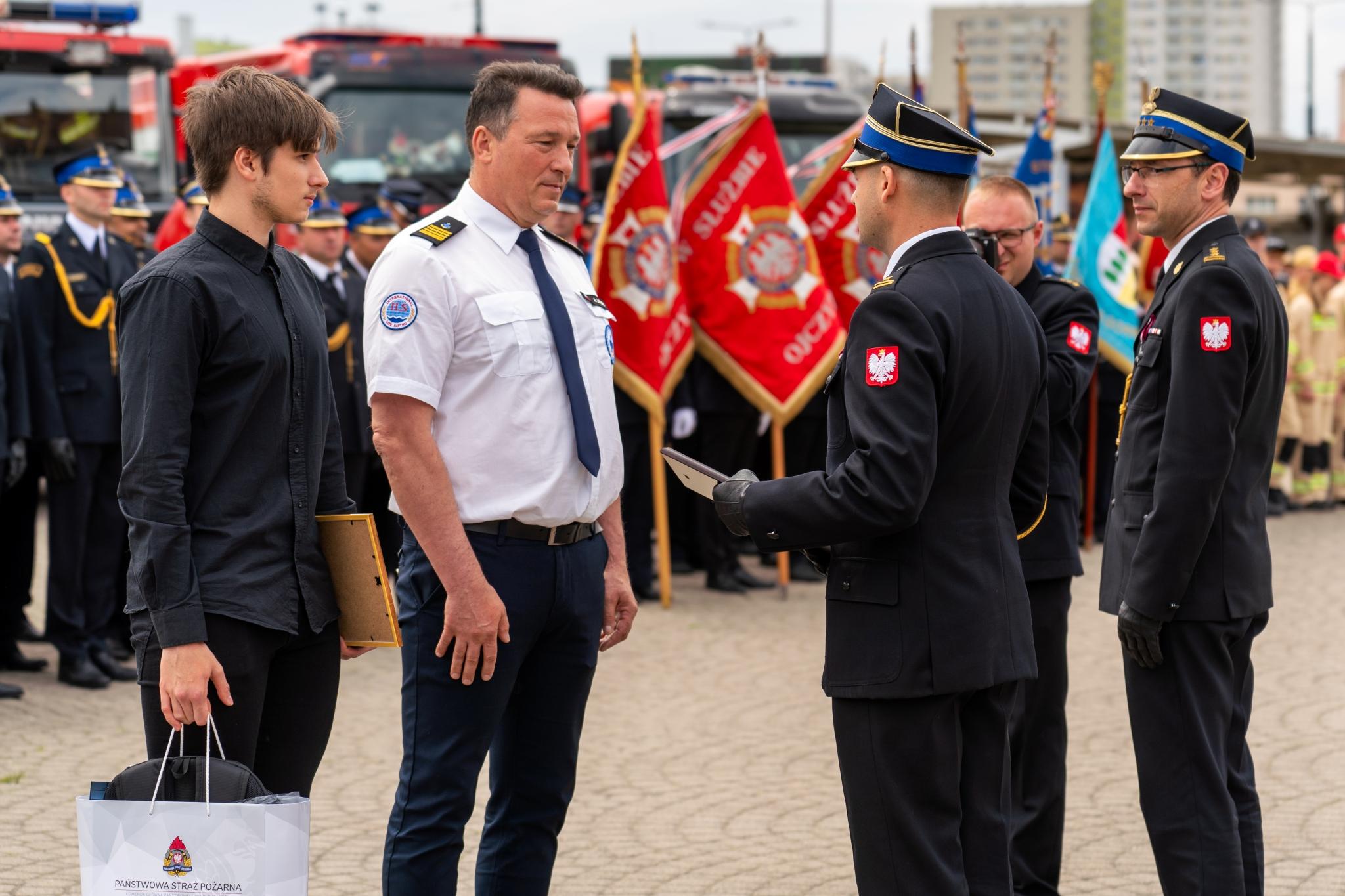 To wyjątkowe wyróżnienie w imieniu Komendanta Głównego PSP nadbryg. dr. inż. Mariusza Feltynowskiego, wręczył podczas uroczystości Śląski Komendant Wojewódzki PSP st. bryg. Wojciech Kruczek.