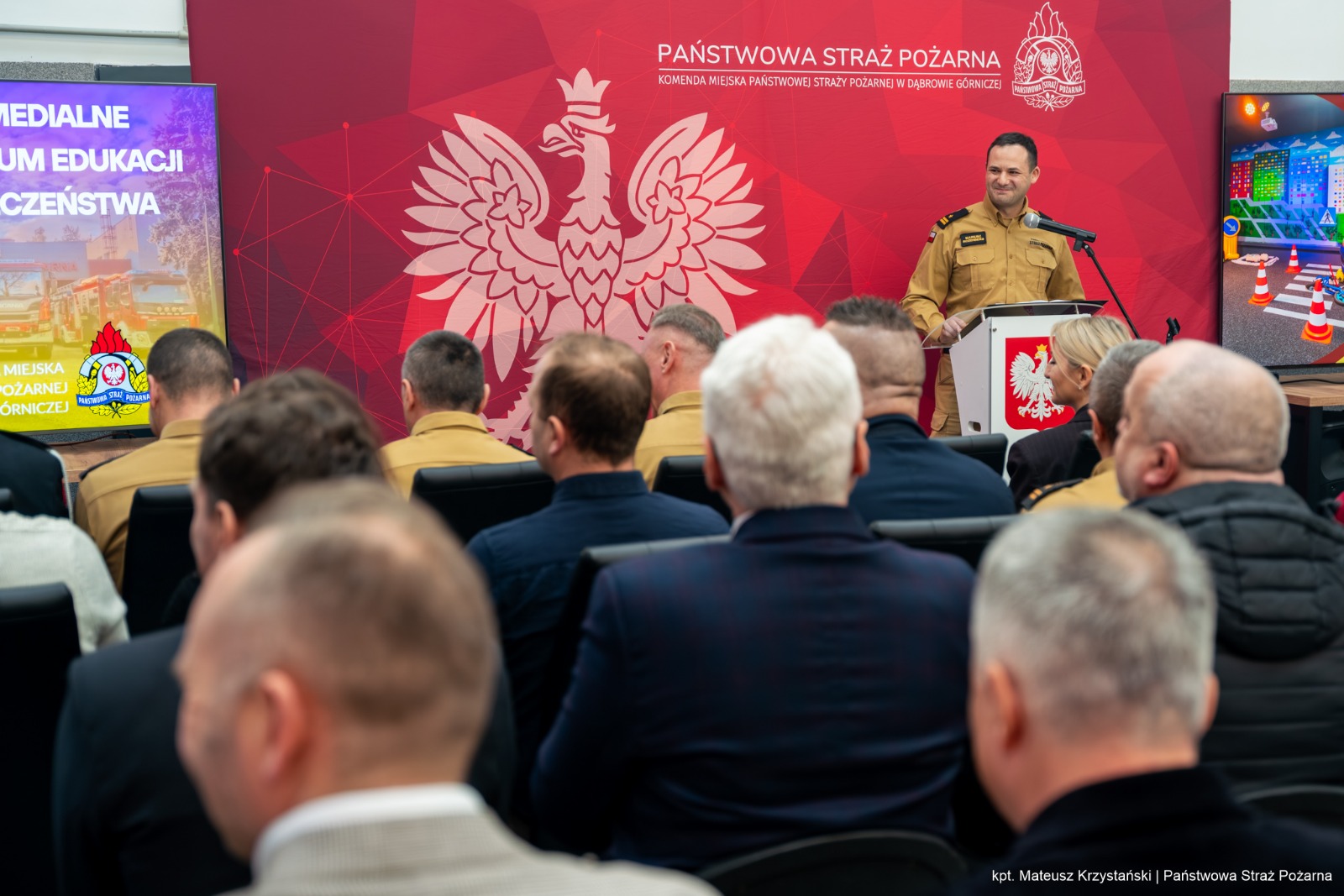 Podczas spotkania Komendant Miejski PSP w Dąbrowie Górniczej, mł. bryg. Mariusz Rozenberg, przedstawił etapy realizacji inwestycji oraz główne założenia projektu. W swoim wystąpieniu podkreślił znaczenie edukacji w zakresie bezpieczeństwa oraz podziękował partnerom i firmom, których wsparcie umożliwiło powstanie MCEB.