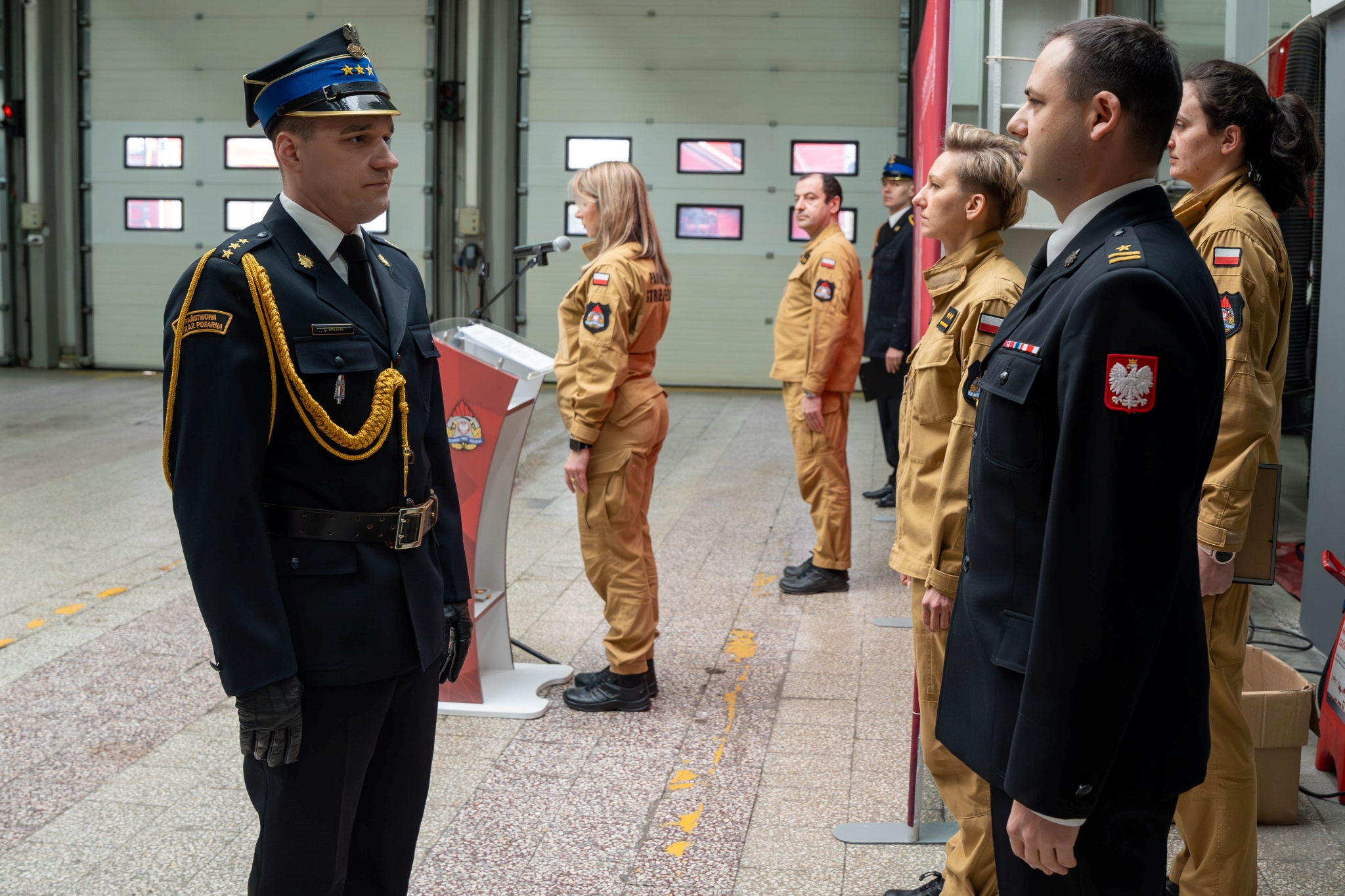 Następnie swoje ślubowanie złożył podejmujący służbę w Państwowej Straży Pożarnej, str. Michał Czaja, a funkcjonariusze st. str. Adam Ferdyn, st. str. Mateusz Cupiał oraz st. str. Tomasz Kucharski, otrzymali z rąk Komendanta Miejskiego PSP w Dąbrowie Górniczej decyzje o zmianie stanowisk.