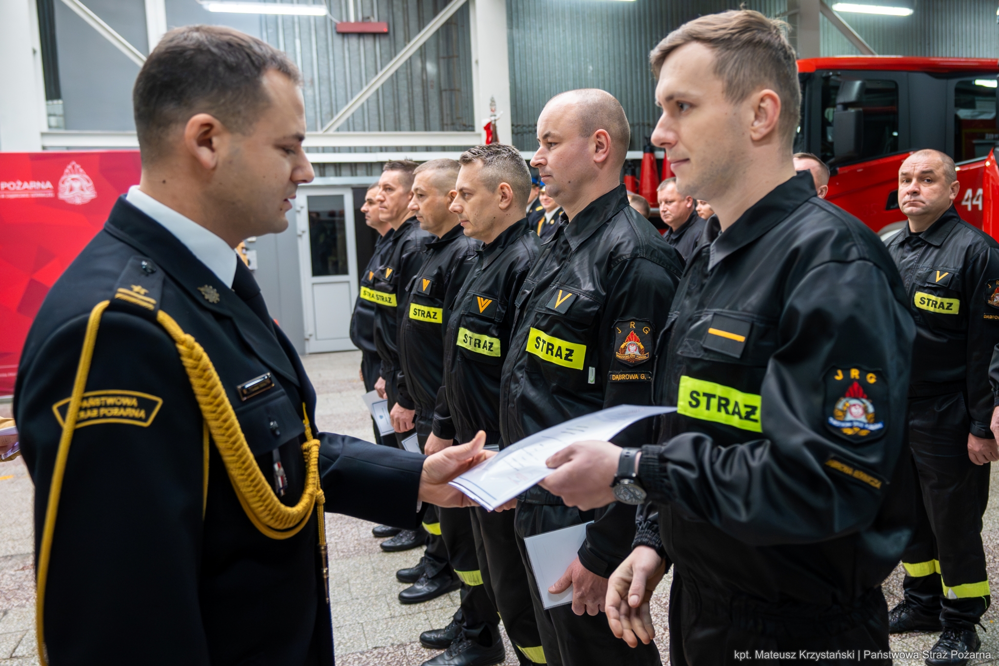 Komendant Miejski Państwowej Straży Pożarnej w Dąbrowie Górniczej mł. bryg. Mariusz Rozenberg wręczył decyzje dotyczące zmiany stanowisk, następującym funkcjonariuszom: