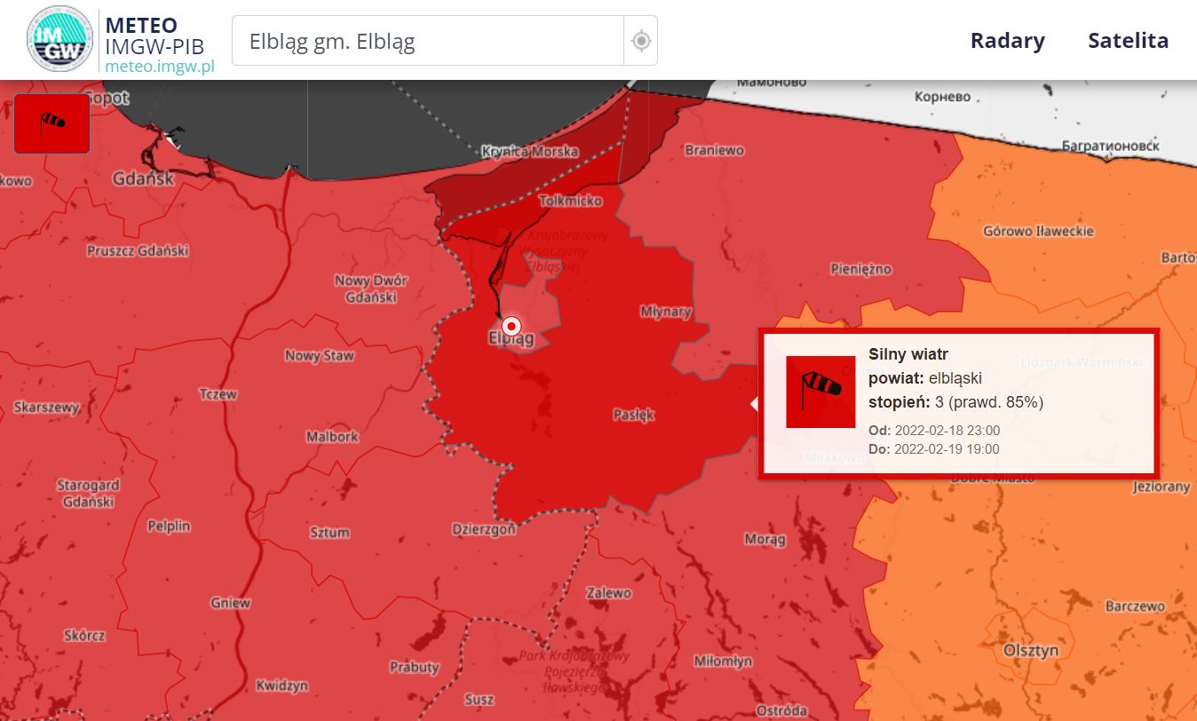 Instytut Meteorologii i Gospodarki Wodnej wydał ostrzeżenie 3 stopnia przed SILNYM WIATREM dla powiatu elbląskiego.