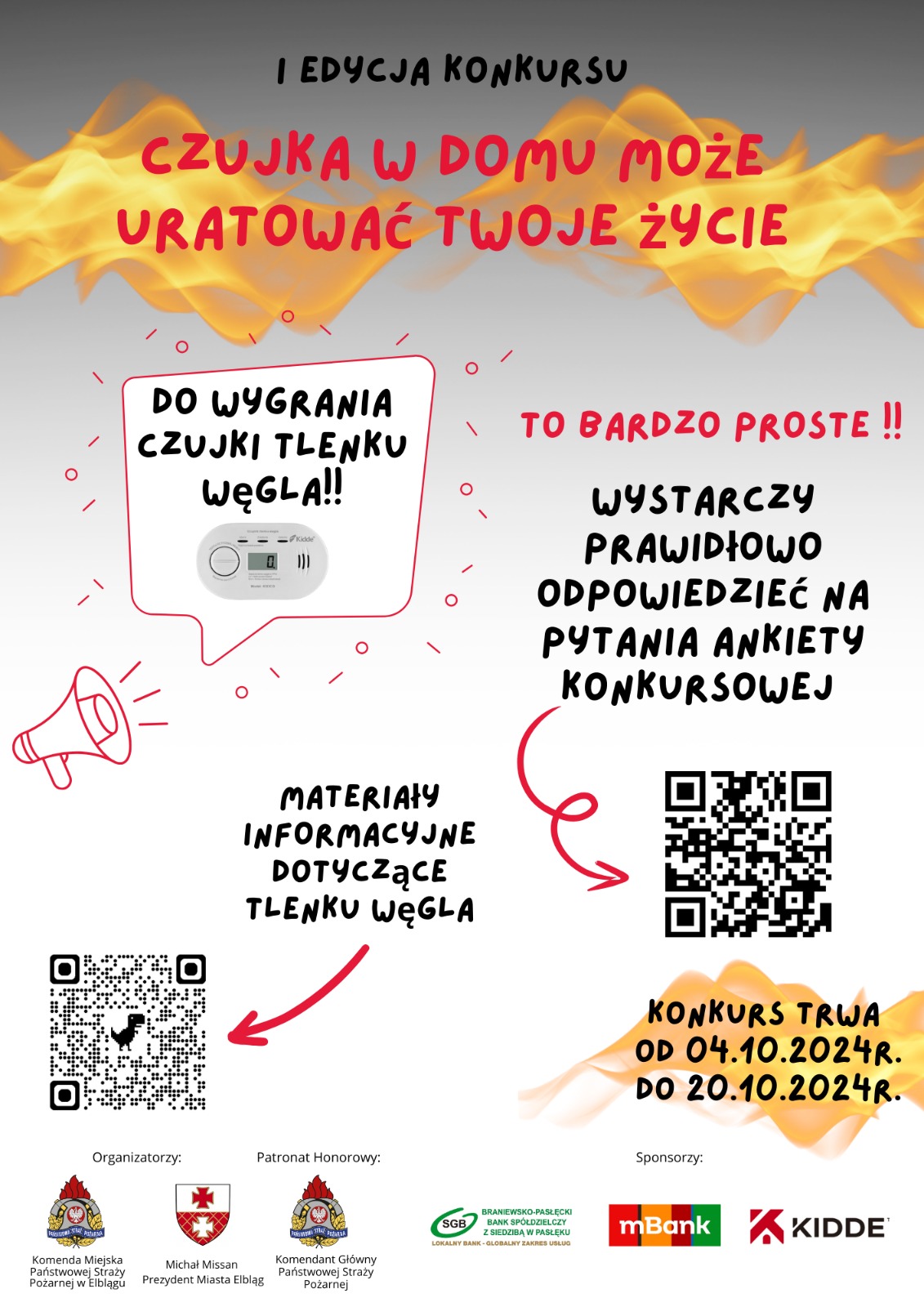 Głównym celem konkursu jest propagowanie wśród mieszkańców Elbląga profilaktyki związanej z zatruciami tlenkiem węgla oraz podniesienie świadomości dotyczącej zagrożeń związanych z pożarami w lokalach mieszkalnych, których ilość znacznie wzrasta w okresie jesienno - zimowym. Konkurs potrwa od 4 do 20 października. Zasady udziału są bardzo proste. Wystarczy zapoznać się z materiałami dotyczącymi tlenku węgla i prawidłowo odpowiedzieć na pytania ankiety konkursowej.