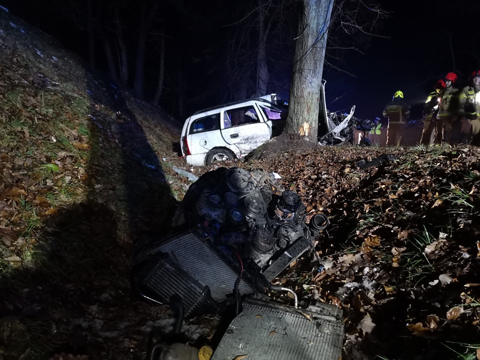 Zdarzenie miało miejsce w Kamionku Wielkim. Z niewyjaśnionych przyczyn kierowca osobowego Opla, zjechał z drogi i uderzył w przydrożne drzewo. Na miejscu ustalono, że pojazdem podróżował sam kierowca. Działania straży w pierwszej kolejności polegały na zabezpieczeniu miejsca zdarzenia i udzieleniu kwalifikowanej pierwszej pomocy poszkodowanemu do czasu przyjazdu zespołu ratownictwa medycznego. Po wykonaniu dostępu, w asyście ratowników medycznych ewakuowano poszkodowanego do pojazdu karetki. Ranny mężczyzna został zabrany przez ZRM do szpitala.