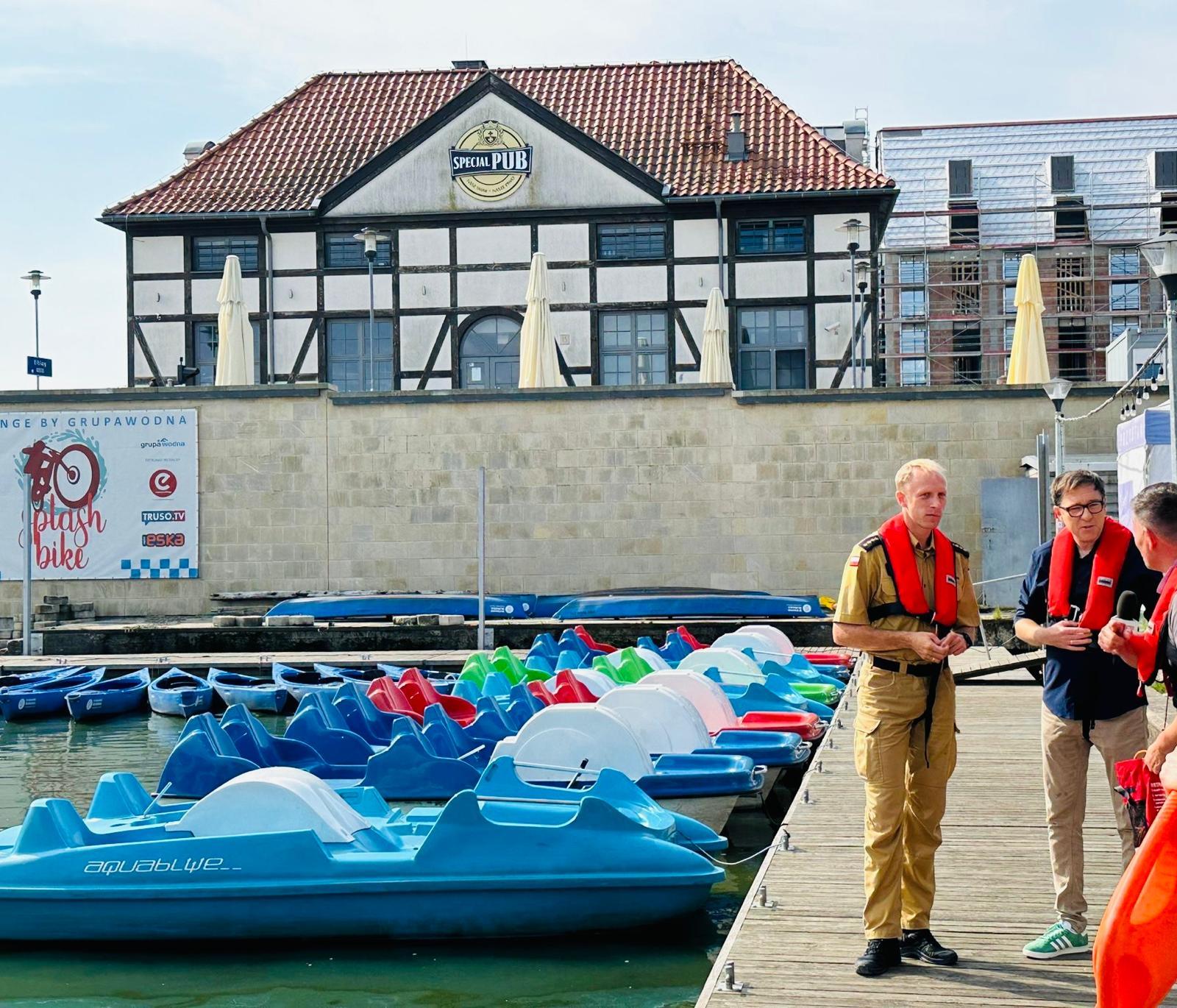 Jednym z prezentowanych epizodów było ukazanie sytuacji, w której dwie osoby wpadają do wody z rowerka wodnego - tylko jedna z nich ma na sobie kamizelkę ratunkową, tym samym dochodzi do sytuacji bardzo niebezpiecznej, w której osoba bez kamizelki zaczyna się topić. Tą inscenizacją pokazaliśmy jak ważne są podstawowe zasady bezpiecznego wypoczynku i w jaki sposób skutecznie udzielić pierwszej pomocy nie narażając własnego bezpieczeństwa tj.