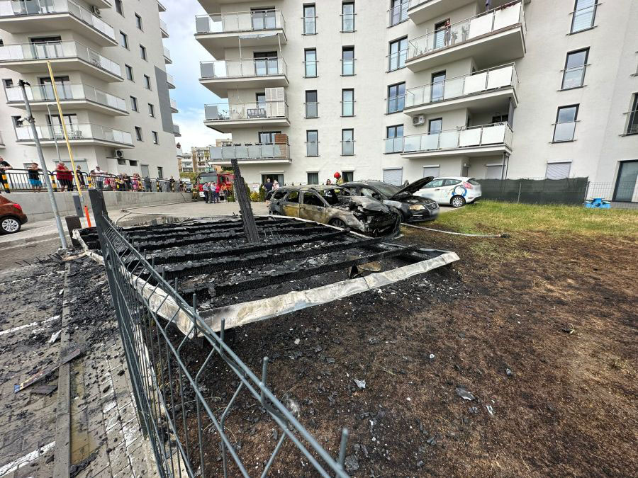 Po dotarciu na miejsce strażacy zastali w pełni rozwinięty pożar wiaty oraz zaparkowanych w bliskim sąsiedztwie dwóch aut osobowych. Działania straży polegały na zabezpieczeniu miejsca zdarzenia i podaniu łącznie dwóch prądów gaśniczych, co w efekcie doprowadziło do ugaszenia pożaru. W zdarzeniu nie odnotowano osób poszkodowanych, jednak całkowitemu zniszczeniu uległa wiata śmietnikowa i dwa auta osobowe, a pięć kolejnych pojazdów zostało uszkodzonych w wyniku oddziaływania wysokiej temperatury.