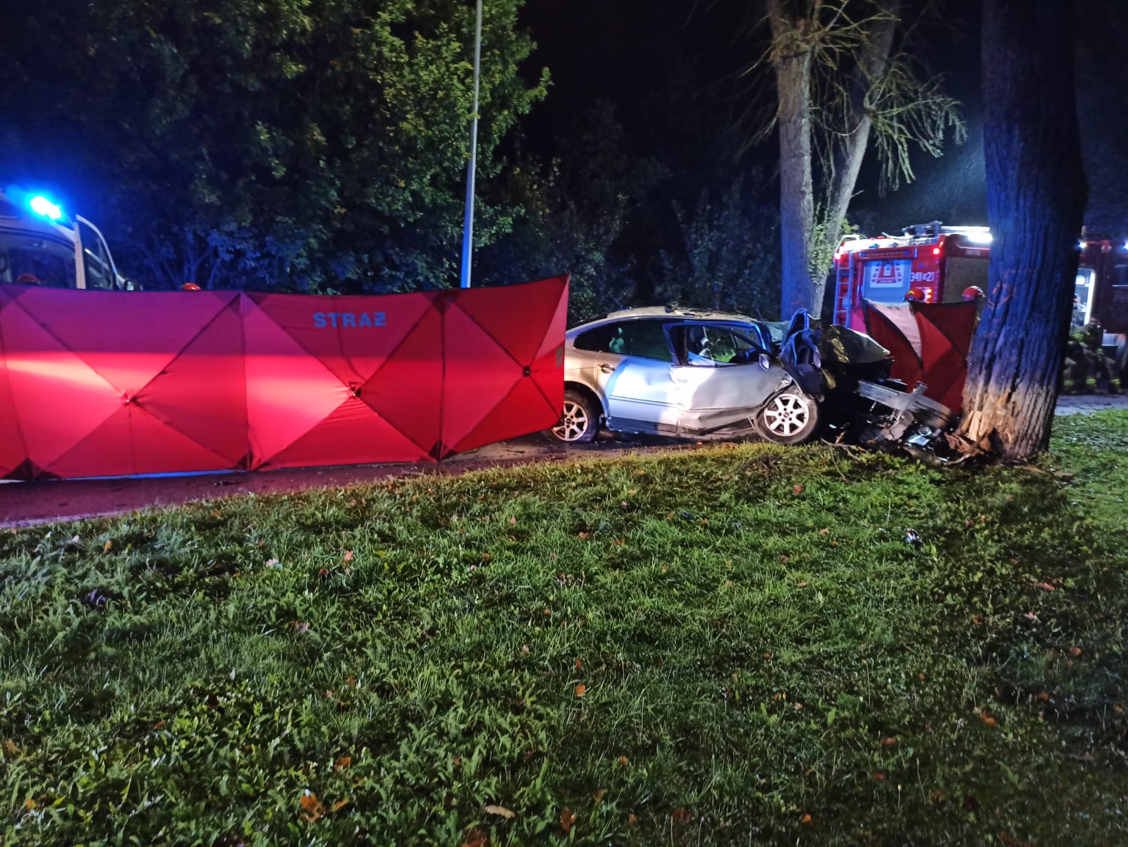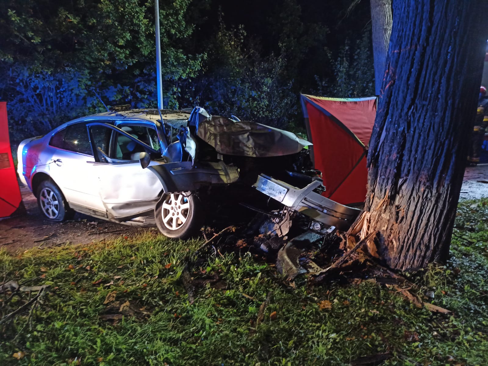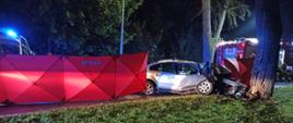 Z niewyjaśnionych przyczyn kierowca osobowego volkswagena, na łuku drogi zjechał na pobocze i uderzył w przydrożne drzewo. Na miejscu ustalono, że w zdarzeniu nie brały udział inne osoby. Działania straży w pierwszej kolejności polegały na zabezpieczeniu miejsca zdarzenia oraz ewakuowaniu kierowcy z wraku pojazdu i przekazaniu przybyłemu na miejsce zespołowi ratownictwa medycznego. Mimo starań ratowników mężczyzny nie udało się uratować.