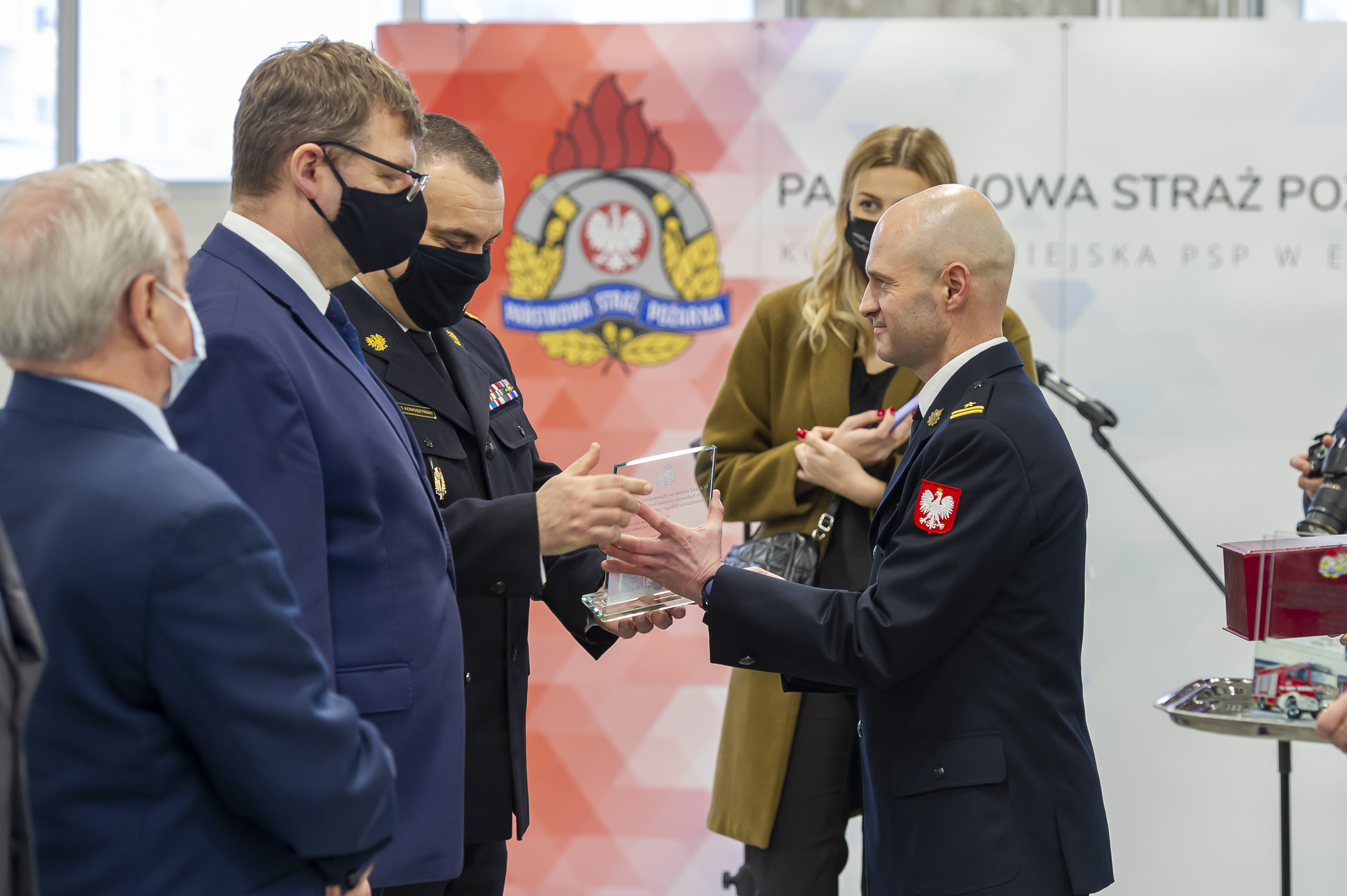 Na zakończenie Komendant Miejski PSP w Elblągu mł. bryg Łukasz Kochan wręczył pamiątkowe statuetki osobom, które w istotny sposób przyczyniły się do pozyskania zaprezentowanych dziś pojazdów pożarniczych.