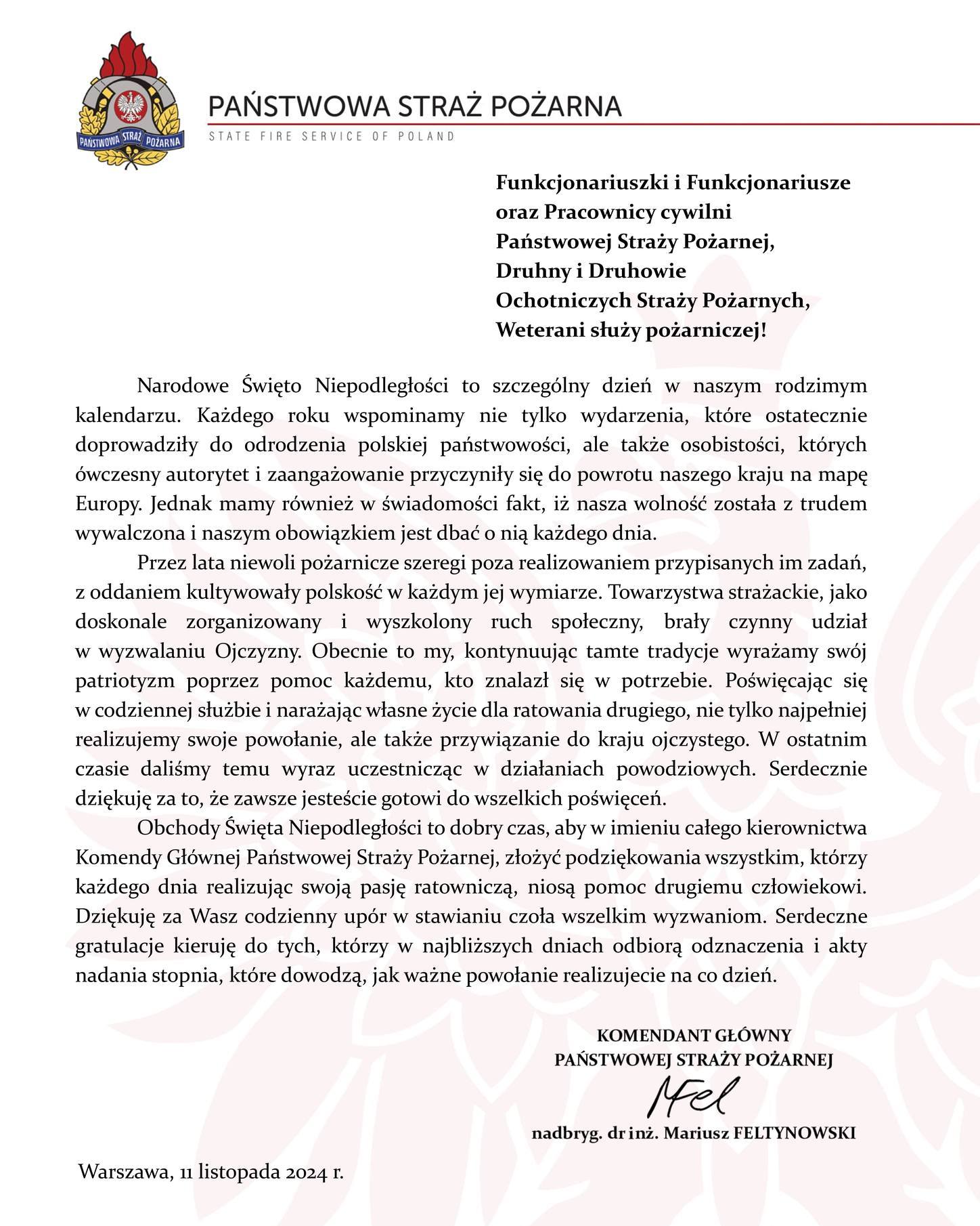 Życzenia Komendanta Głównego Państwowej Straży Pożarnej z okazji Narodowego Święta NIepodległości 11.11.2024 Zdjęcia (1) Pokaż zdjęcie 1 z galerii.