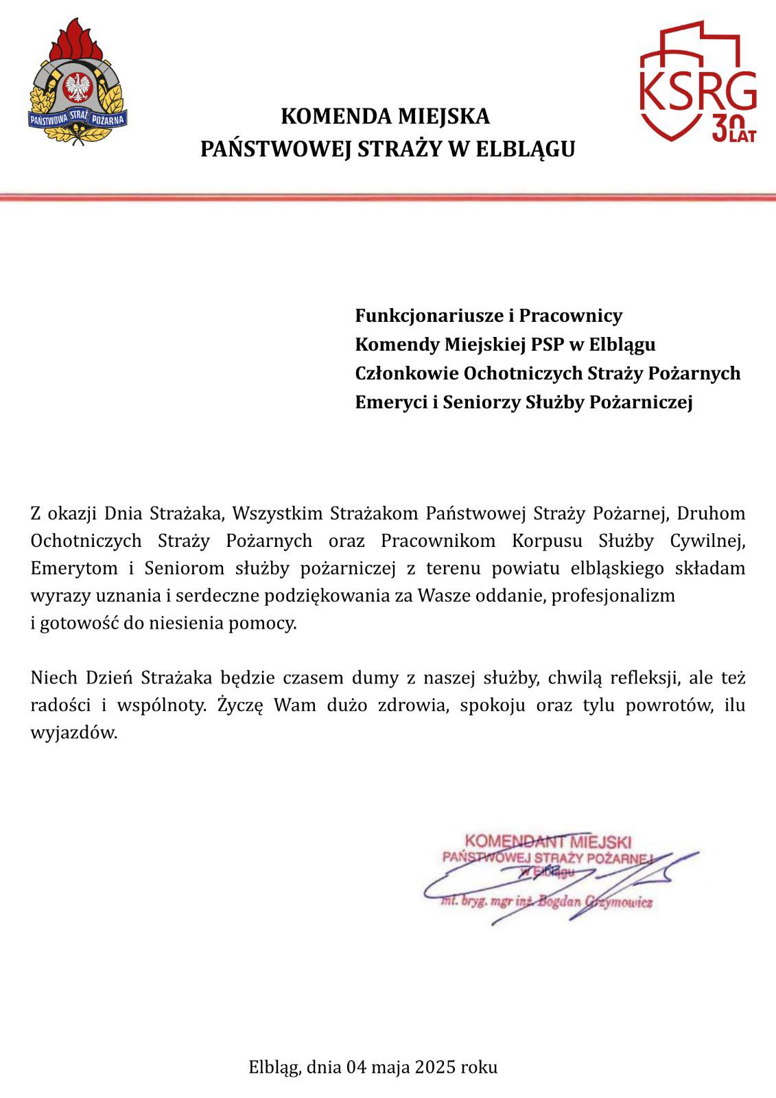 Życzenia Komendanta Miejskiego Państwowej Staży Pożarnej w Elblągu z okazji Dnia Strażaka