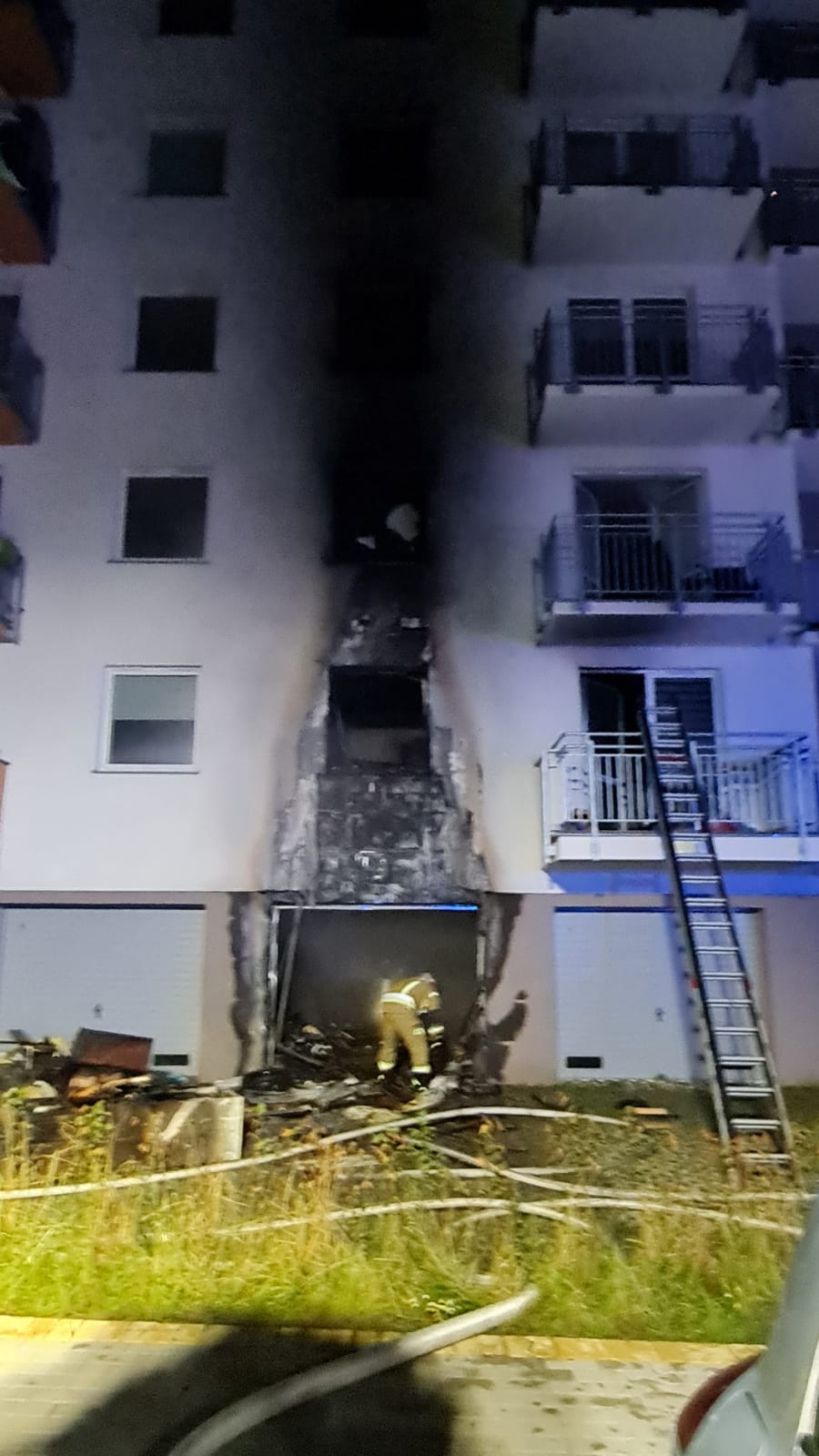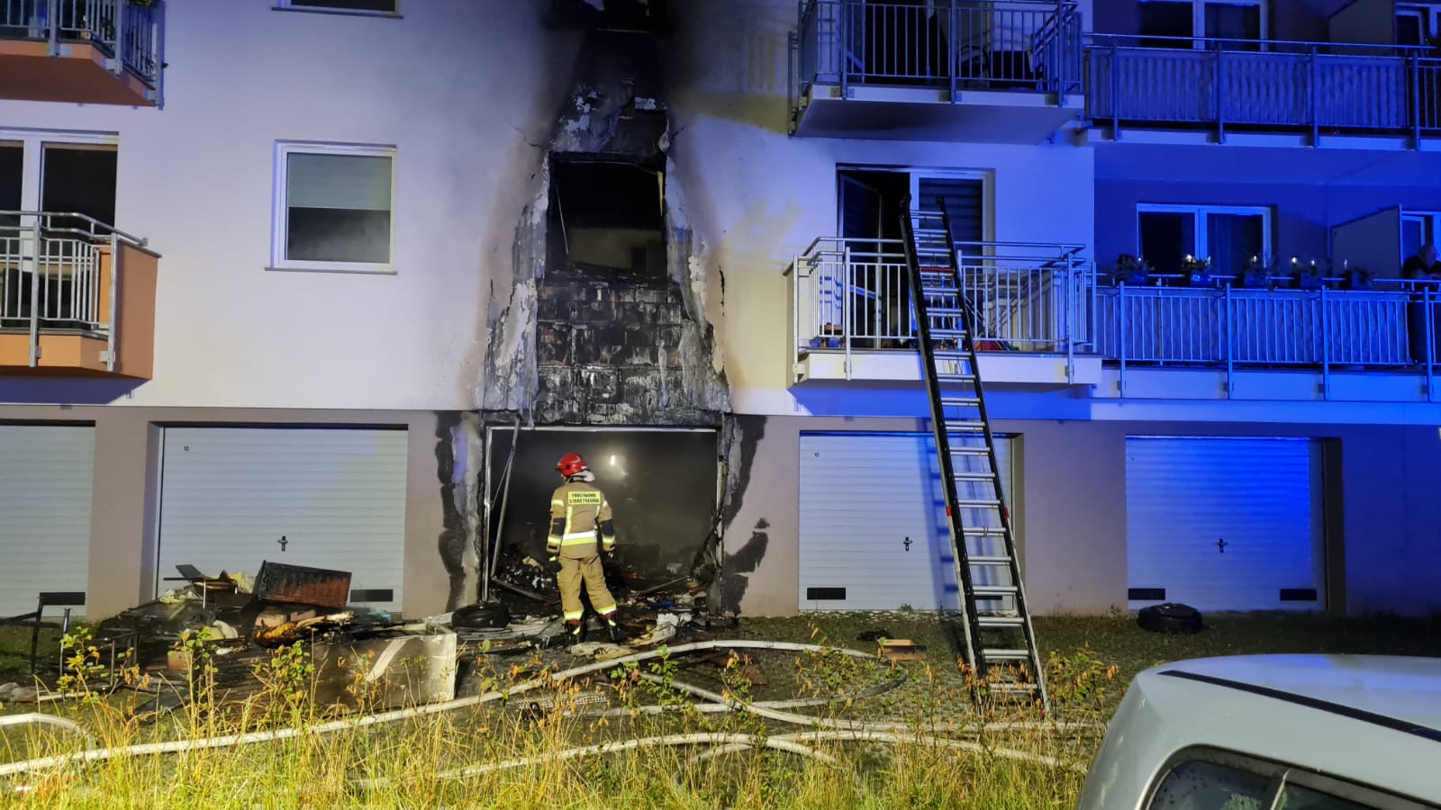 Do drugiego zdarzenia doszło tuż po godz. 23 na ul. Piotrkowskiej. Ze wstępnych informacji wynikało, że pali się pomieszczenie garażowe w budynku wielorodzinnym. Po przybyciu na miejsce stwierdzono mocno rozwinięty pożar, który bezpośrednio zagrażał mieszkaniu znajdującemu się nad pomieszczeniem garażowym. Na źródło pożaru podano jeden prąd w natarciu, drugi prąd podano w obronie mieszkania powyżej. Sprawiono drabinę pożarniczą, za pomocą której uzyskano dostęp do zagrożonego lokalu. Wewnątrz znajdował się lokator, którego ewakuowano do miejsca bezpiecznego. Poszkodowany z objawami podtrucia gazami pożarowymi, wymagał interwencji medycznej. Został przekazany przybyłemu na miejsce zespołowi ZRM.