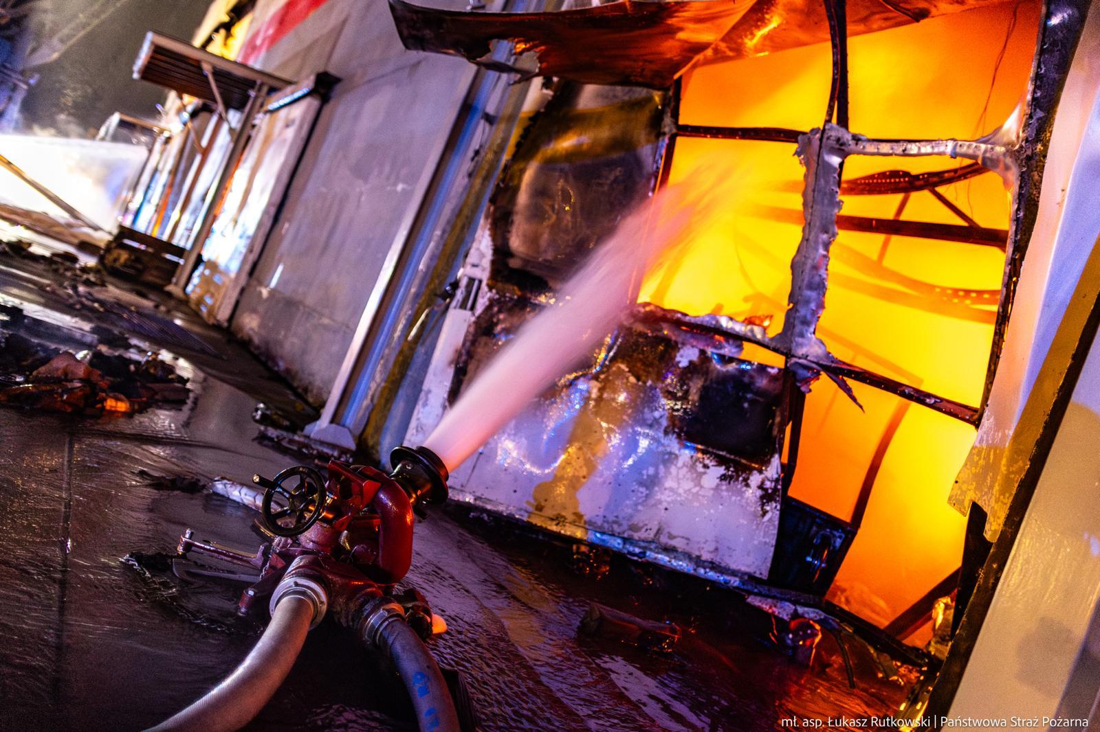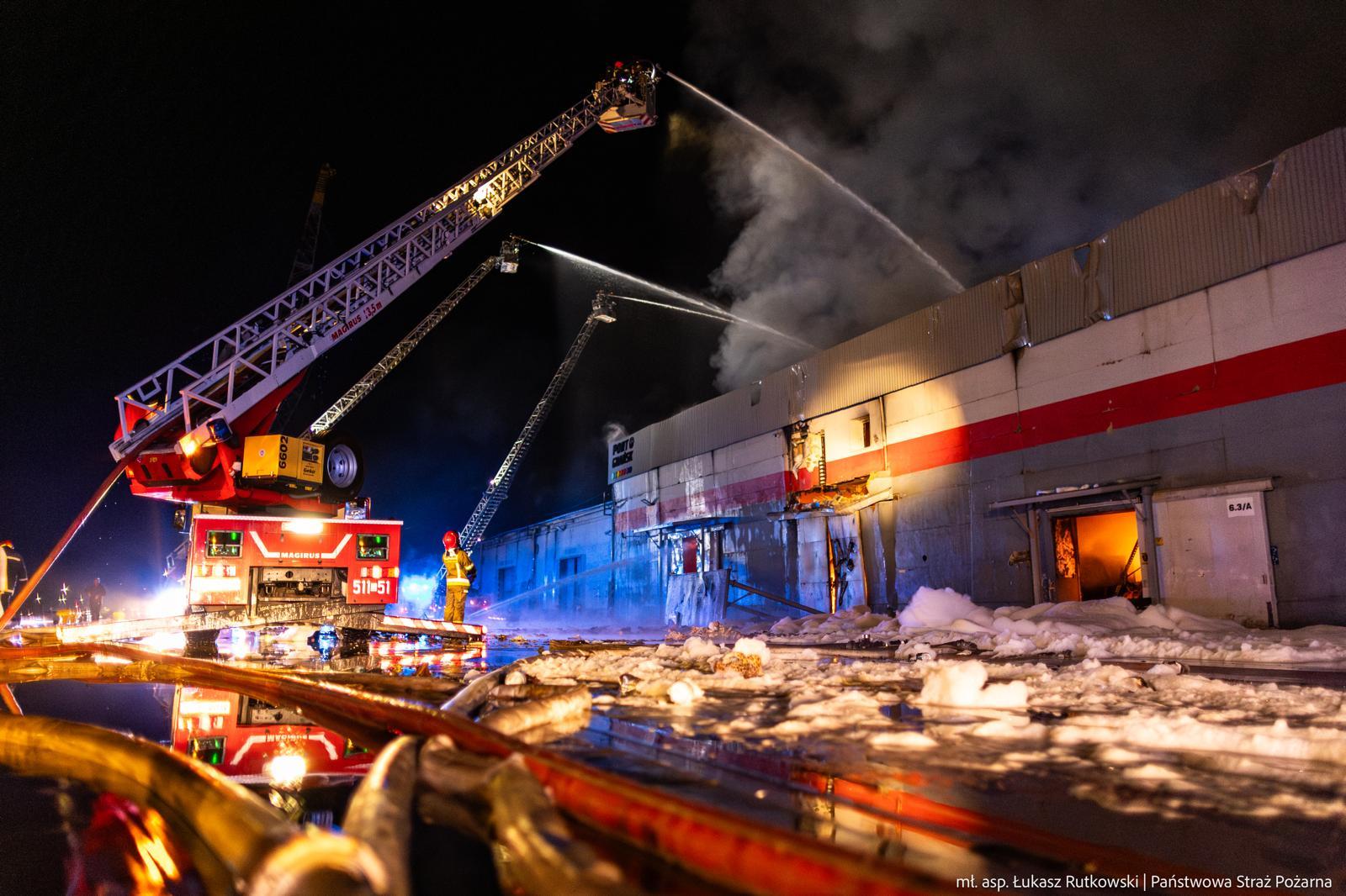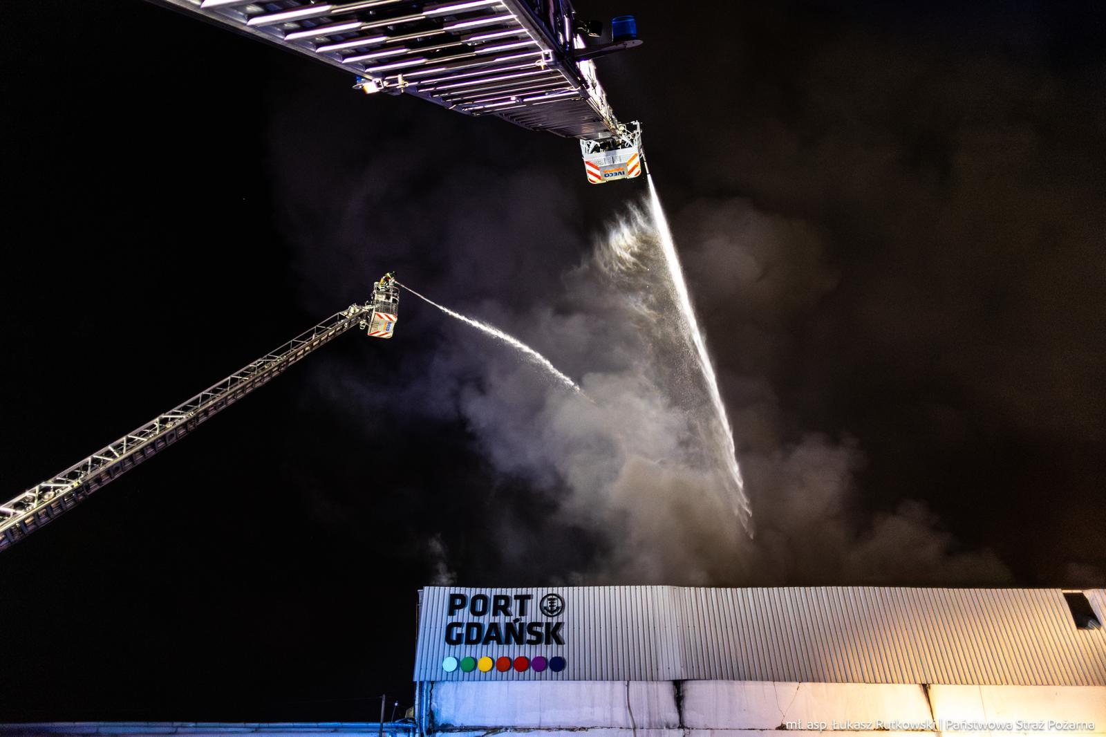 14 lipca przed godz. 17, przyjęliśmy zgłoszenie o pożarze jednej z hal na terenie Portu Gdańskiego przy ul. Oliwskiej w dzielnicy Nowy Port. Początkowo pożarem objęta była cześć hali magazynowej o pow. 400 m kw. Niestety ogień, w wyniku dużej ilości nagromadzonego materiału palnego w postaci m.in. tworzyw sztucznych, tekstyliów i cieczy łatwopalnych, szybko się rozprzestrzenił i łącznie objął swoim zasięgiem powierzchnię około 6500 m kw. hali. W wyniku prowadzonych działań, udało się uchronić przed rozwojem pożaru dwie bezpośrednio sąsiadujące hale o łącznej powierzchni ponad 10000 m kw. Na miejsce w pierwszym etapie działań, zadysponowano zastępy z JRG 1, 2 i 4 KM PSP w Gdansku, zastępy i jednostki pływające z Portowej Straży Pożarnej Florian oraz oficera operacyjnego KM PSP w Gdańsku.