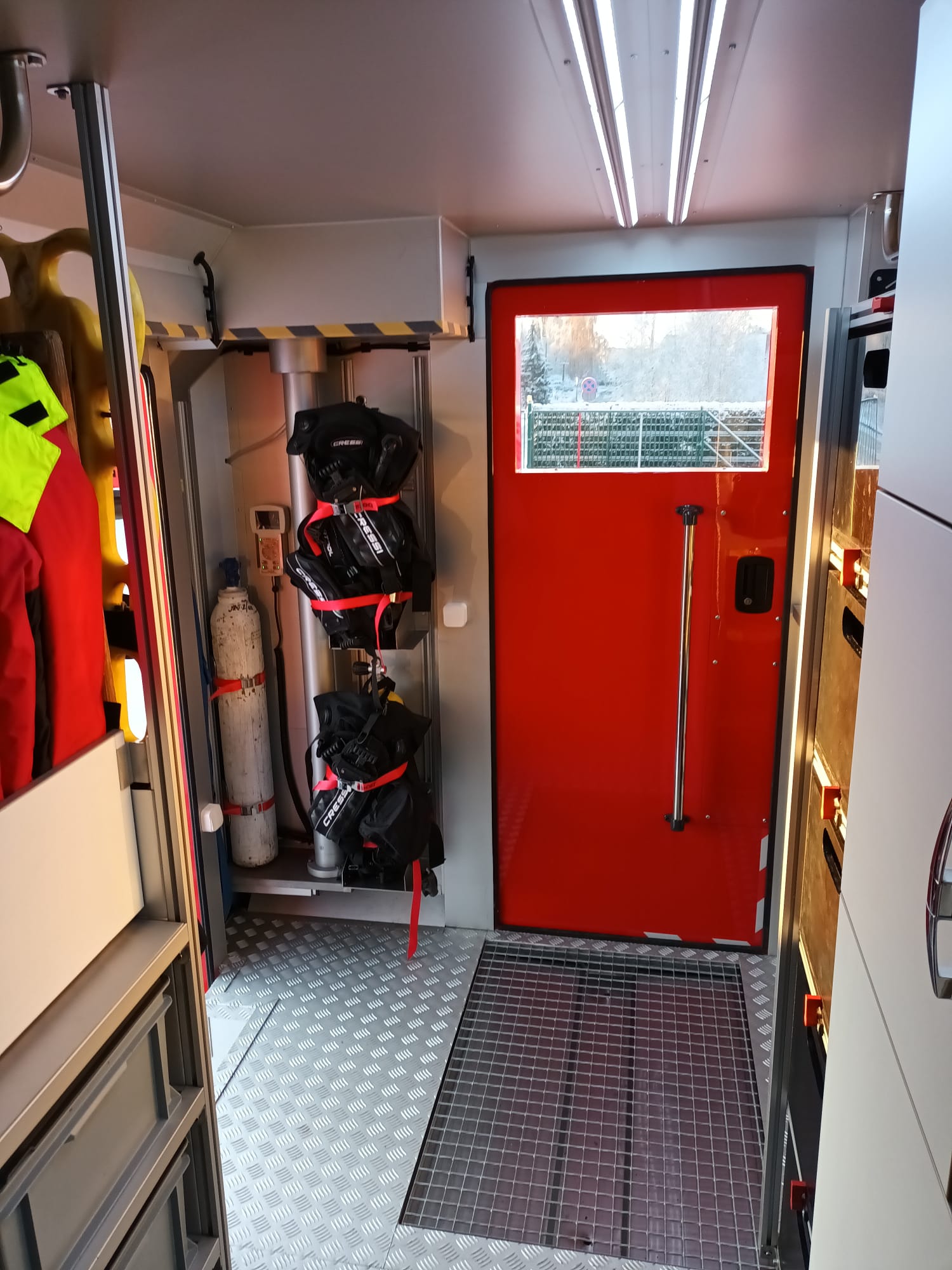 Zabudowa pojazdu została podzielona na przedział załogi dla czterech osób oraz przedział sprzętowy. Z tyłu zamontowano windę załadowczą. Na wyposażeniu znajdują się takie elementy jak: agregat prądotwórczy, sprężarka powietrza, robot podwodny ROV, kamera termowizyjna, latarki kątowe, linki, skafandry suche techniczne do ratownictwa wodnego, kamizelki asekuracyjne, trójnóg ewakuacyjny, zestawy szakli i zawiesi, przedłużacze itp.