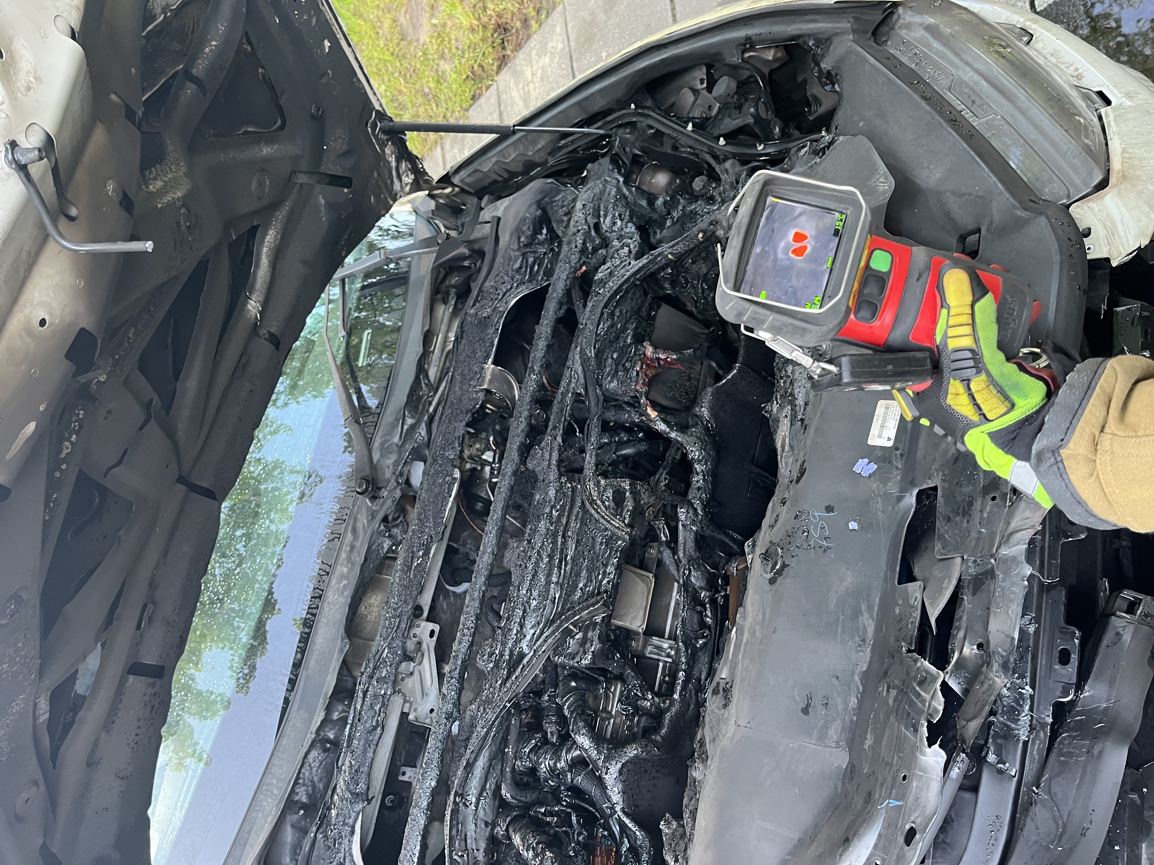 Po ok. 1,5 godziny podawania wody zweryfikowano temperaturę obudowy baterii przy użyciu kamery temowizyjnej - nie stwierdzono podwyższonych wartości. Działania zabezpieczające i kontrolę prowadzono kolejne 3 godziny. Ugaszony pojazd został przemieszczony z wykorzystaniem rolek w miejsce bezpieczne, oddalone od budynku i innych pojazdów - poza obręb stacji paliw.