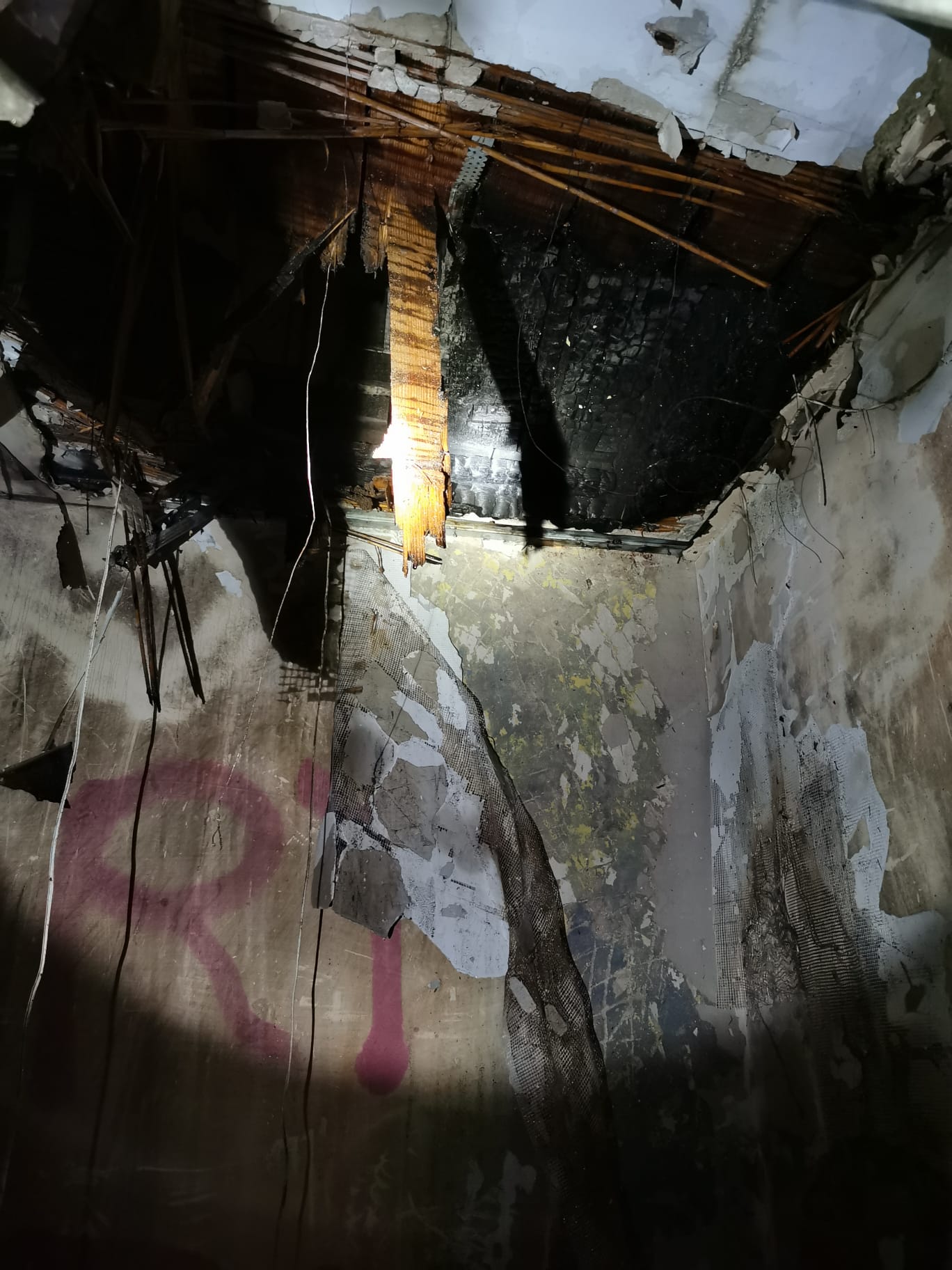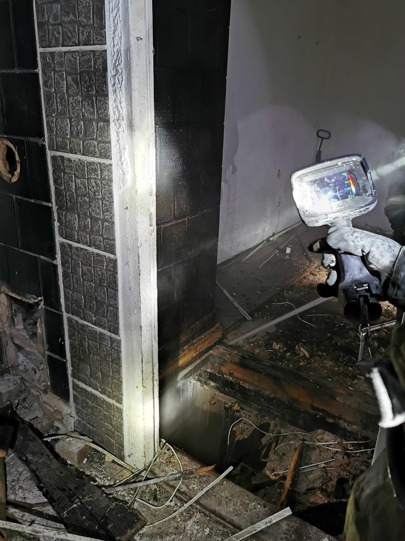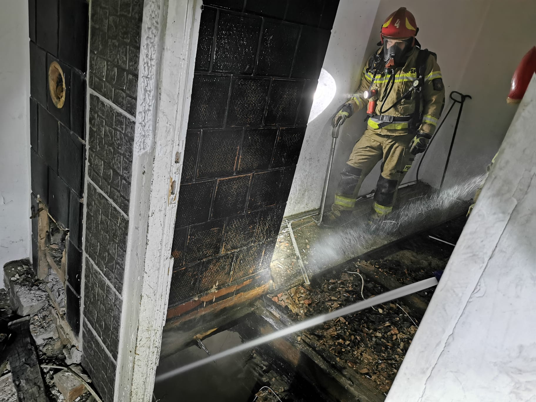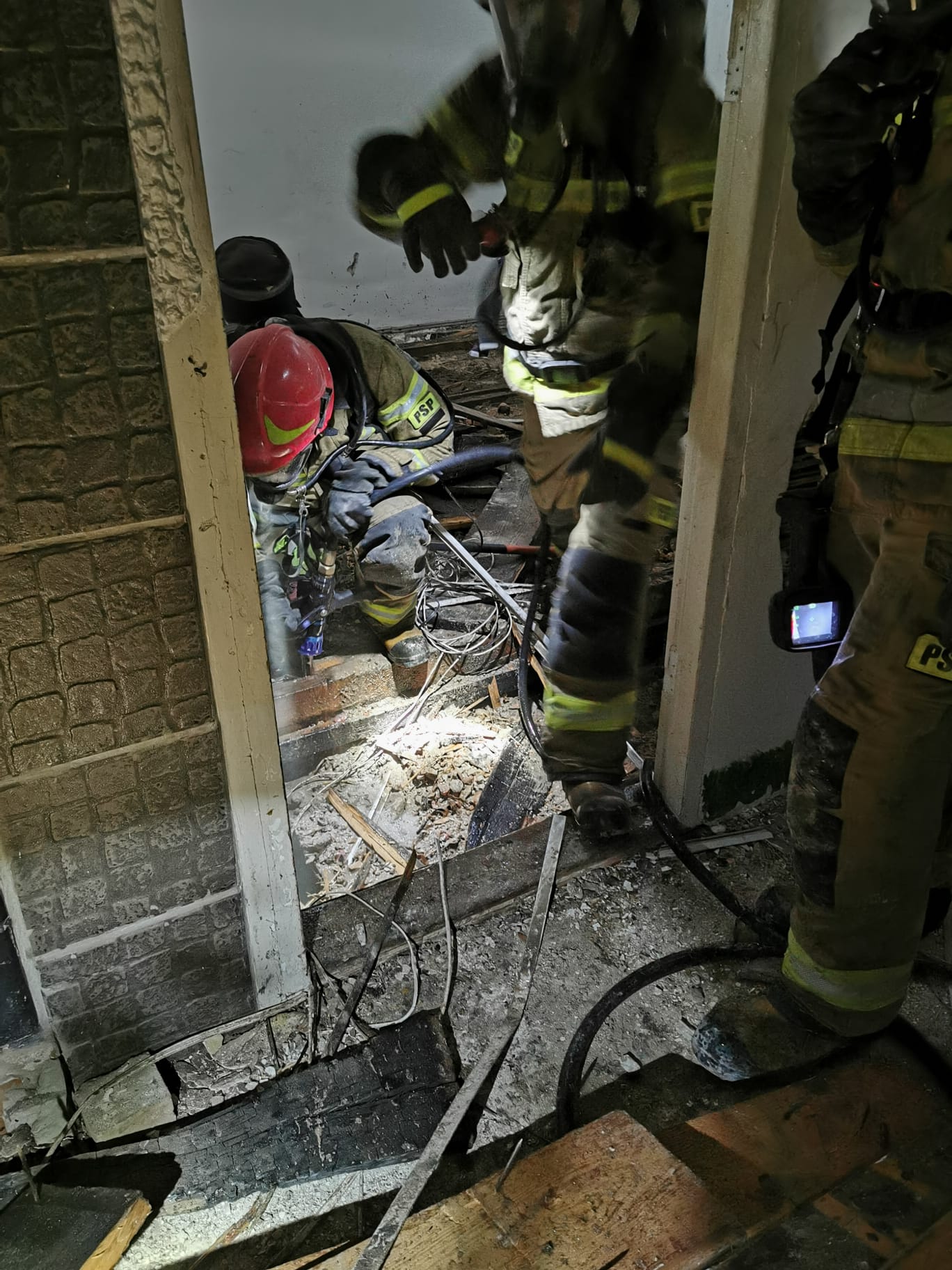 Przybyłe na miejsce zdarzenia zastępy potwierdziły informację, że z okien pustostanu pod wskazanym adresem wydobywa się dym. Do budynku wprowadzono ratowników zabezpieczonych za pomocą aparatów OUO z jednym prądem wody. Na II piętrze zlokalizowano niewielkie ognisko palących się śmieci. Po ugaszeniu pożaru, pogorzelisko sprawdzono za pomocą kamery termowizyjnej i zaobserwowano wysoką temperaturę w stropie pomieszczenia (400st. C). Dalsze działania strażaków polegały na rozebraniu podłogi w pomieszczeniu na III piętrze oraz ugaszeniu wszystkich zarzewi pożaru.