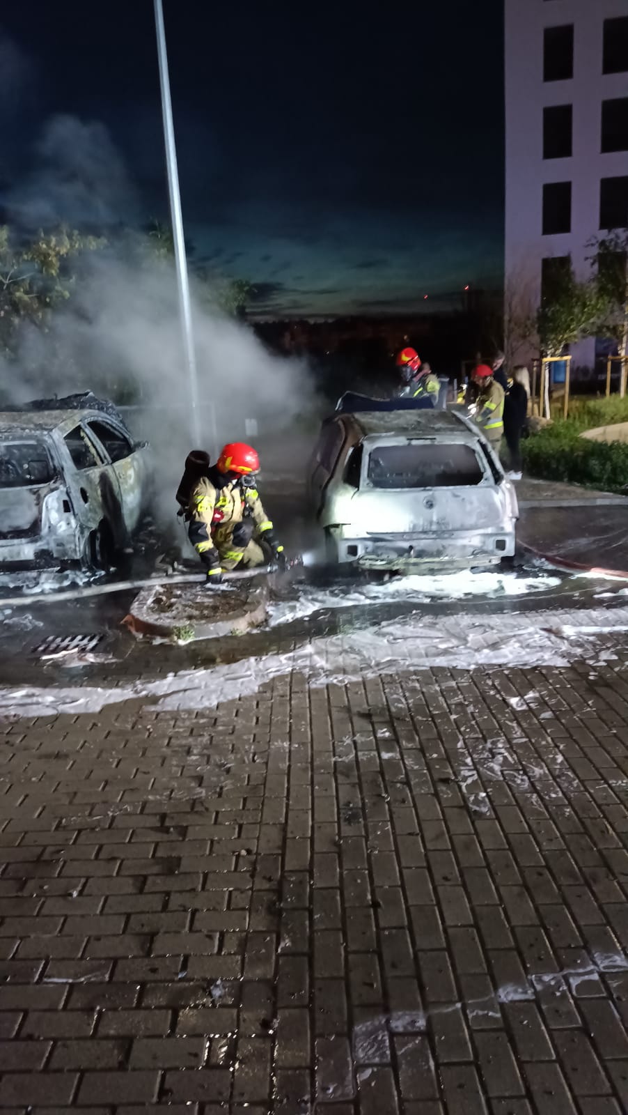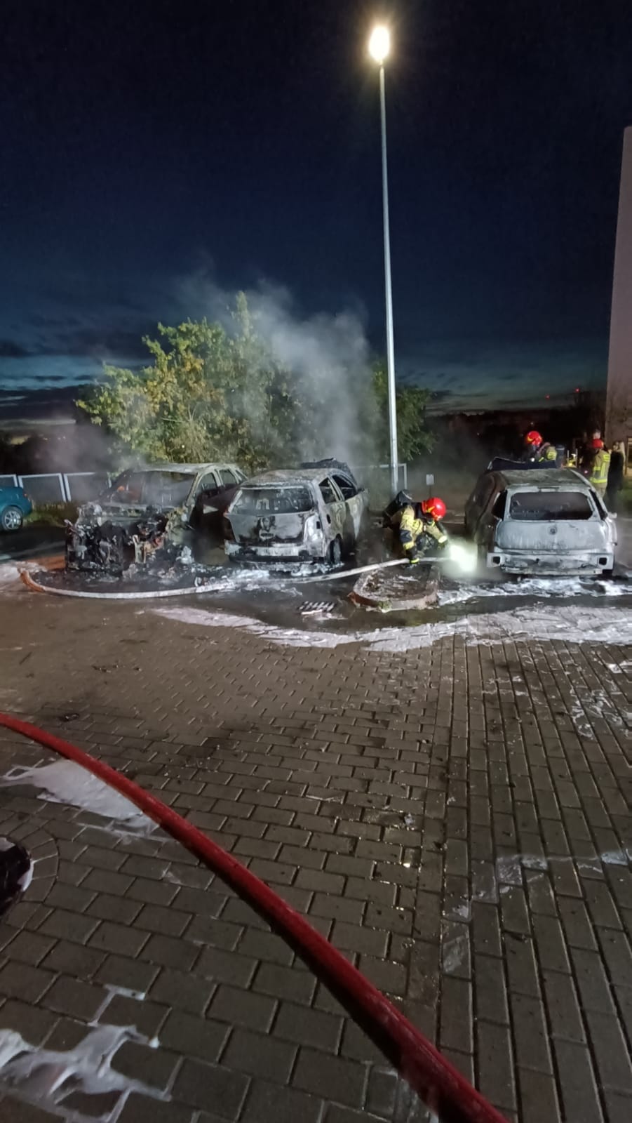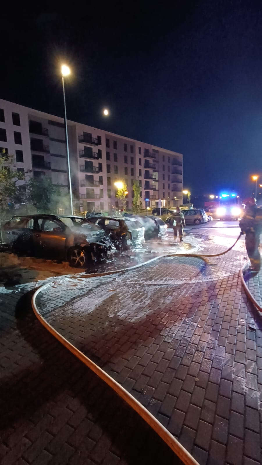Z kolei w nocy z 8 na 9 lipca gasiliśmy rozwinięty pożar 3 samochodów osobowych na parkingu przy ul.Ptasiej 41. Ogień objął 3 pojazdy, które z uwagi na intensywny rozwój pożaru, jeszcze przed przyjazdem zastępów z JRG 3, uległy spaleniu.