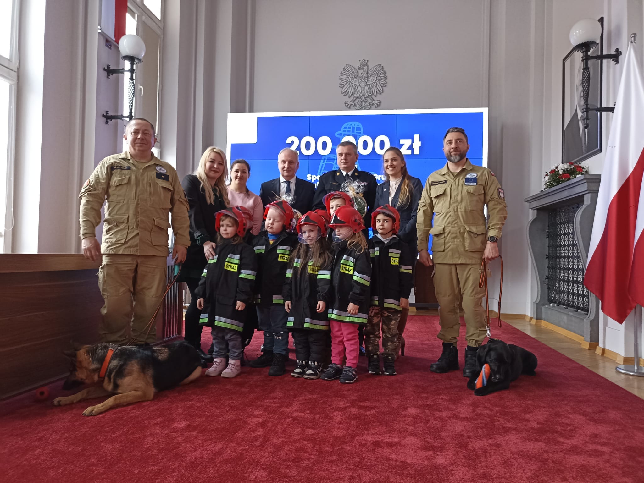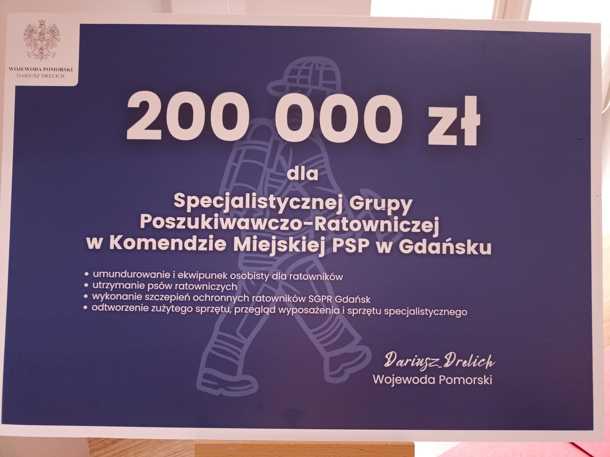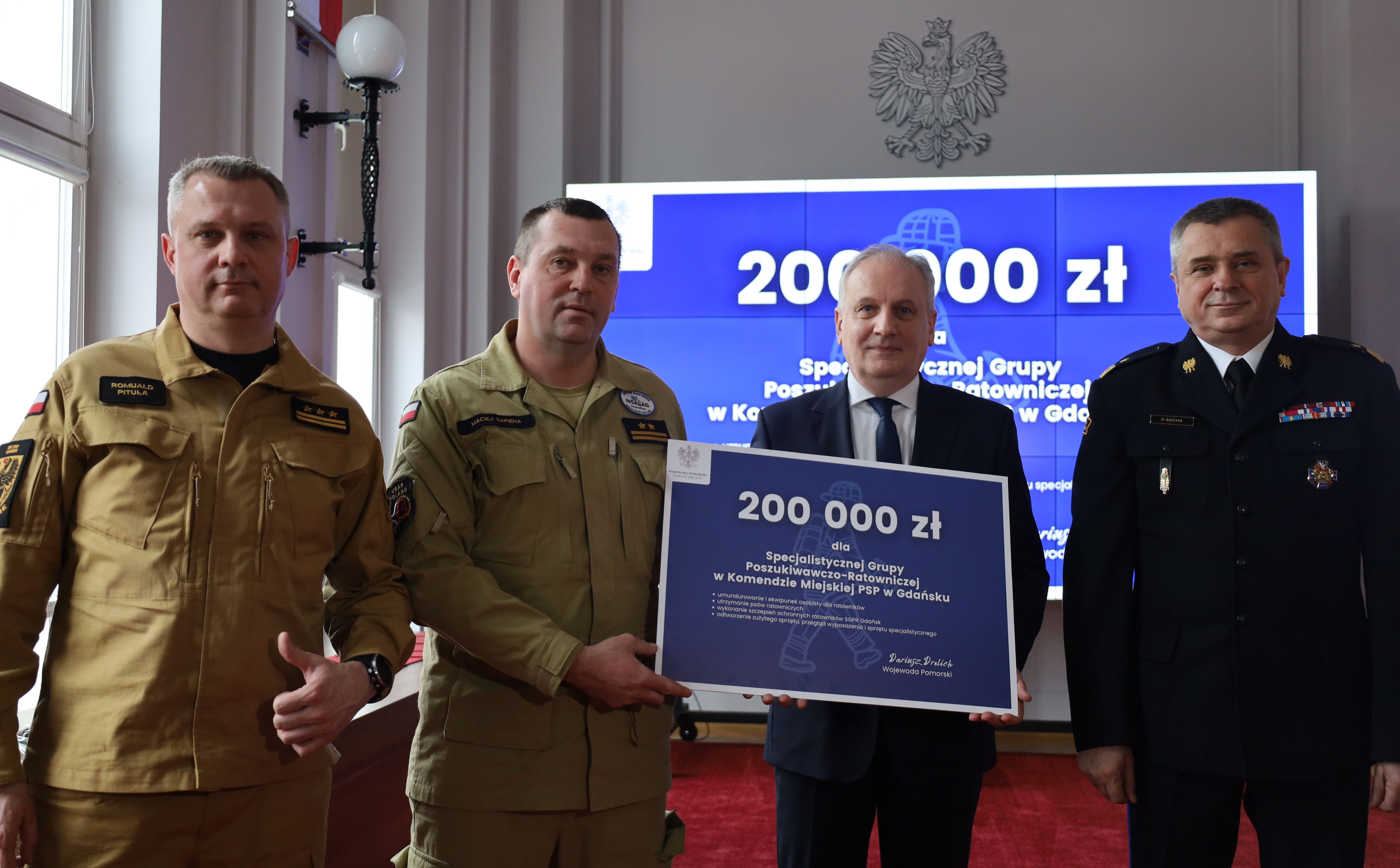 Spotkanie z ratownikami Specjalistycznej Grupy Poszukiwawczo-Ratowniczej GDAŃSK, którzy uczestniczyli w działaniach ratowniczych po trzęsieniu ziemi w Republice Turcji w ramach USAR Poland, było okazją do wręczenia czeku na 200 000 złotych.