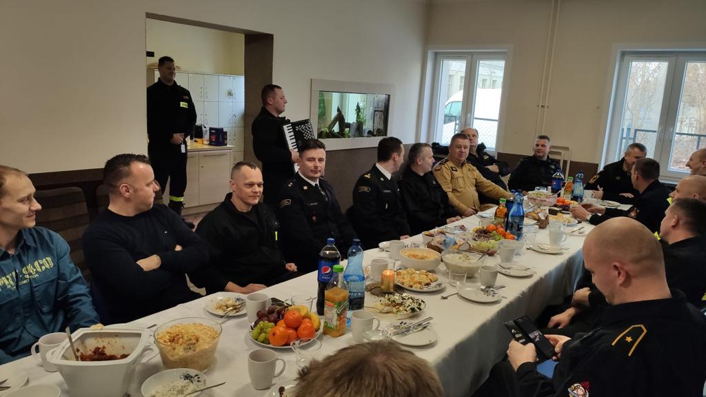 Strażacy z KM PSP w Gdańsku na czele z Komendantem Miejskim PSP st. bryg. Romualdem Pitułą mieli okazję do podzielenia się opłatkiem, rozmowy o bieżących sprawach i planach na nowy rok, a także do wspólnego odśpiewania kolęd przy dźwiękach akordeonu