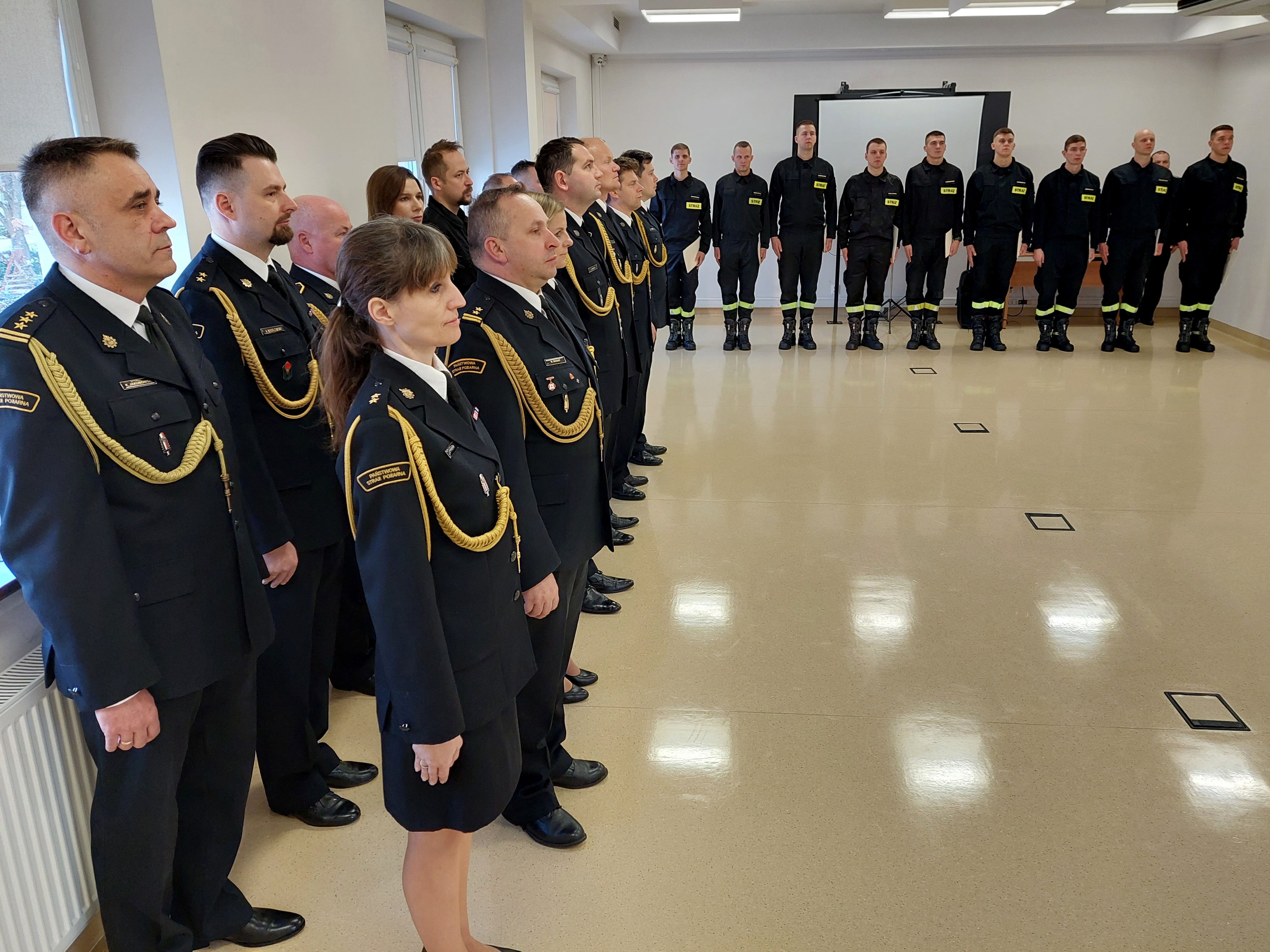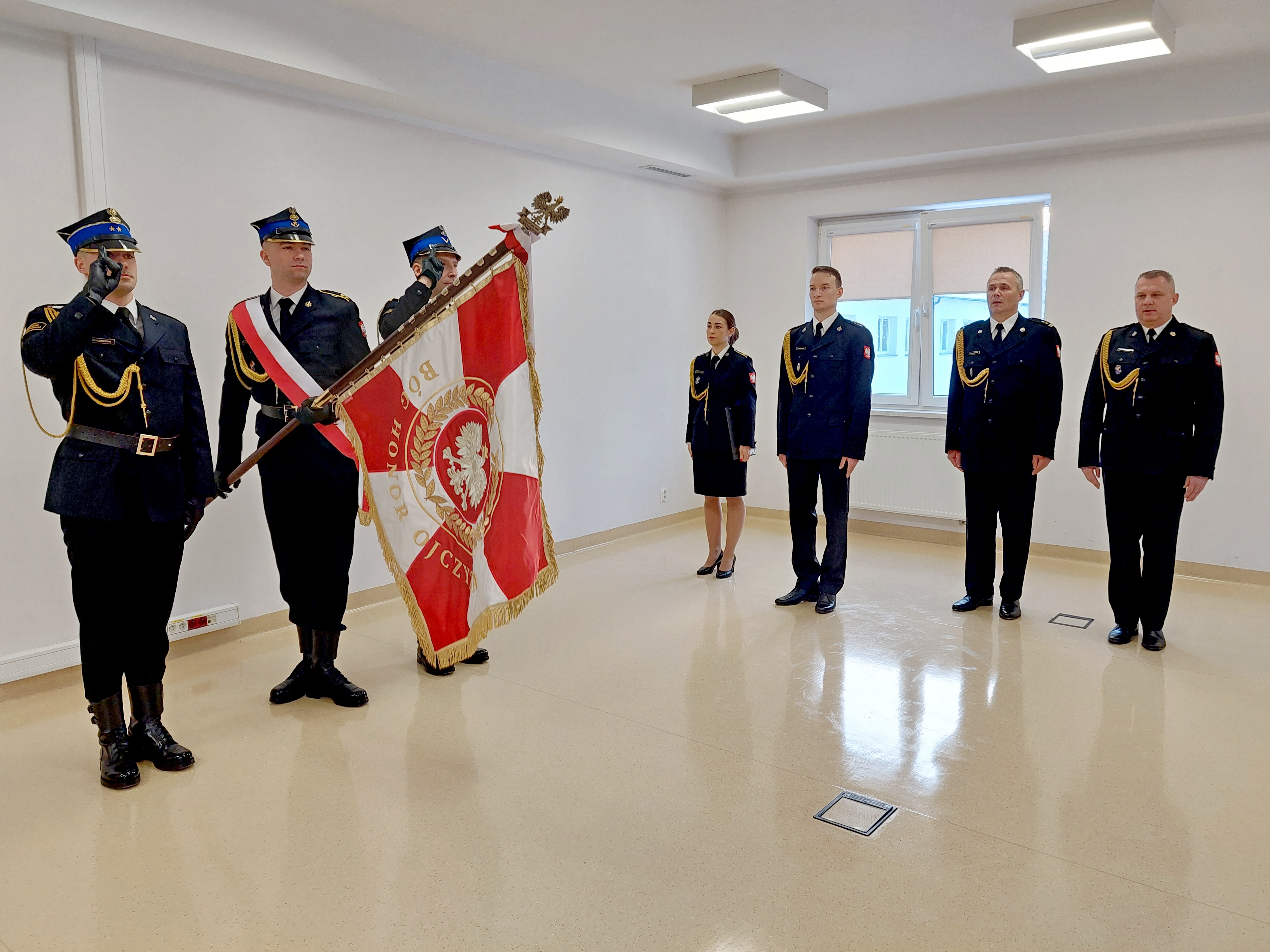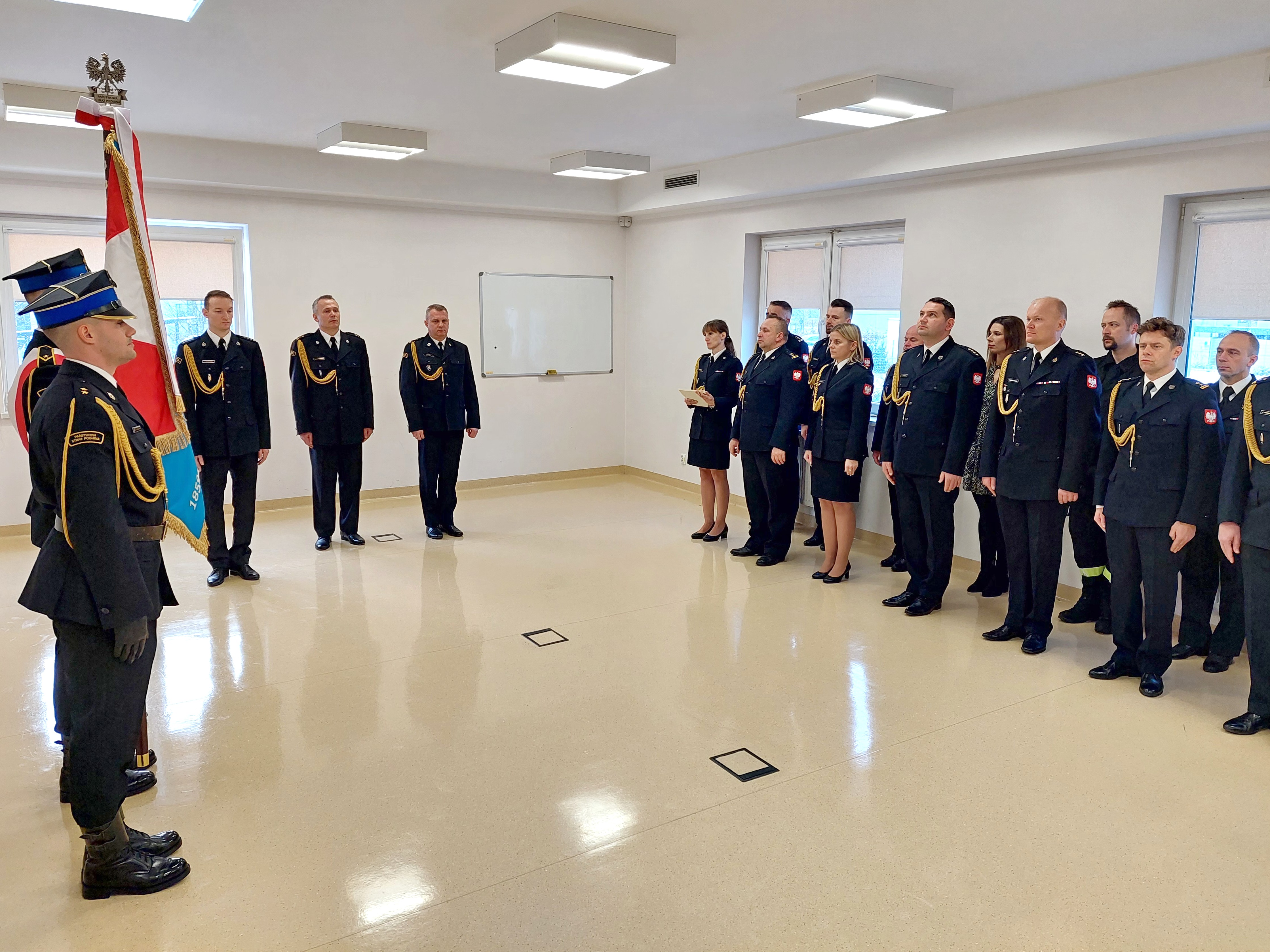 Po wprowadzeniu sztandaru odegrano Hymn Państwowy. Następnie 9 funkcjonariuszom wręczono awanse na stopień starszego strażaka.