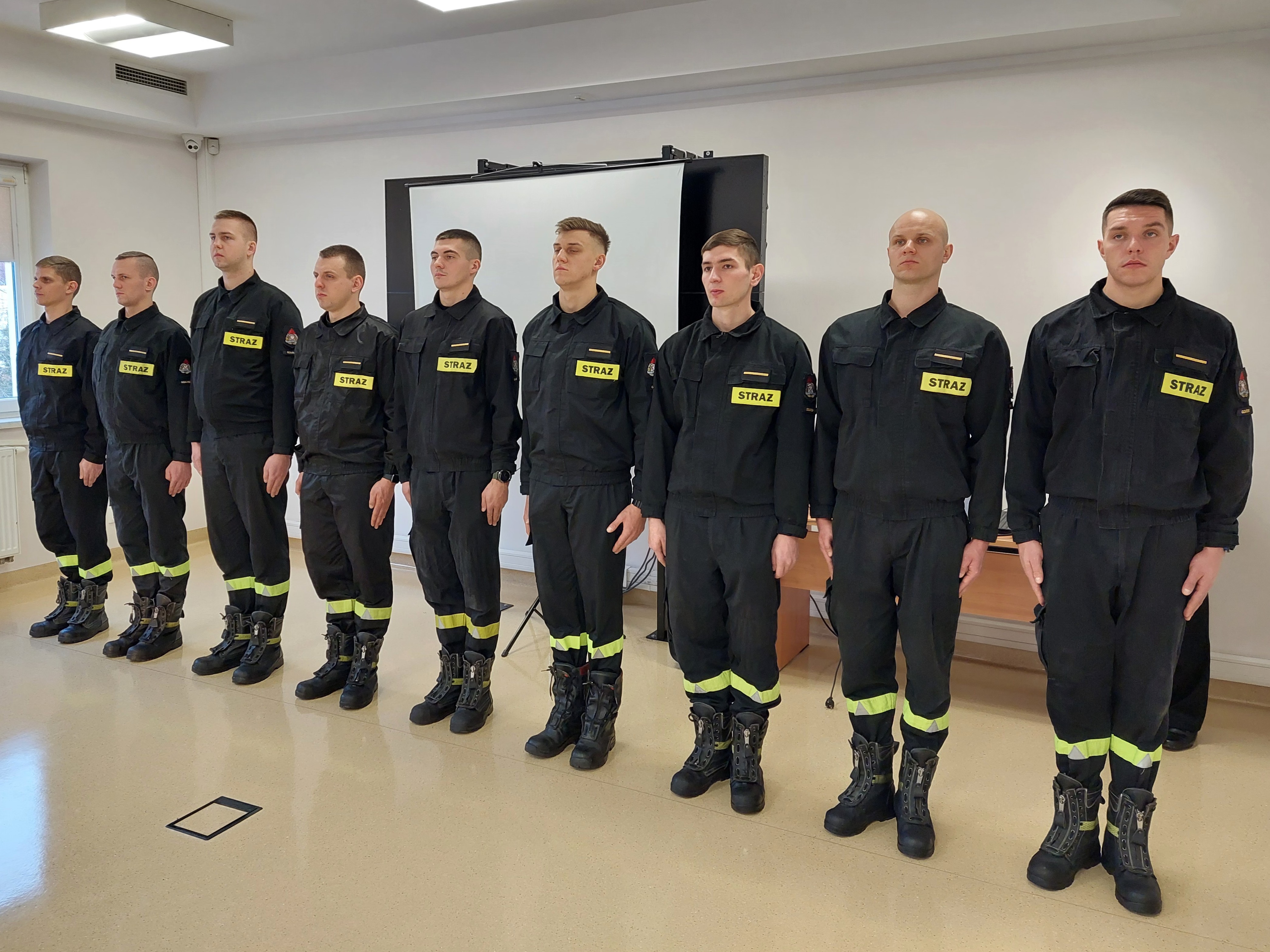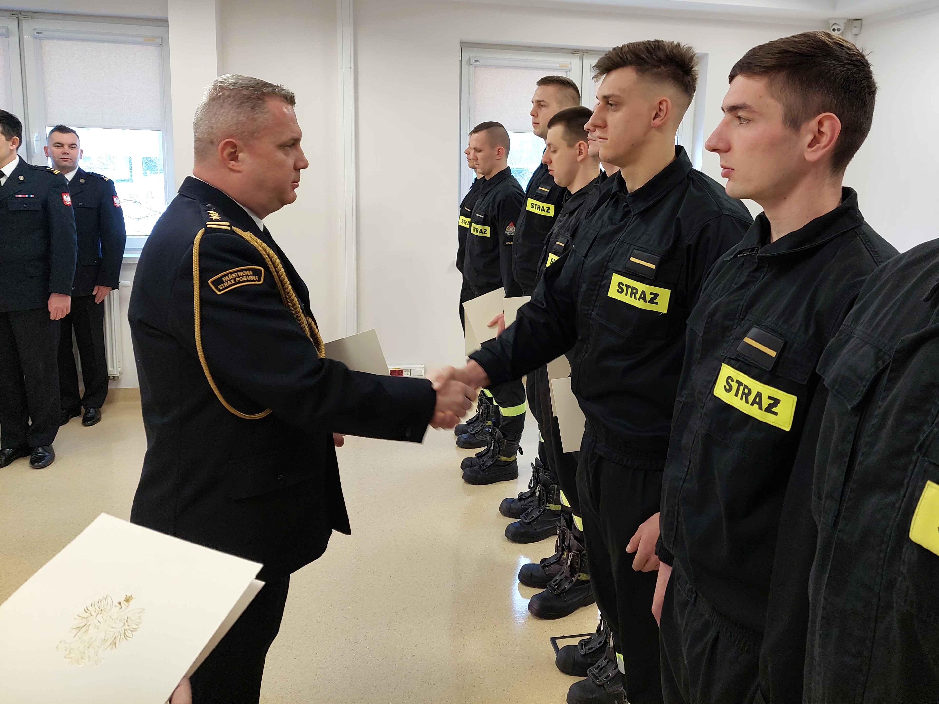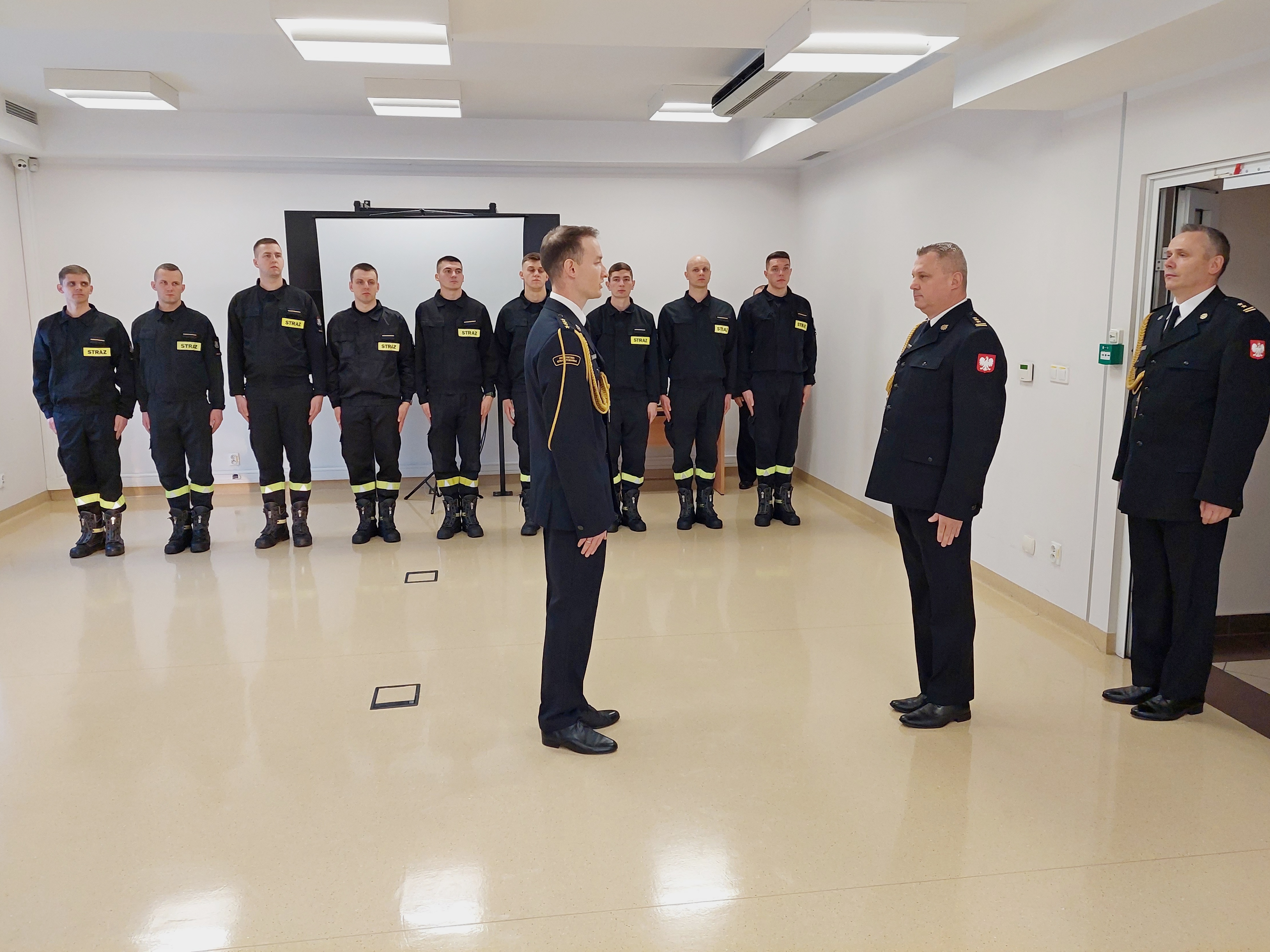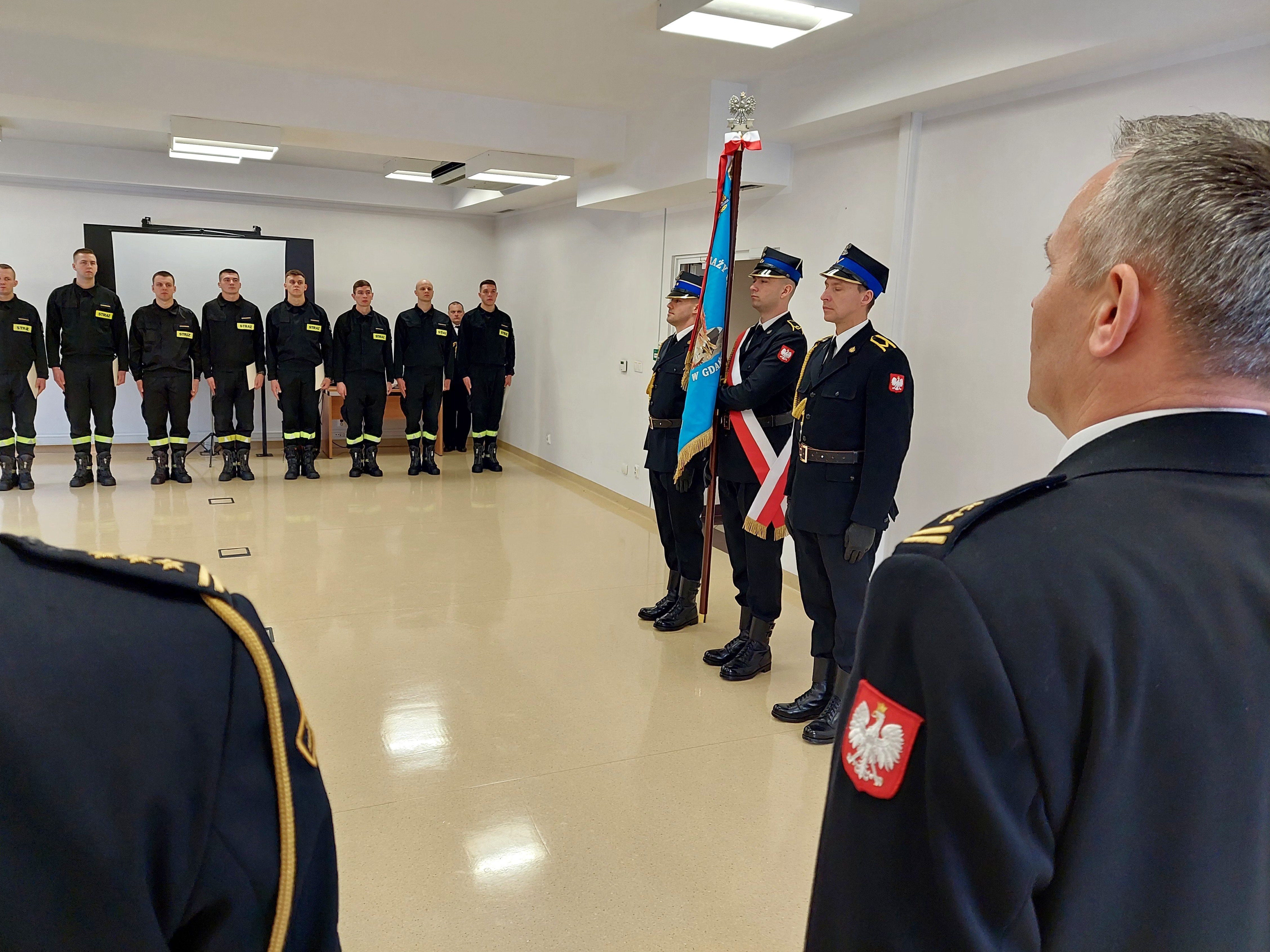 Po wprowadzeniu sztandaru odegrano Hymn Państwowy. Następnie 9 funkcjonariuszom wręczono awanse na stopień starszego strażaka.