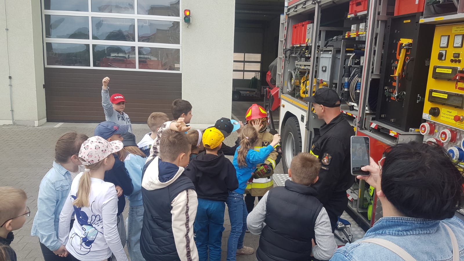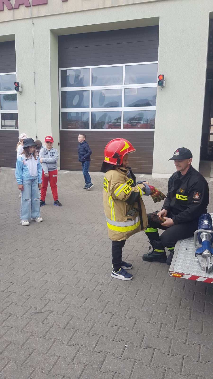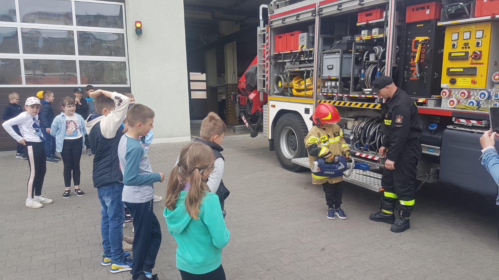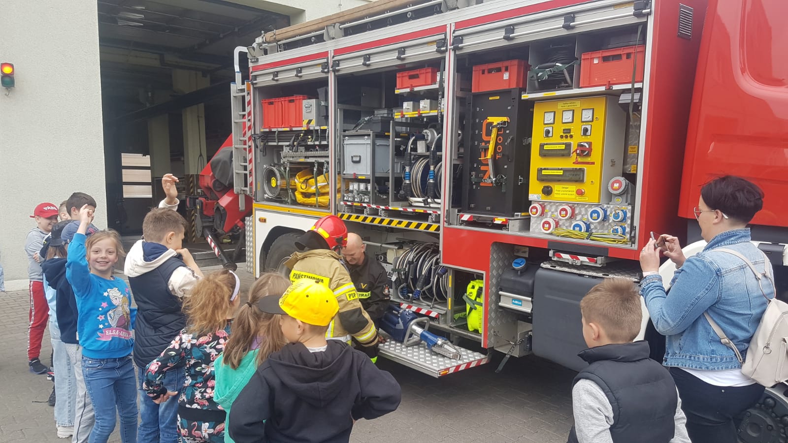 Strażacy zaprezentowali również wyposażenie wozów strażackich oraz sprzętu ratowniczego będącego na wyposażeniu JRG. Przez chwile dzieci mogły poczuć się, jak prawdziwi strażacy przymierzając hełm, wsiadając do wozu strażackiego oraz podając prąd wody pod nadzorem funkcjonariuszy PSP.