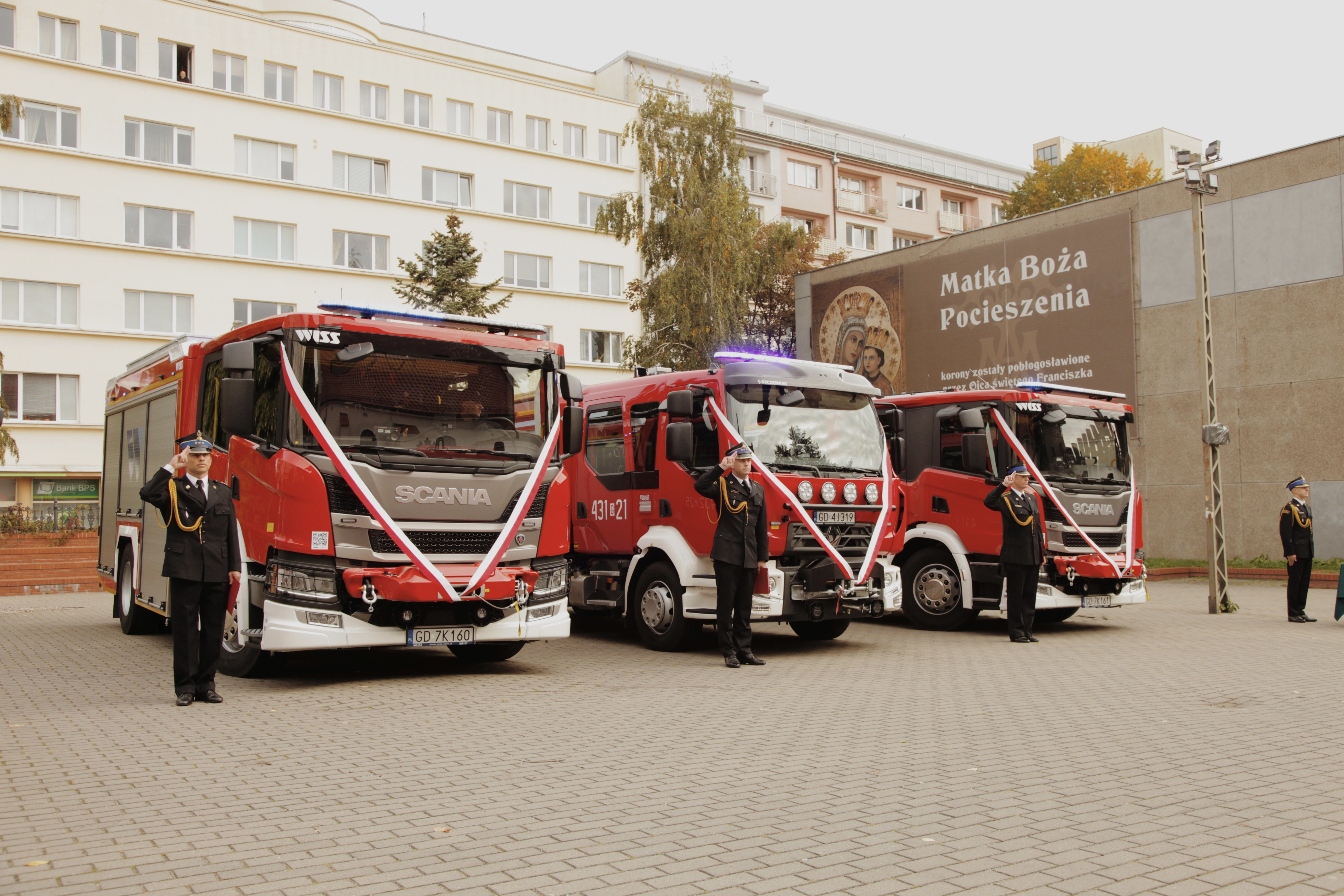 Kolejnym punktem uroczystości było oficjalne przekazanie i poświęcenie nowych pojazdów ratowniczo – gaśniczych, które odbyło się na placu przed Bazyliką. Uroczystego aktu przekazania kluczyków do nowych pojazdów dokonał Pan Marcin Horała – poseł na Sejm RP.