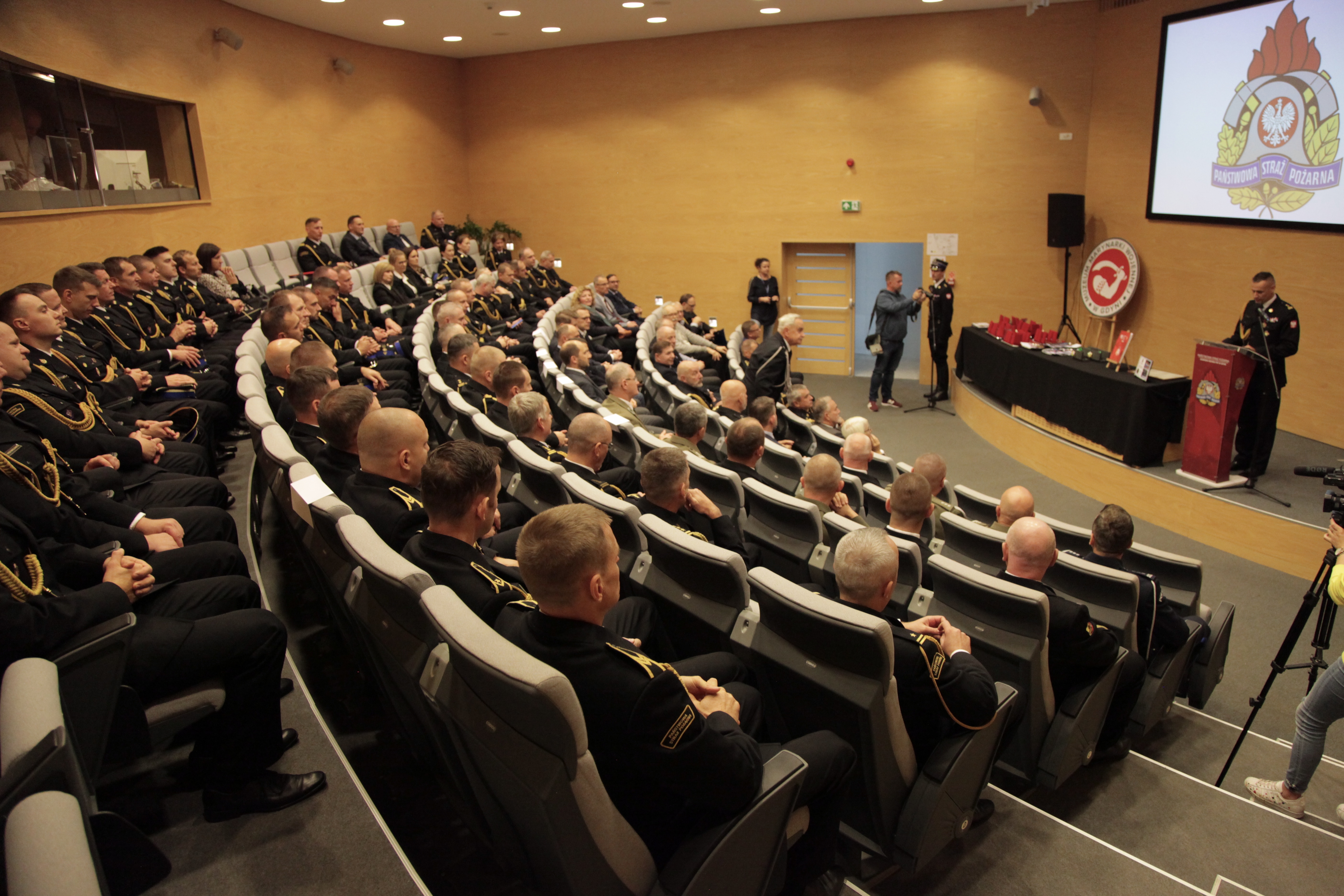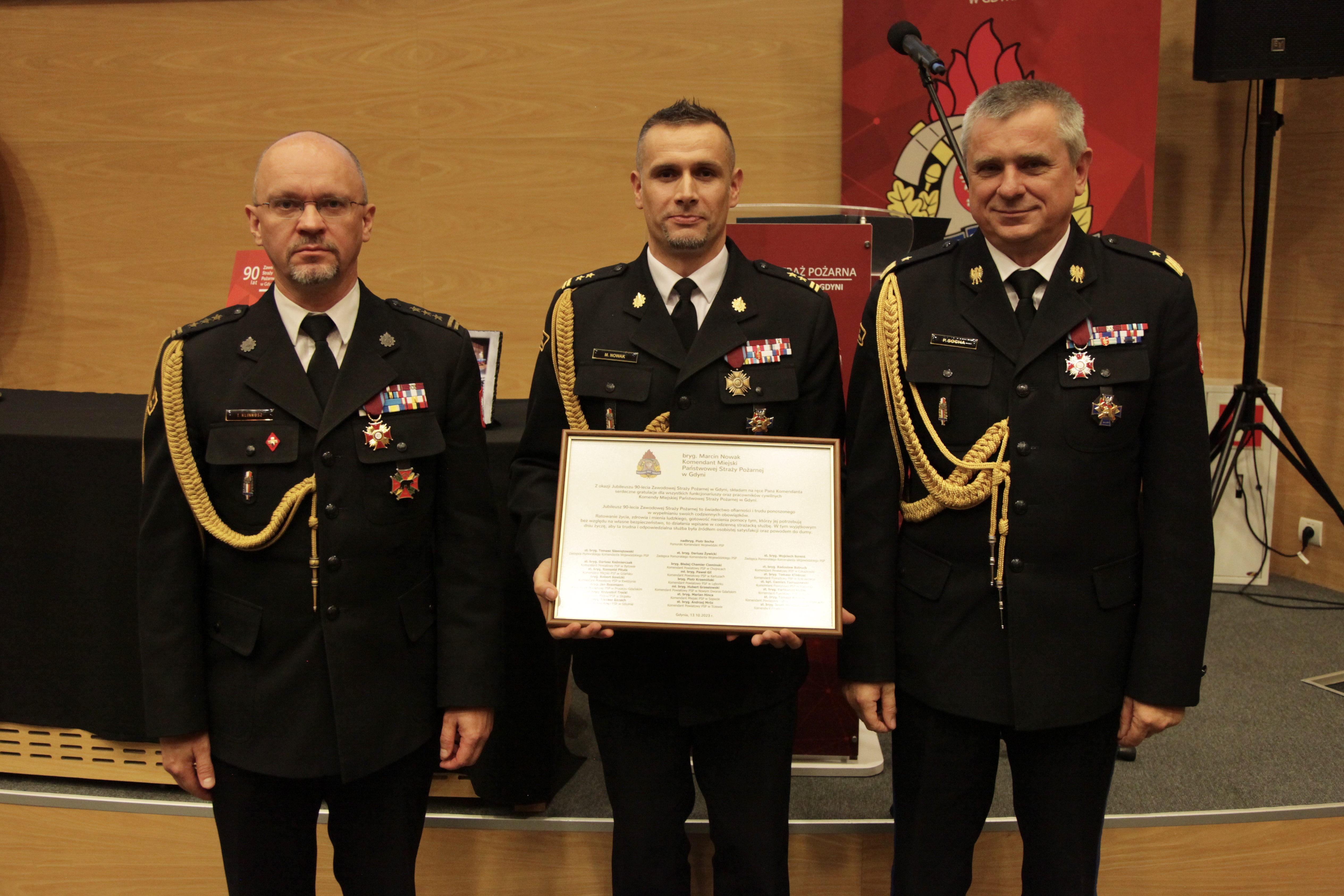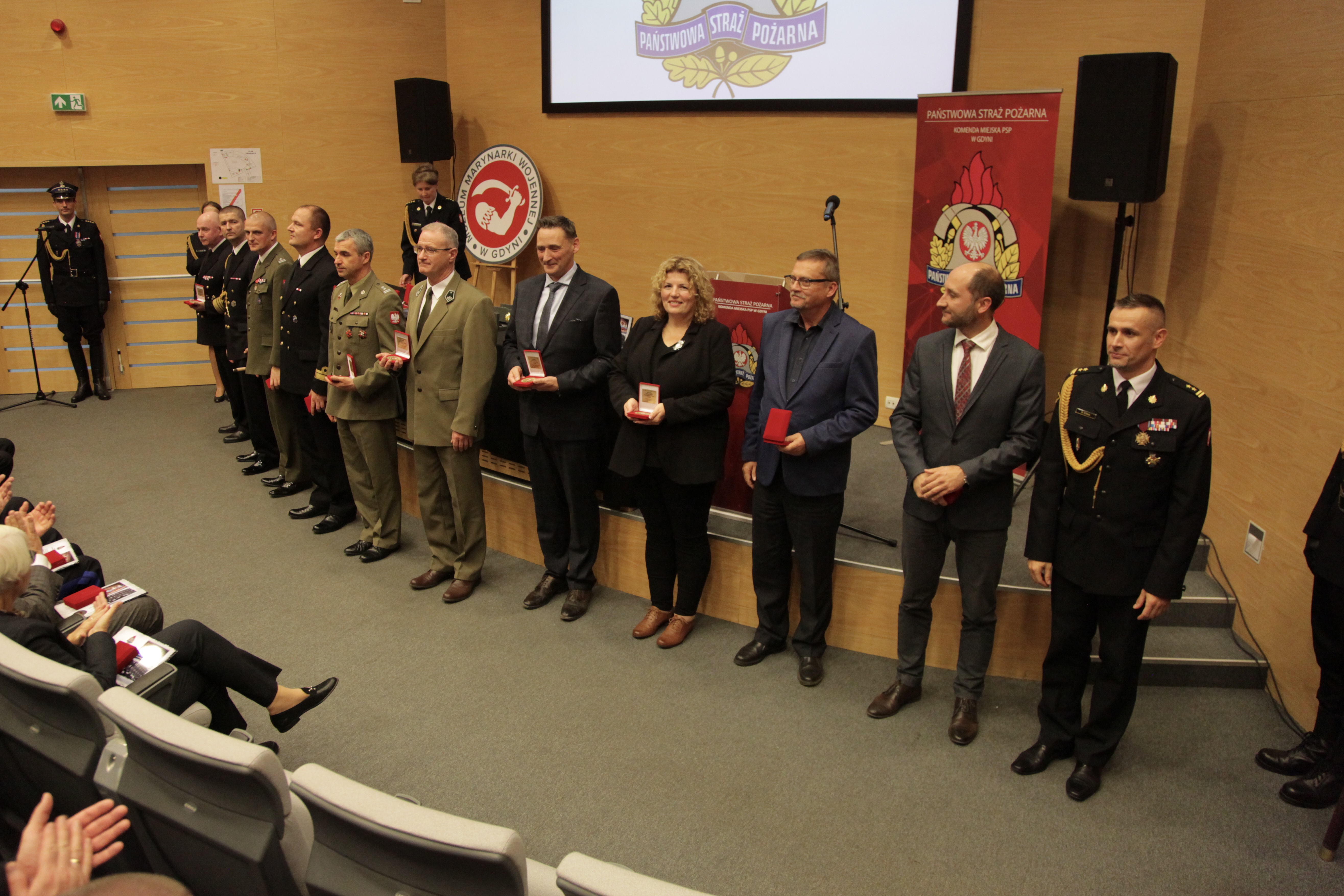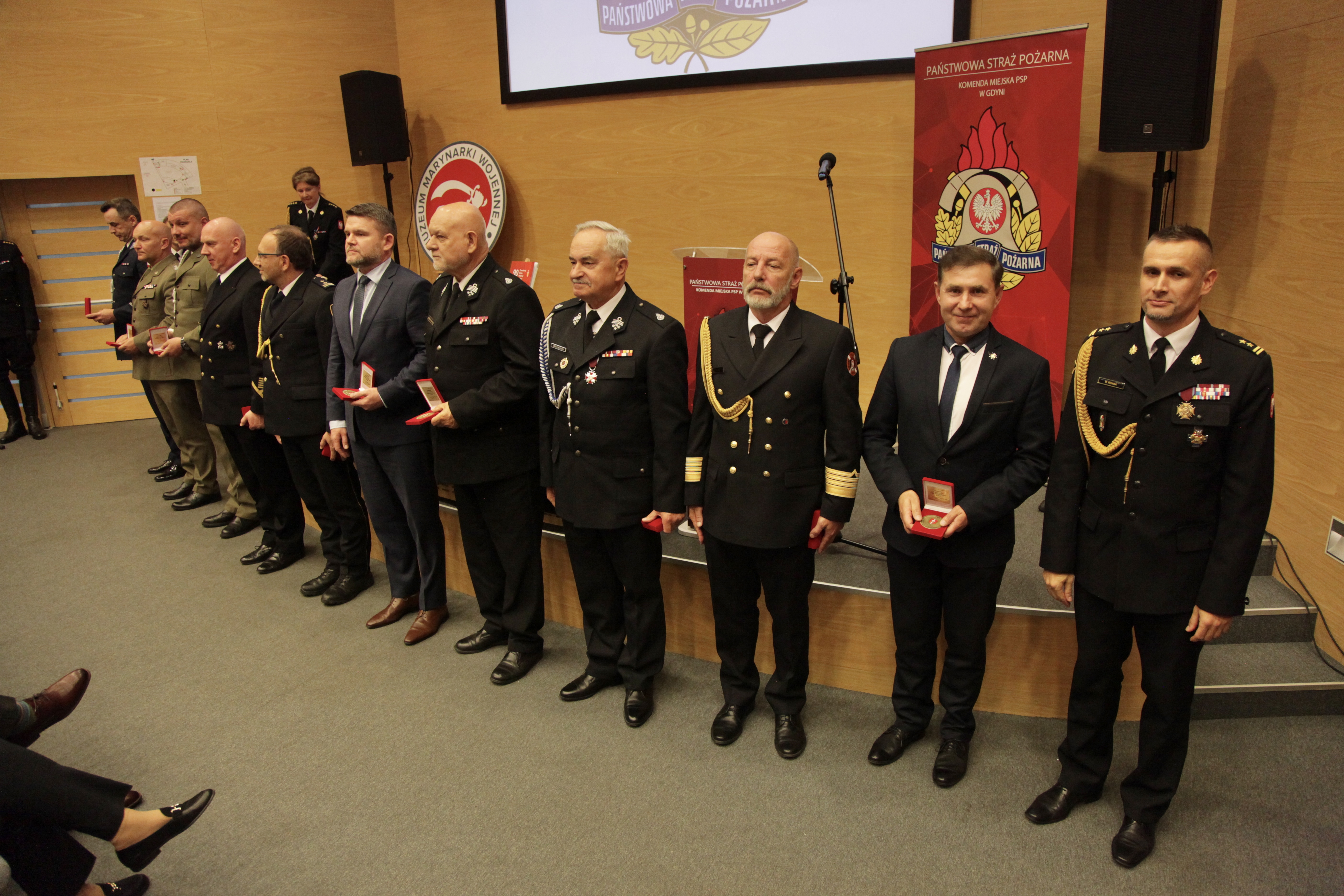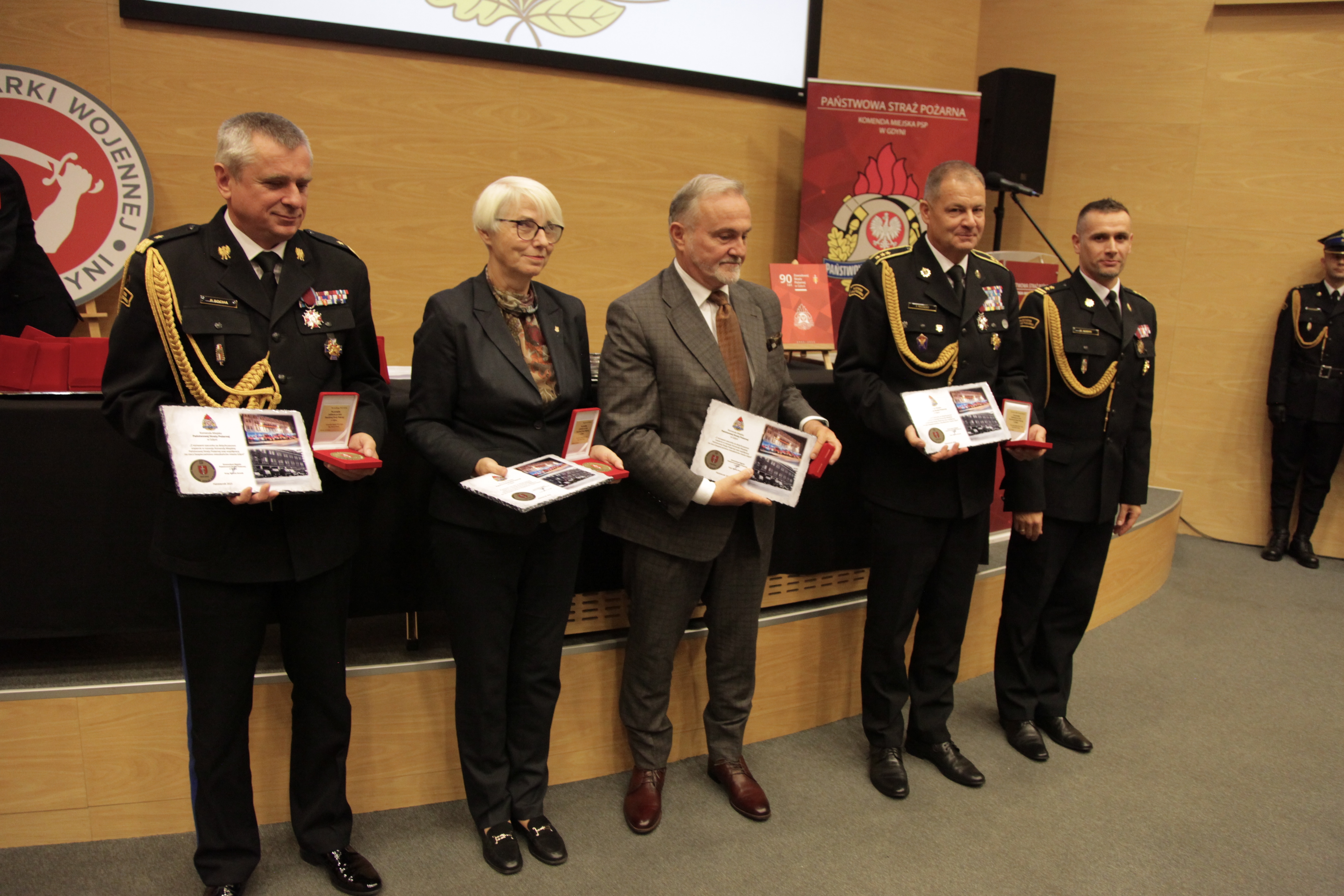 Następnie zaproszeni goście, strażacy i pracownicy Komendy Miejskiej PSP w Gdyni, wspólnie przemaszerowali do audytorium w Muzeum Marynarki Wojennej w Gdyni, gdzie odbyła się główna część obchodów. Aby właściwie uczcić strażacki jubileusz, nakręcony został film, który w wielkim skrócie, ale bardzo obrazowo przedstawił najważniejsze fakty z historii gdyńskiego pożarnictwa. Z okazji 90-tej rocznicy wydana została również okolicznościowa publikacja . Zarówno film jak i książka zostały zaprezentowane podczas naszej uroczystości. Jubileusz 90-lecia Zawodowej Straży Pożarnej w Gdyni był też wspaniałą okazją do wręczenia medali i odznaczeń zasłużonym strażakom. oraz podziękowań tym osobom, dla których tak ważne jest bezpieczeństwo naszego miasta i jego mieszkańców. Z tej okazji Komendant Miejski PSP w Gdyni bryg. Marcin Nowak wyróżnił gości honorowych okolicznościowymi tabliczkami, pamiątkowymi medalami oraz złożył podziękowania osobom, które w sposób szczególny były zaangażowane w przygotowanie i przeprowadzenie uroczystości.