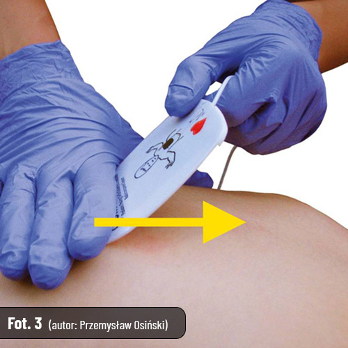- Naklejanie elektrody rozpoczynamy od jednego końca, mocno dociskając ją do klatki piersiowej, aż będzie całkowicie przylegała do ciała pacjenta (fot. 3). Metoda ta zapobiega powstawaniu pod elektrodą pęcherzy powietrznych, które zwiększają ryzyko oparzeń skóry i zmniejszają skuteczność defibrylacji. Zaleca się, aby czynności te wykonywać bez przerywania uciśnięć klatki piersiowej.