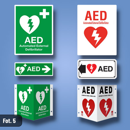Znaki te stanowią dla wszystkich wyraźną informację, że w danym miejscu znajduje się AED, a w połączeniu ze strzałkami wskazują, gdzie należy się udać, aby do niego dotrzeć.