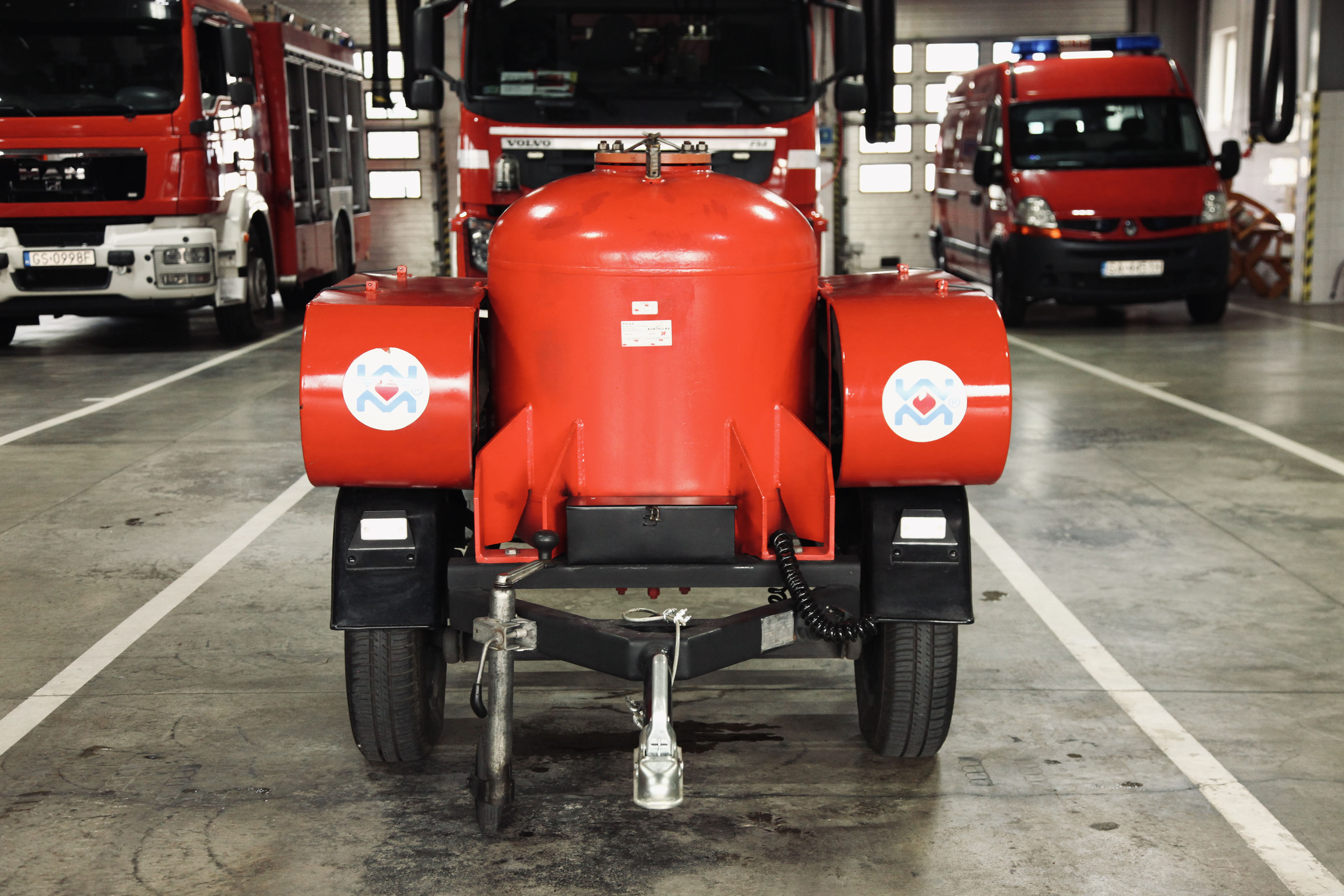 Przyczepka gaśnicza wyposażona w 250kg proszku gaśniczego przeznaczonego do gaszenia pożarów grup ABC.