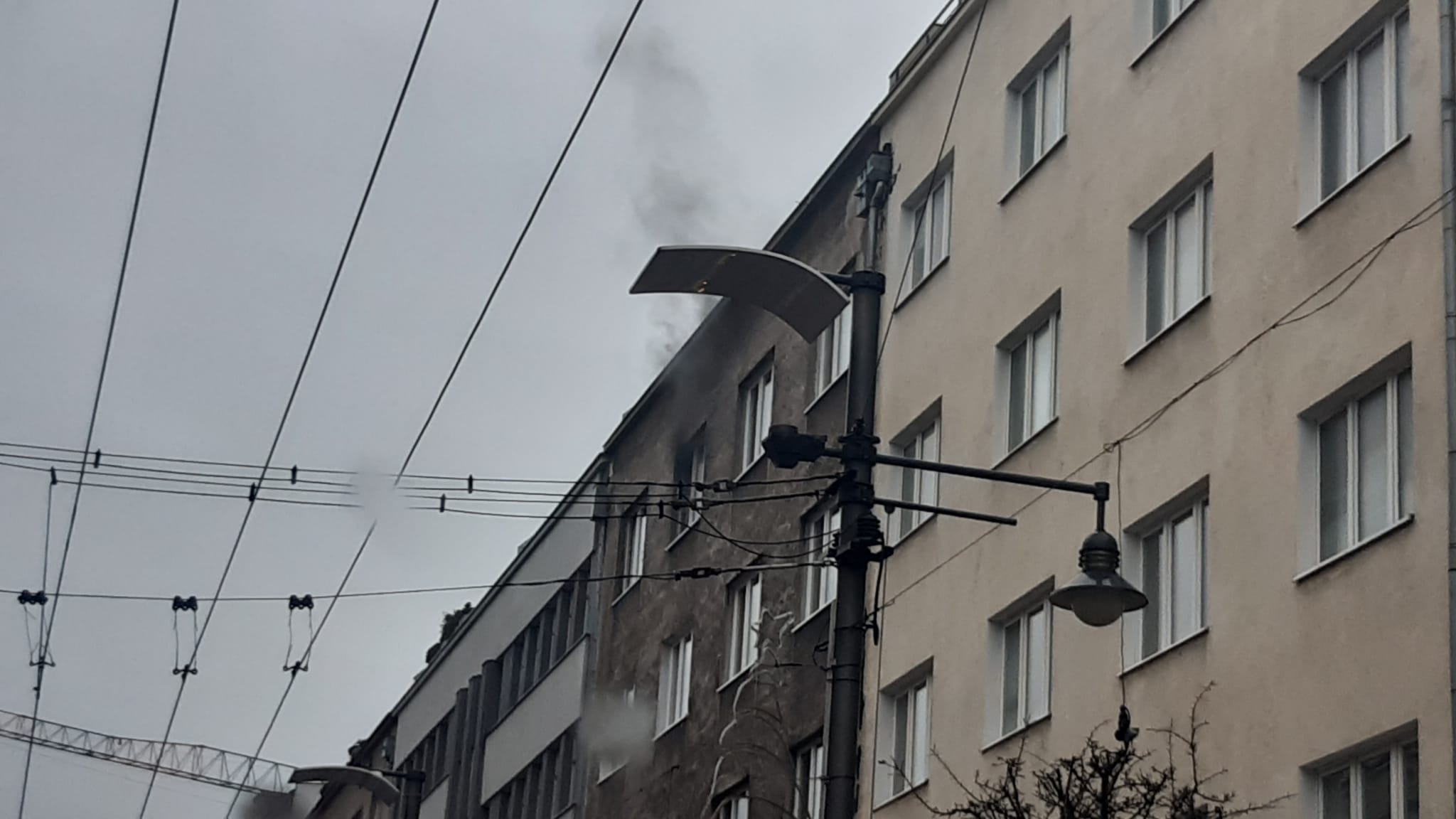 Po przybyciu na miejsce zdarzenia i przeprowadzeniu rozpoznania stwierdzono zadymienie z jednego z okien na czwartym piętrze budynku mieszkalno-usługowego.