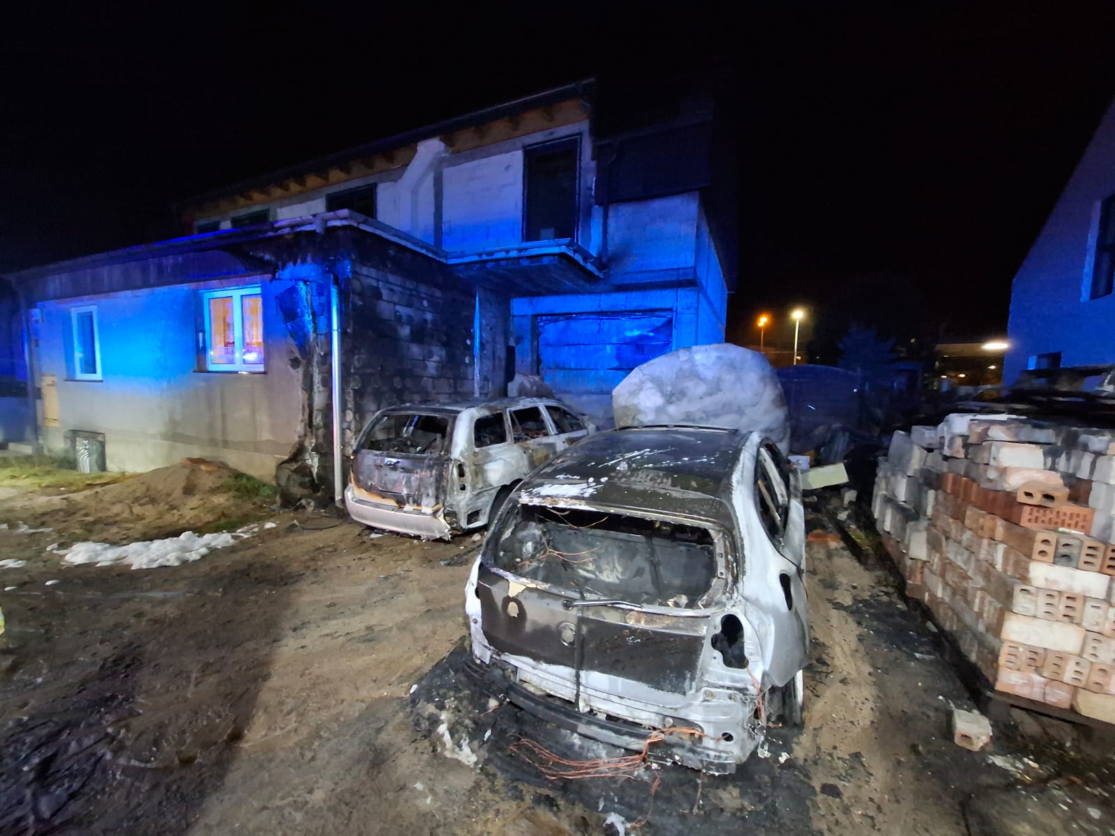 W wyniku pożaru całkowitemu spaleniu uległy dwa samochody osobowe. Uszkodzeniu uległa część elewacji budynku oraz garaż. Dalsze działania na miejscu zdarzenia prowadzili funkcjonariusze policji.