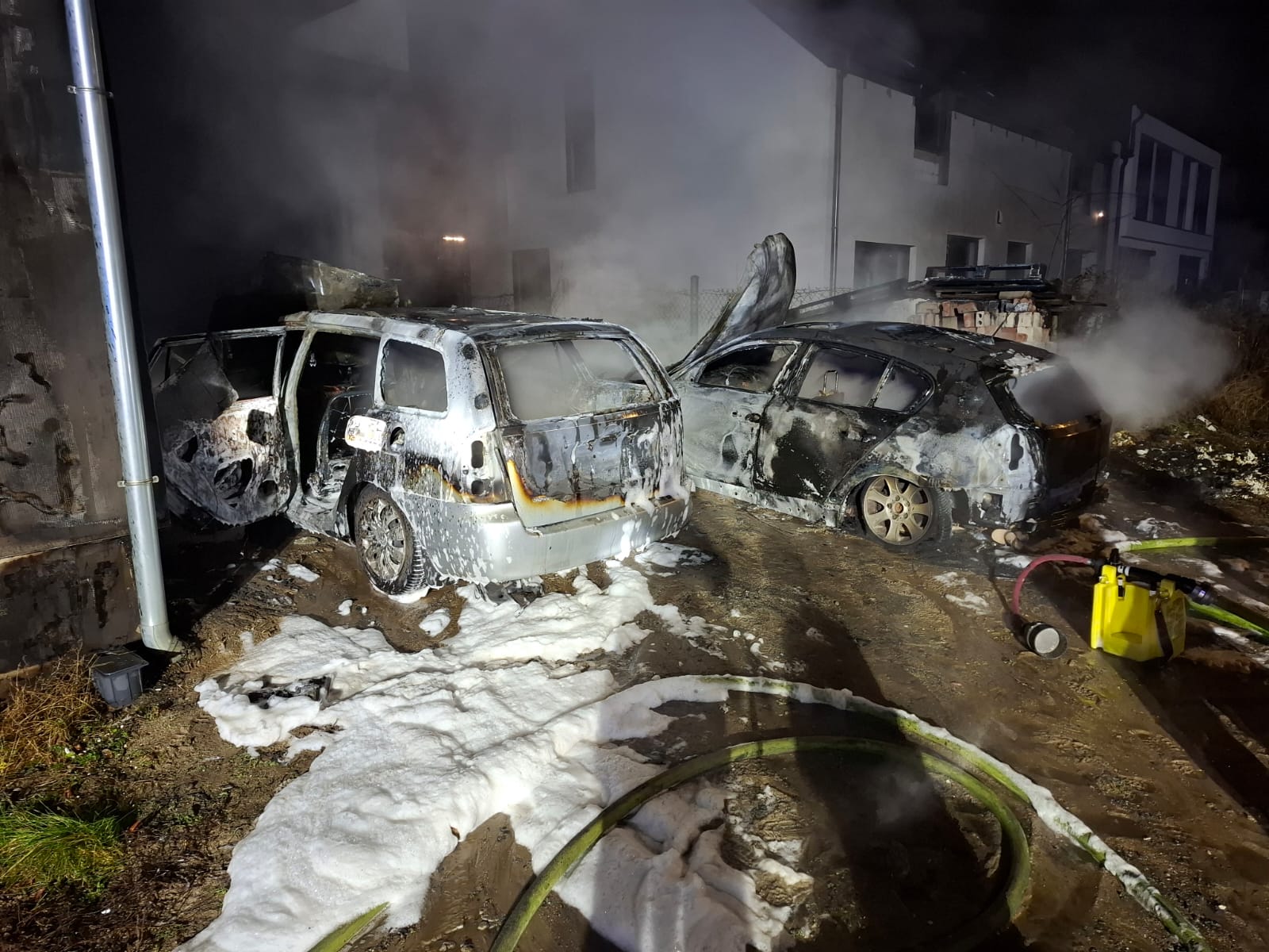 Pożar samochodów osobowych przy budynku jednorodzinnym.