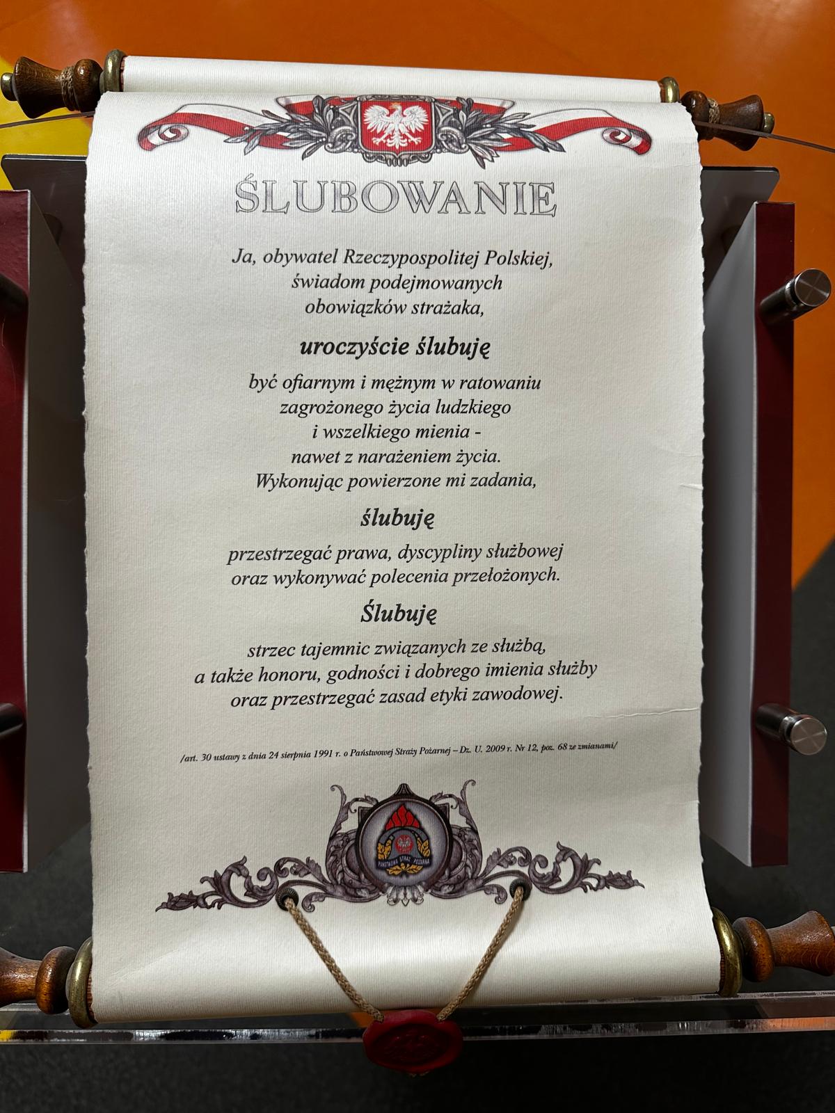„Ja, obywatel Rzeczypospolitej Polskiej, świadom podejmowanych obowiązków strażaka, uroczyście ślubuję być ofiarnym i mężnym w ratowaniu zagrożonego życia ludzkiego i wszelkiego mienia – nawet z narażeniem życia. Wykonując powierzone mi zadania, ślubuję przestrzegać prawa, dyscypliny służbowej oraz wykonywać polecenia przełożonych. Ślubuję strzec tajemnic związanych ze służbą, a także honoru, godności i dobrego imienia służby oraz przestrzegać zasad etyki zawodowej”.