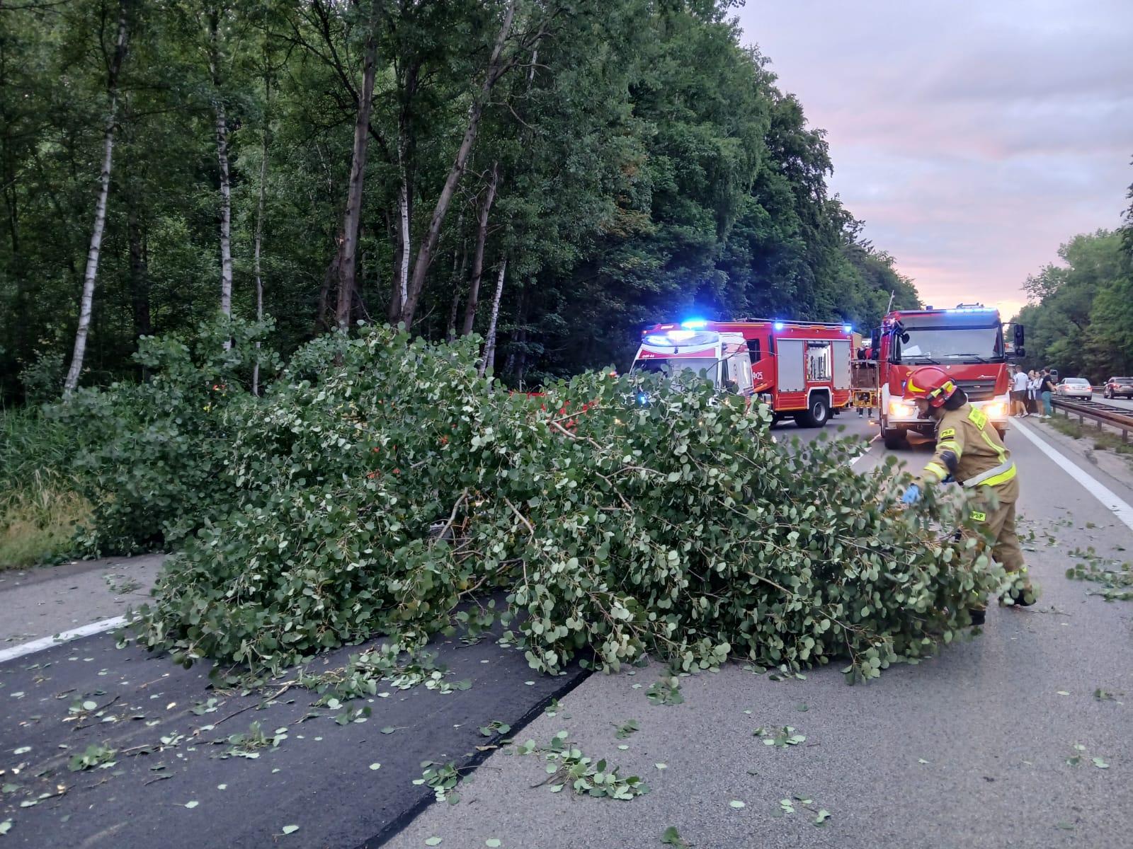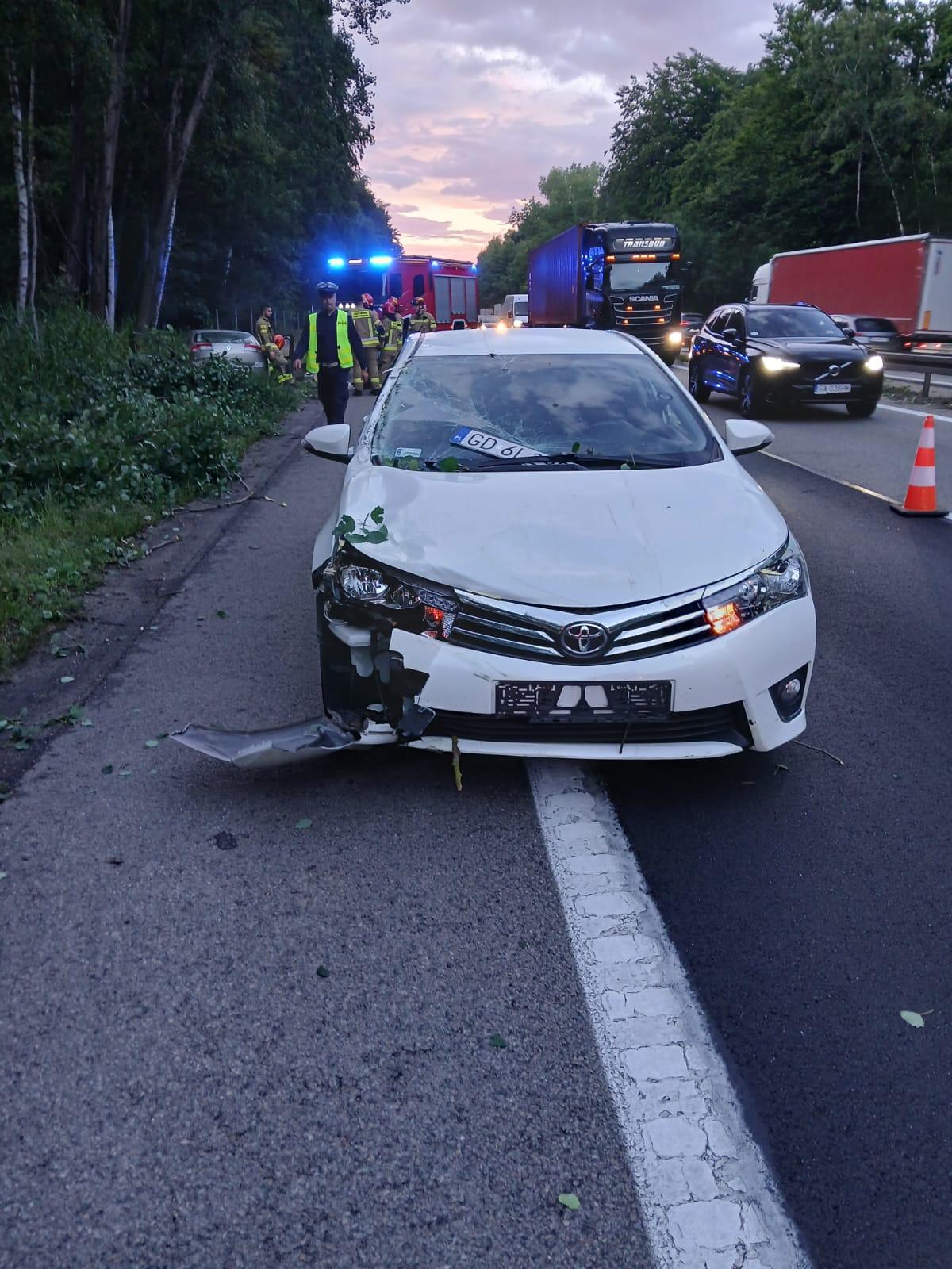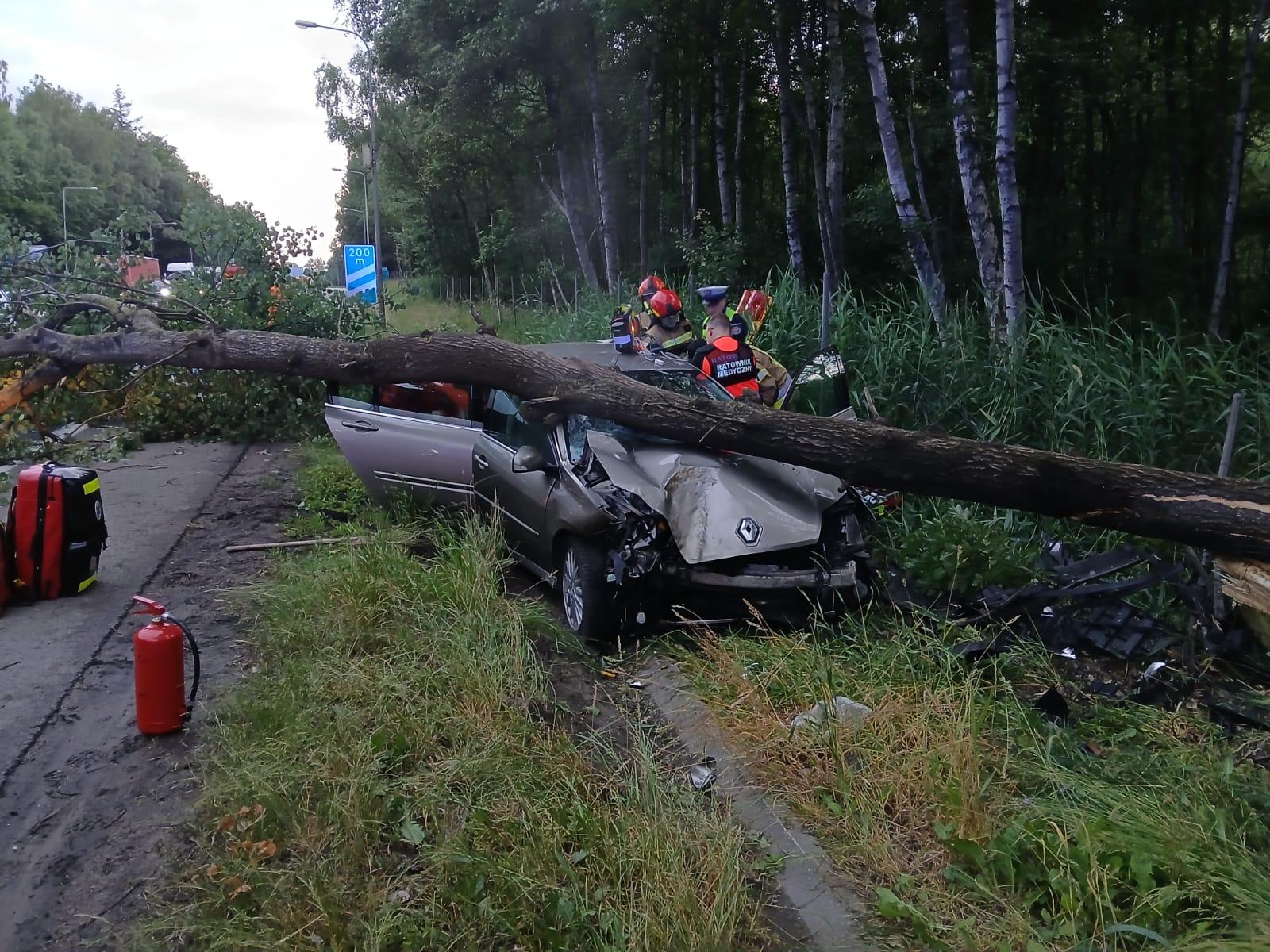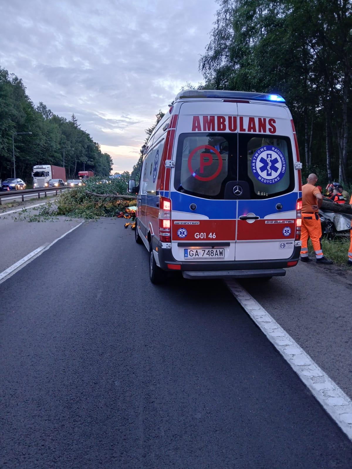 Drugie zgłoszenie wpłynęło o godzinie 20:32. Samochód osobowy poruszający się po Obwodnicy Trójmiasta wypadł z jezdni i uderzył w drzewo, które przewróciło się przygniatając przód pojazdu i blokując oba pasy ruchu w kierunku Gdańska. W leżące drzewo na jezdni wjechał samochód, którym podróżowała kobieta z dwójką dzieci. Na szczęście nie odnieśli oni obrażeń, natomiast kierowca z pierwszego samochodu został przetransportowany do szpitala w celu przeprowadzenia szczegółowych badań.