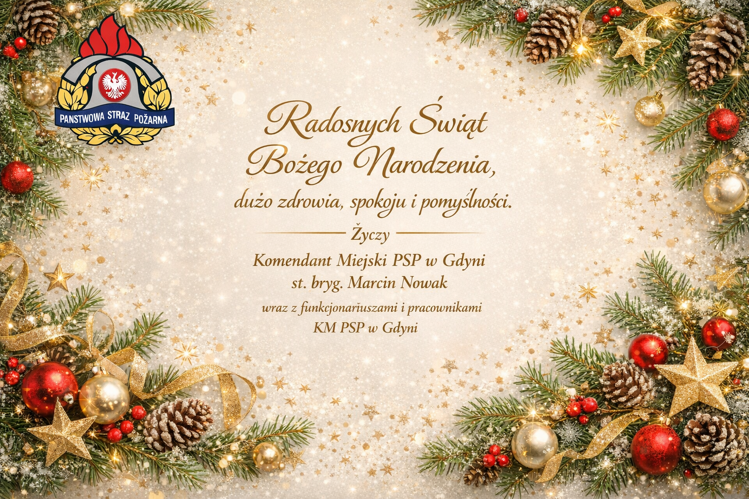 Życzenia świąteczne kierownictwa Komendy Miejskiej Państwowej Straży Pożarnej w Gdyni 23.12.2025 Zdjęcia (1) Pokaż zdjęcie 1 z galerii.
