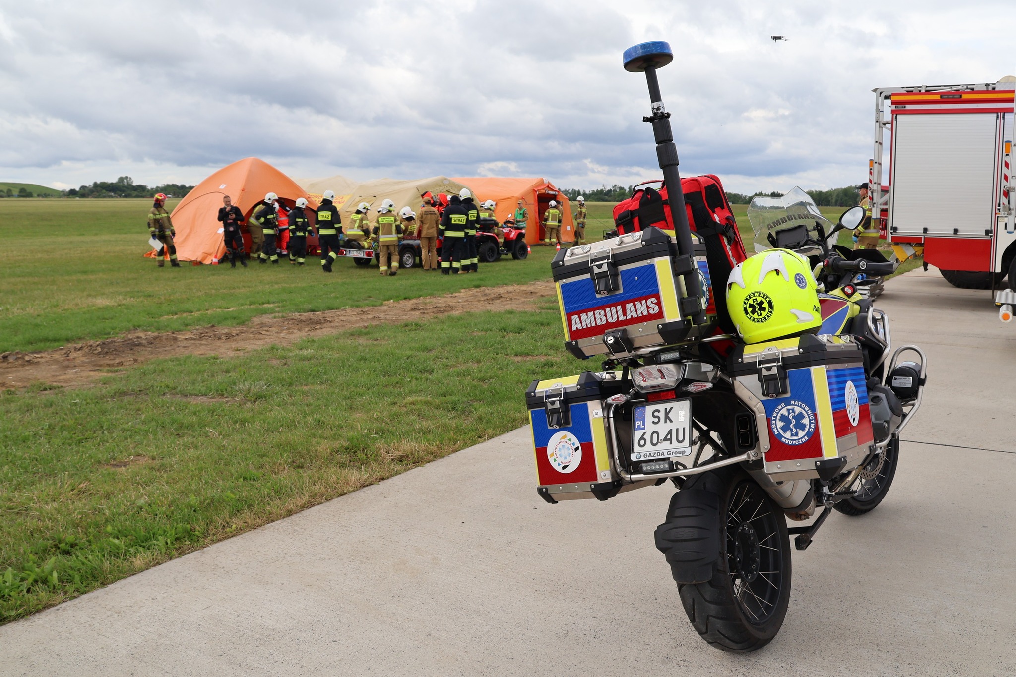 z obiektów znajdujących się na terenie lotniska (Epizod II). Kolejne epizody to konieczność zorganizowania zaopatrzenia wodnego do miejsca ćwiczeń i warsztaty z działań ratownictwa chemiczno-ekologicznego poziomu podstawowego przeprowadzone przez strażaków ze Specjalistycznej Grupy Ratownictwa Chemiczno – Ekologicznego JRG Gliwice- Łabędy. W ćwiczeniach, w ramach realizacji wytycznych współdziałania służb interweniujących na miejscu zdarzenia