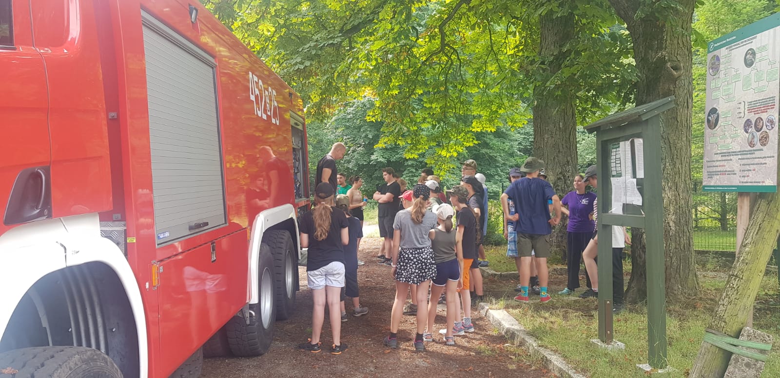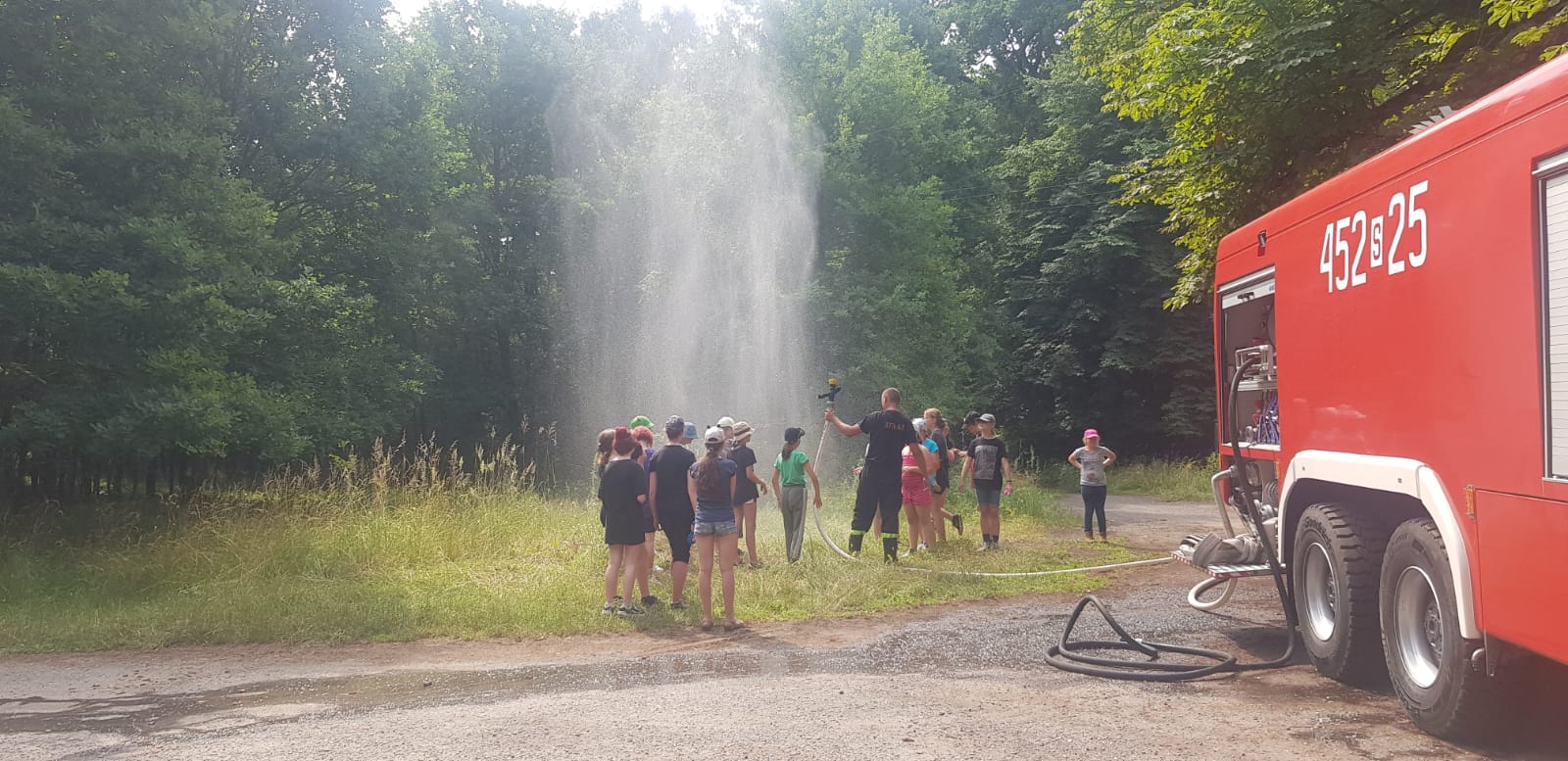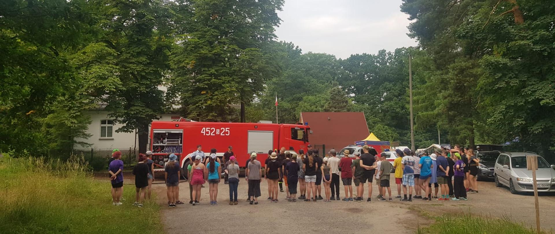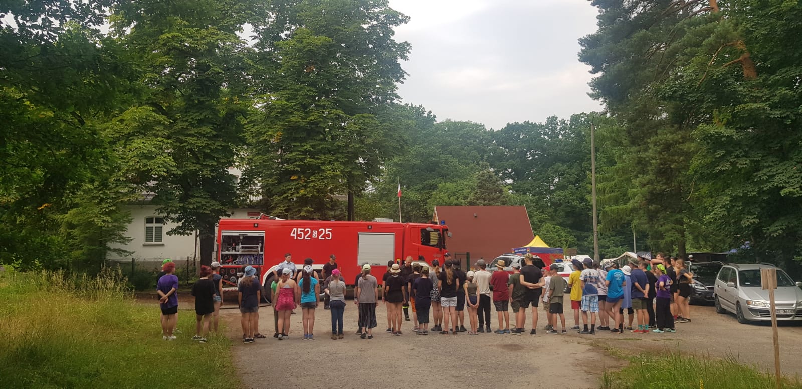 z uczestnikami obozowiska przeprowadzili prelekcje z zakresu bezpiecznego wypoczynku w tym zasad zachowania się w przypadku wystąpienia zagrożenia. W trakcie wizyty gliwickich strażaków zaprezentowano obozowiczom samochód ratowniczo-gaśniczy wraz z wyposażeniem oraz możliwości podawania mgłowych prądów wody, które w tym przypadku skutecznie schłodziły i orzeźwiły uczestników obozowiska.