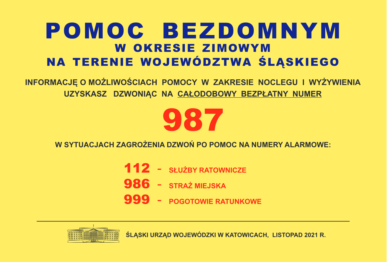 w zakresie noclegu i wyżywienia dla osób bezdomnych na terenie województwa śląskiego oraz informujący o numerach telefonów alarmowych. Infolinia 987 obsługiwana jest całodobowo przez służbę dyżurną Wojewódzkiego Centrum Zarządzania Kryzysowego.