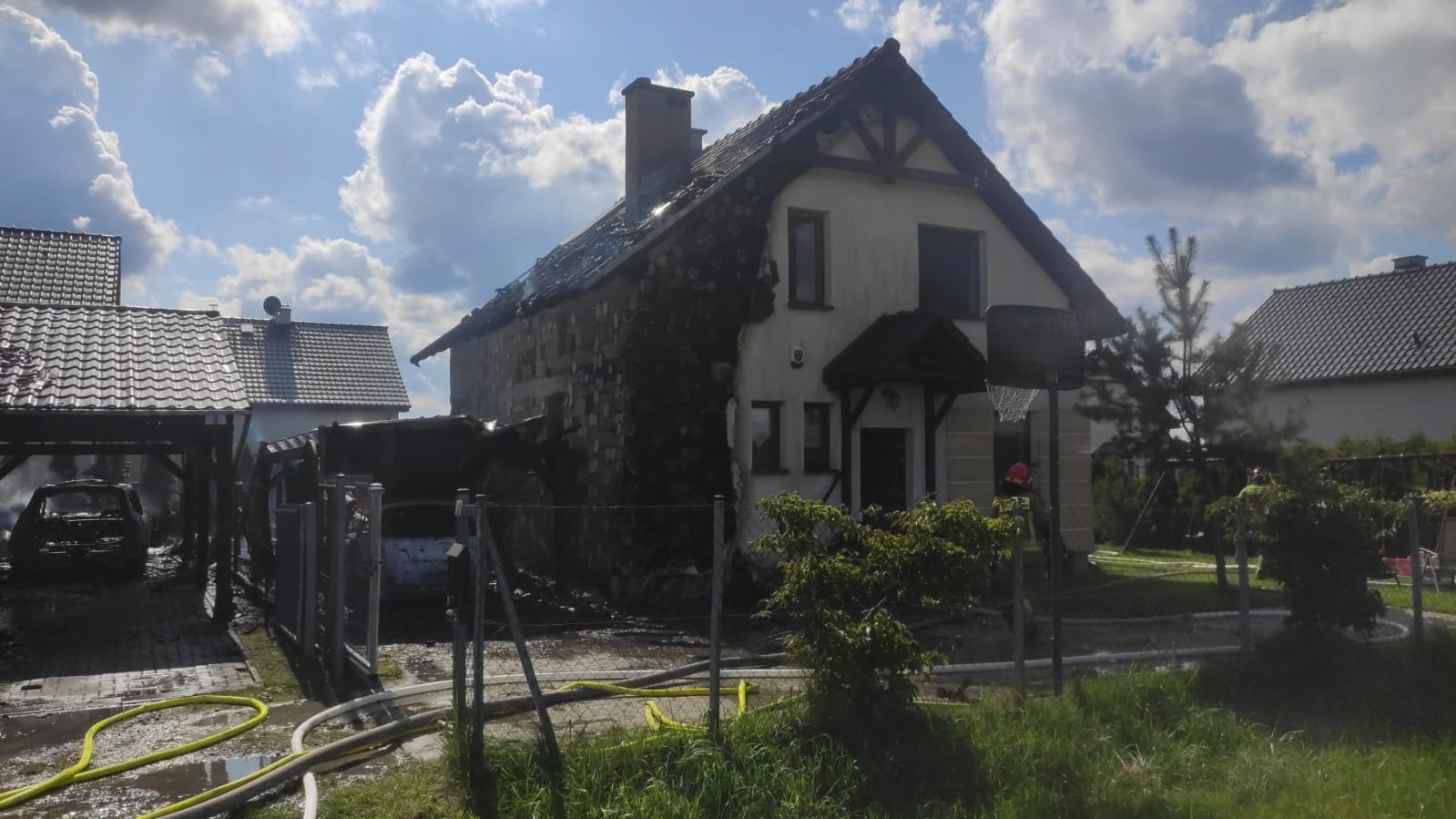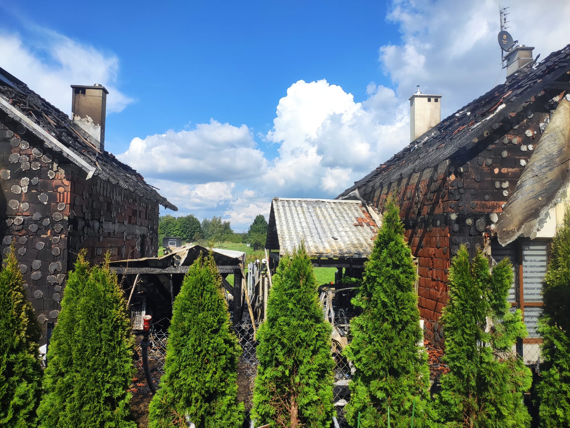 03 września 2023 r. o godzinie 13:18 dyżurny Stanowiska Kierowania Komendanta Miejskiego Państwowej Straży Pożarnej w Gliwicach przyjął zgłoszenie z którego wynika, że w miejscowości Sośnicowice doszło do pożaru domu jednorodzinnego. Z kolejnych zgłoszeń wynika, że pożar rozprzestrzenił się na budynek znajdujący się obok. Przybyły na miejsce pierwszy dowódca potwierdza zgłoszenie i precyzuje rozmiar zdarzenia - wszyscy mieszkańcy opuścili budynek i nie odnieśli obrażeń, ogniem objęte elewacje i połacie dachowe dwóch budynków mieszkalnych, między budynkami pożarem objęte dwie wiaty wraz z dwoma samochodami. Strażacy zabezpieczyli miejsce zdarzenia, prowadzili działania mające na celu ugaszenie pożaru i zapobieżenie rozprzestrzenienia się pożaru na trzeci budynek. W akcji trwającej prawie siedem godzin brało udział 14 samochodów straży pożarnej i 50 strażaków.