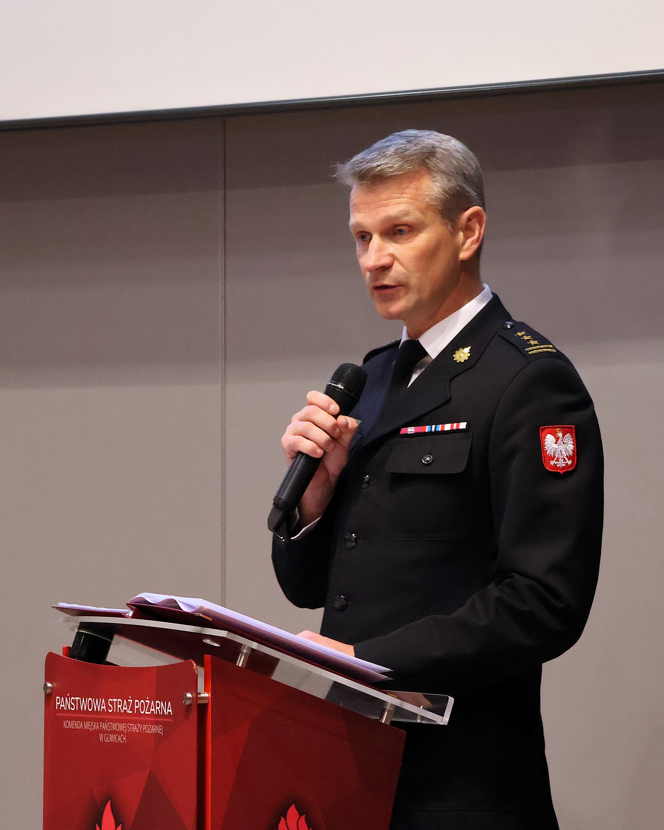 Kolejnym punktem programu było wystąpienie Zastępcy Komendanta Miejskiego PSP w Gliwicach st. bryg. Wojciecha Piechaczka, który przedstawił funkcjonowanie ochrony przeciwpożarowej oraz Krajowego Systemu Ratowniczo-Gaśniczego na terenie miasta Gliwice i powiatu gliwickiego w ciągu ostatnich trzech dekad.