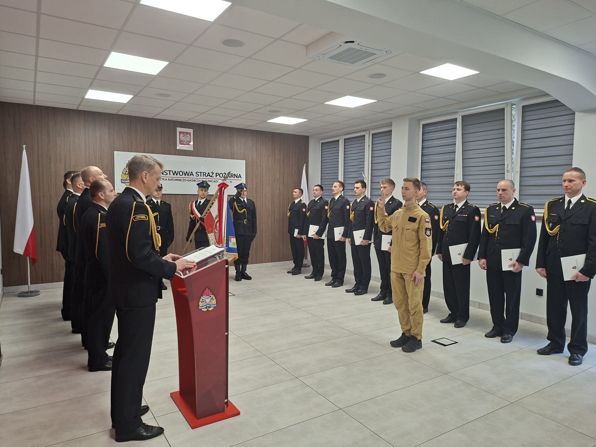 Jednym z najbardziej podniosłych momentów uroczystości było ślubowanie nowo przyjętego funkcjonariusza. Rotę ślubowania, składając zobowiązanie do uczciwej, odpowiedzialnej i pełnej poświęcenia służby na rzecz Rzeczypospolitej Polskiej, wypowiedział str. Patryk Strancich. Tym samym dołączył do grona gliwickich strażaków, rozpoczynając swoją zawodową drogę w Państwowej Straży Pożarnej.
