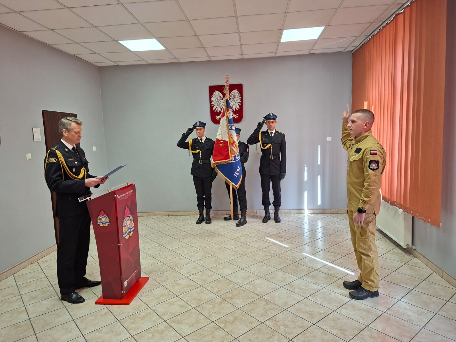 Ślubowanie przyjął Komendant Miejski PSP w Gliwicach – st. bryg. Marian Matejczyk, w obecności pocztu sztandarowego. W uroczystości udział wzięło dowództwa Jednostki Ratowniczo-Gaśniczej PSP w Gliwicach, w której strażak będzie pełnił służbę, oraz naczelnik Wydziału Organizacyjno-Kadrowego.