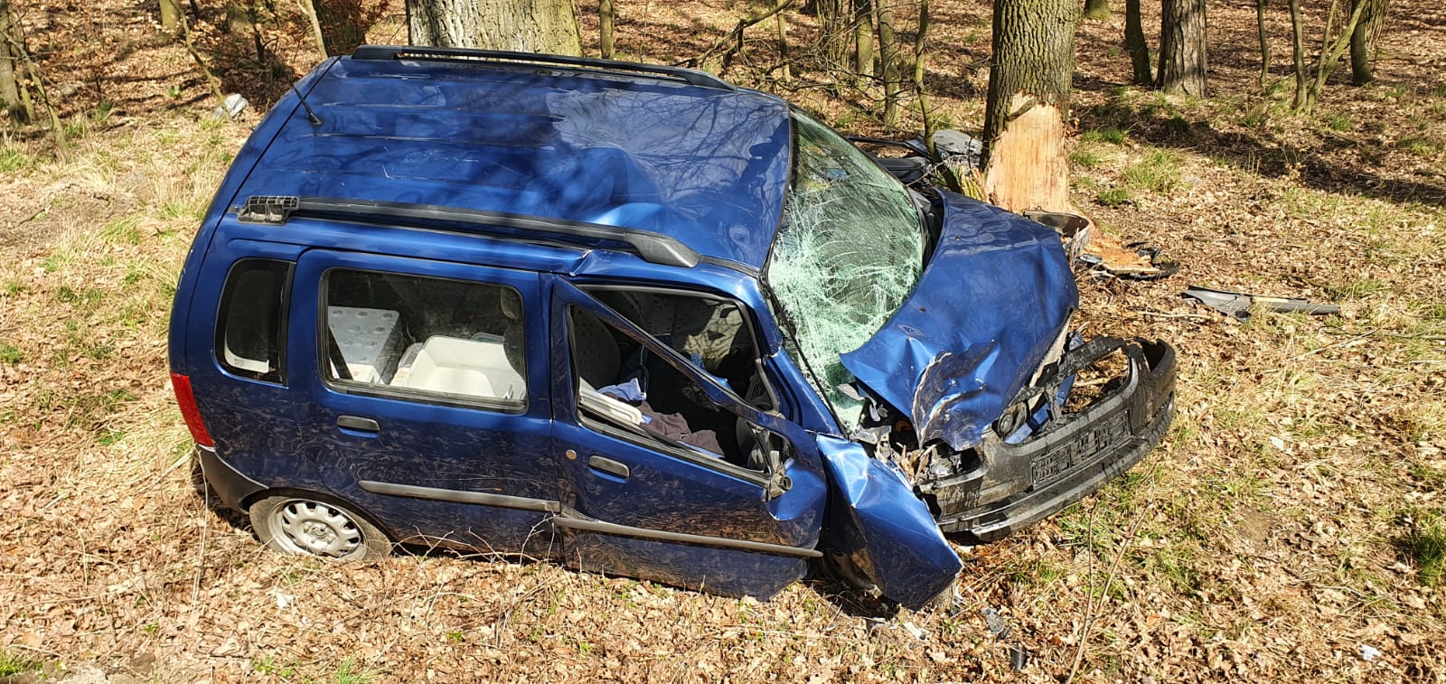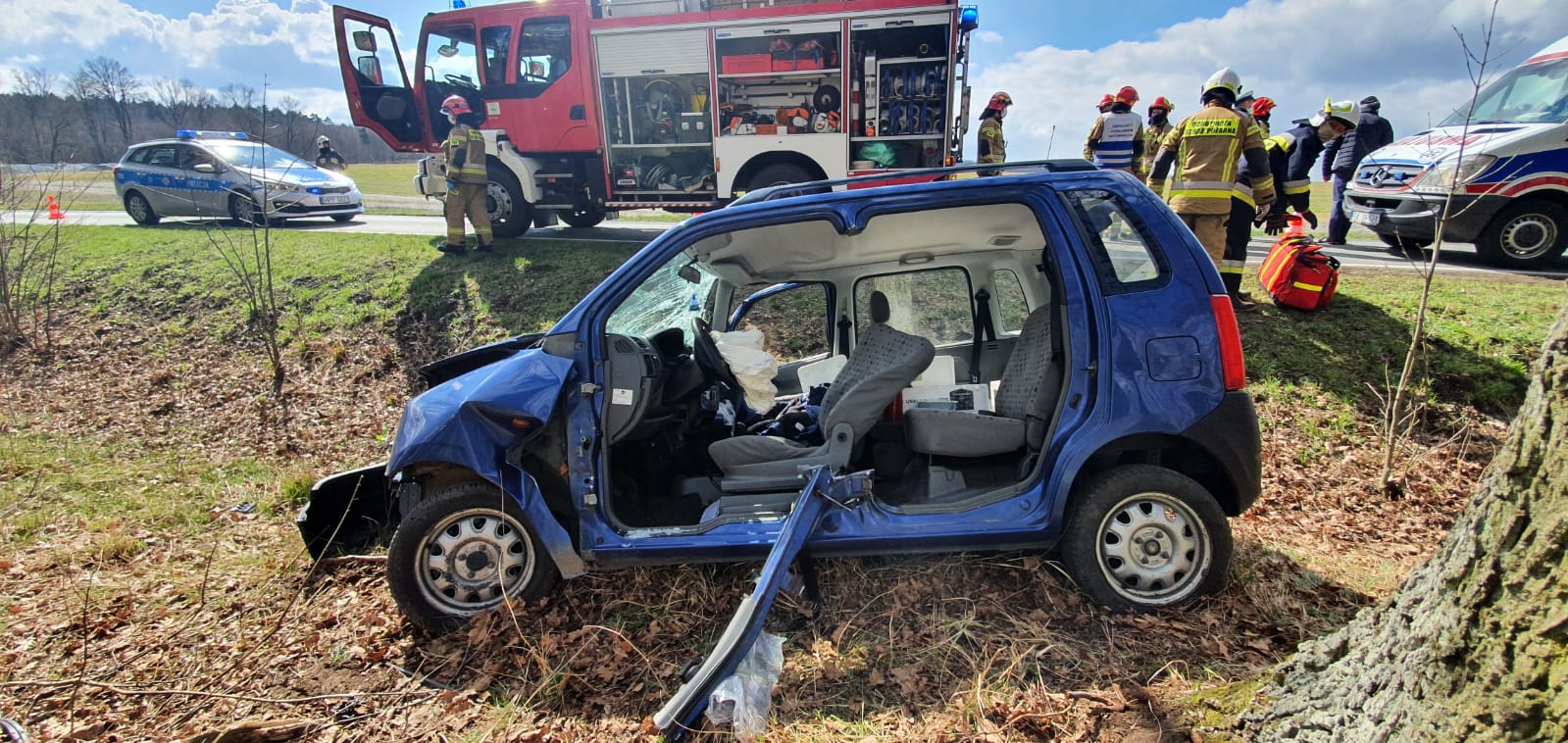Po przybyciu na miejsce zdarzenia straży pożarnej został potwierdzony wypadek samochodu osobowego, które uderzyło w drzewo. W wyniku wypadku poszkodowany został kierowca pojazdu.
