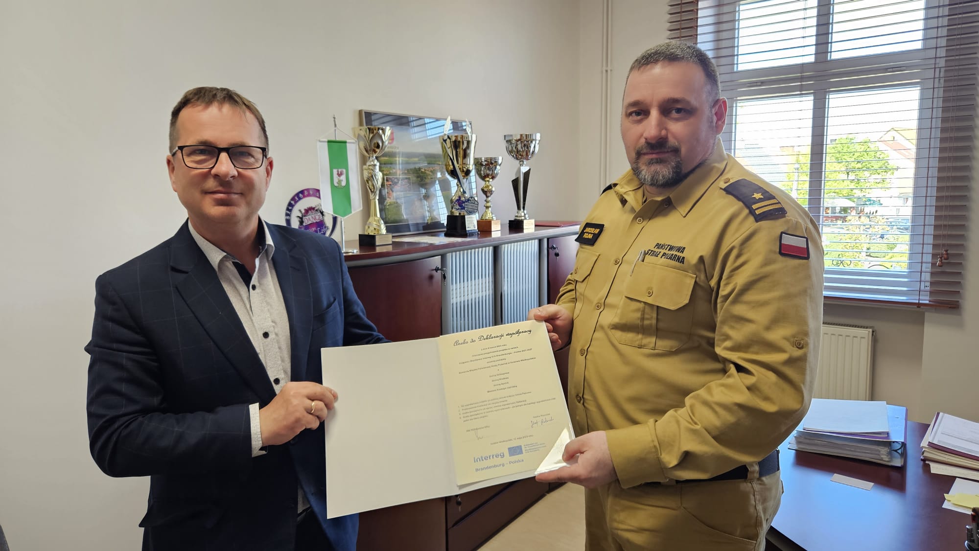 Sygnatariuszami aneksu do "Deklaracji współpracy (...)" byli mł. bryg. Jarosław Rojna - p. o. Komendanta Miejskiego PSP w Gorzowie Wlkp. oraz Pan Józef Piotrowskim - Wójt Gminy Pszczew. W związku z powyższym w projekcie, po stronie polskiej uczestniczyć będą, oprócz naszej komendy, następujące Miasta i Gminy: Kostrzyn nad Odrą, Kłodawa, Santok, Dobiegniew oraz Pszczew. W ramach tego projektu swoją współpracę zacieśnią partnerskie gminy po obu stronach Odry a także wymienią się doświadczeniami i umiejętnościami w zakresie szeroko pojętego ratownictwa technicznego (drogowego, kolejowego, wodnego i medycznego) Do realizacji założeń współpracy zakupiony zostanie specjalistyczny sprzęt dla KM PSP w Gorzowie Wlkp. oraz 7 jednostek Ochotniczy Straży Pożarnych.
