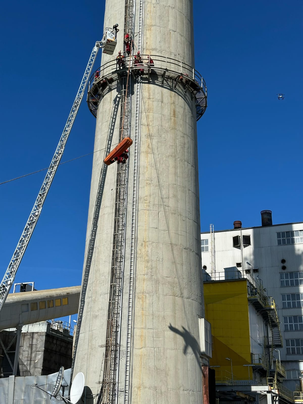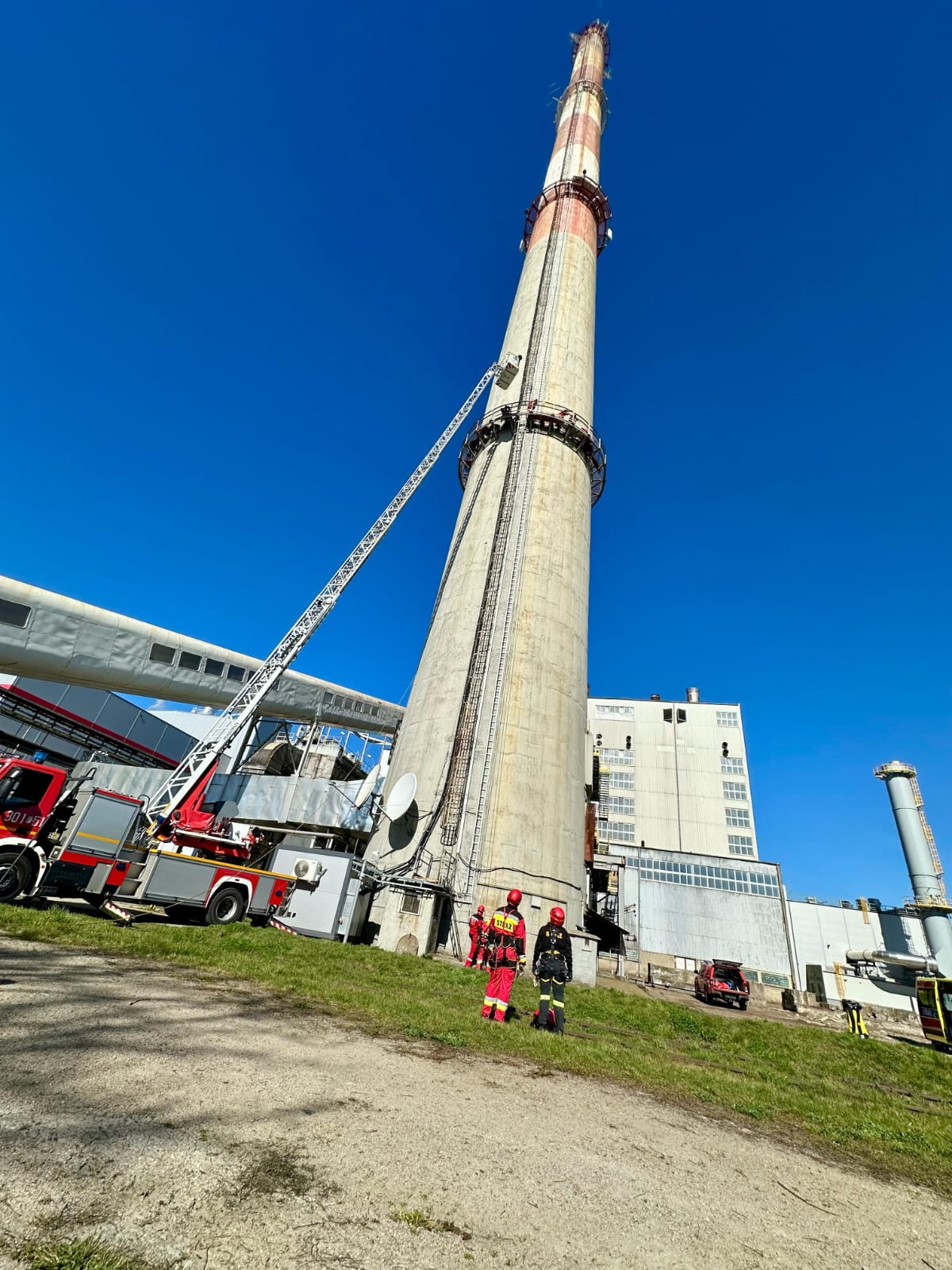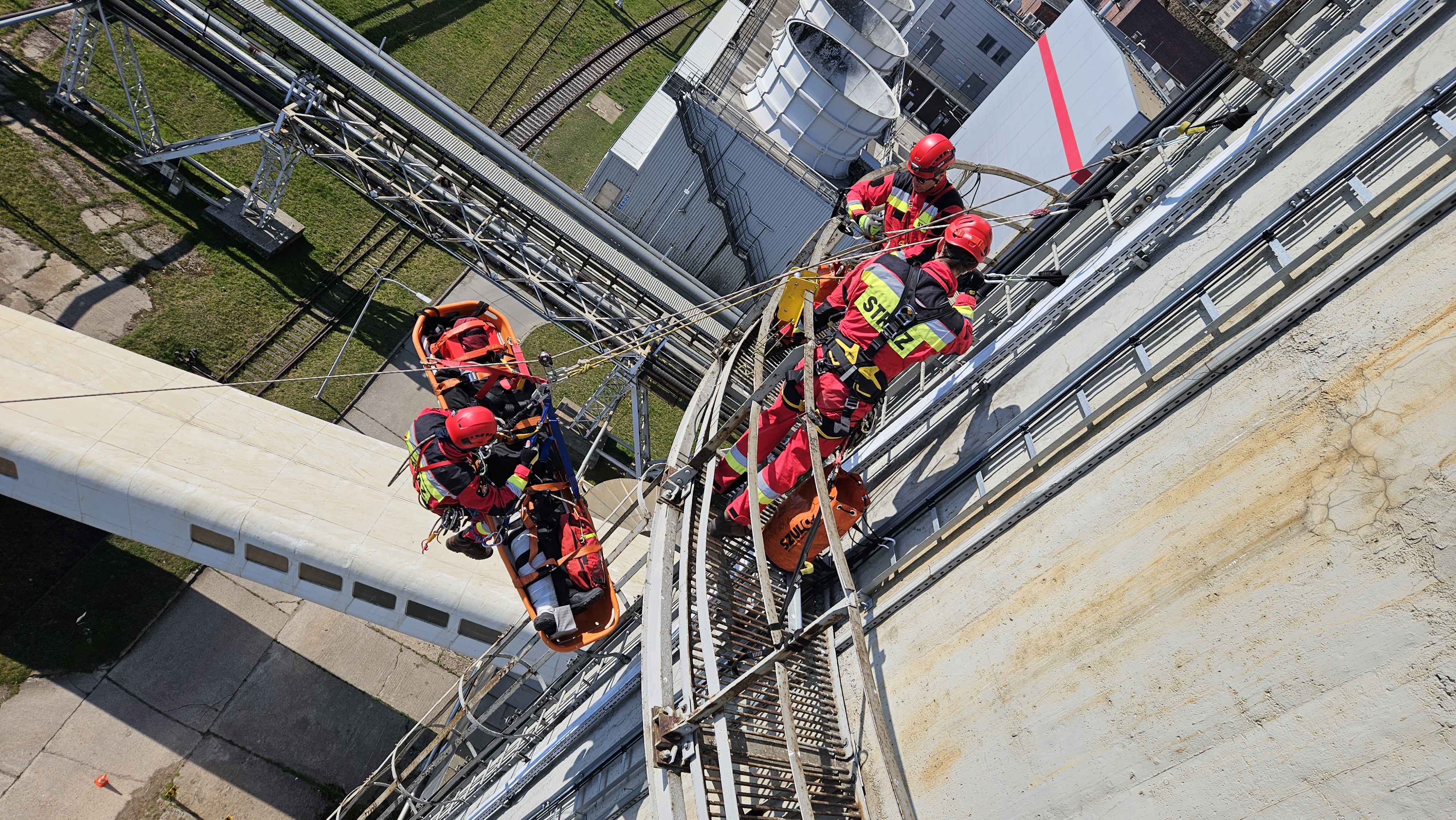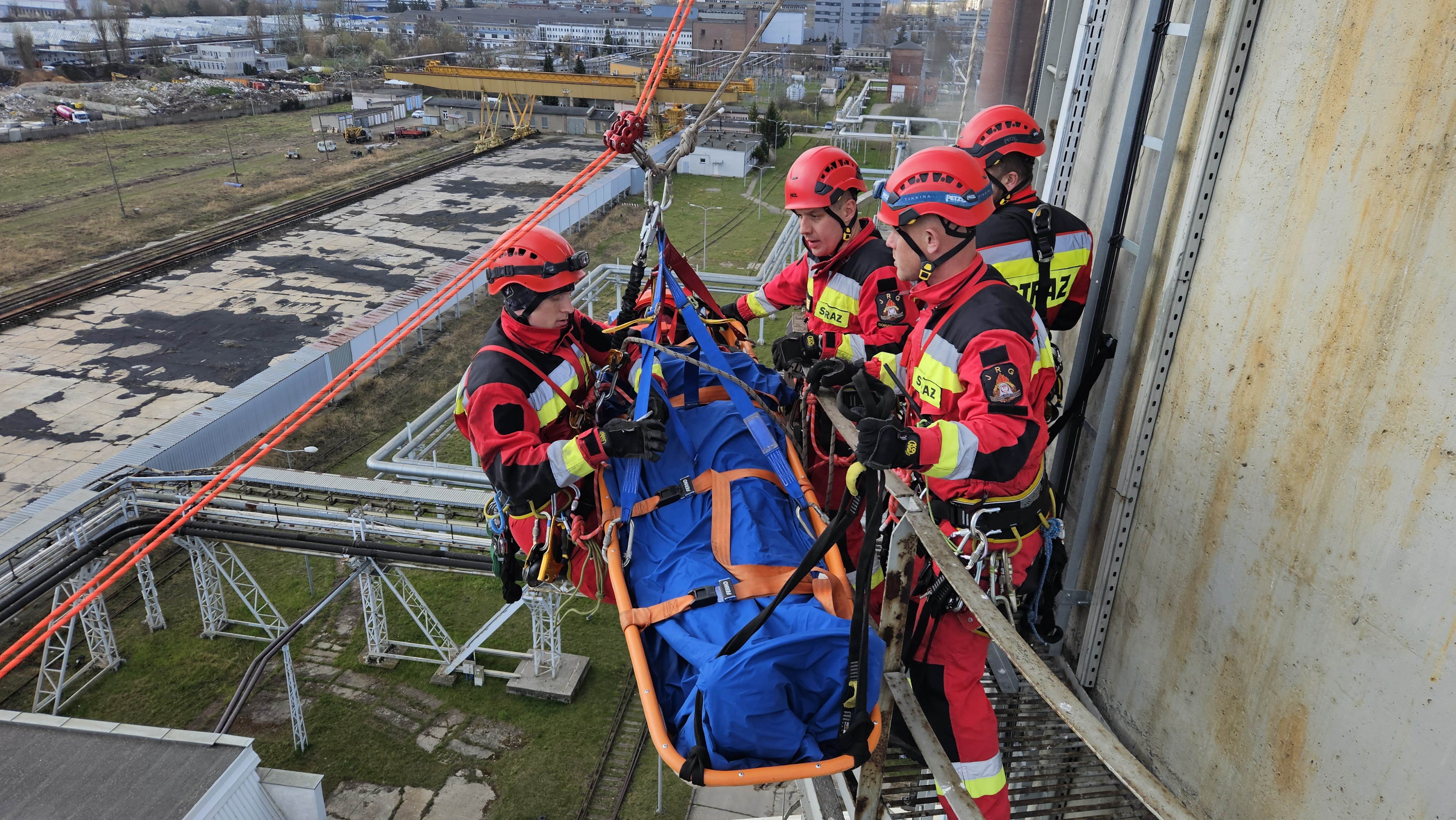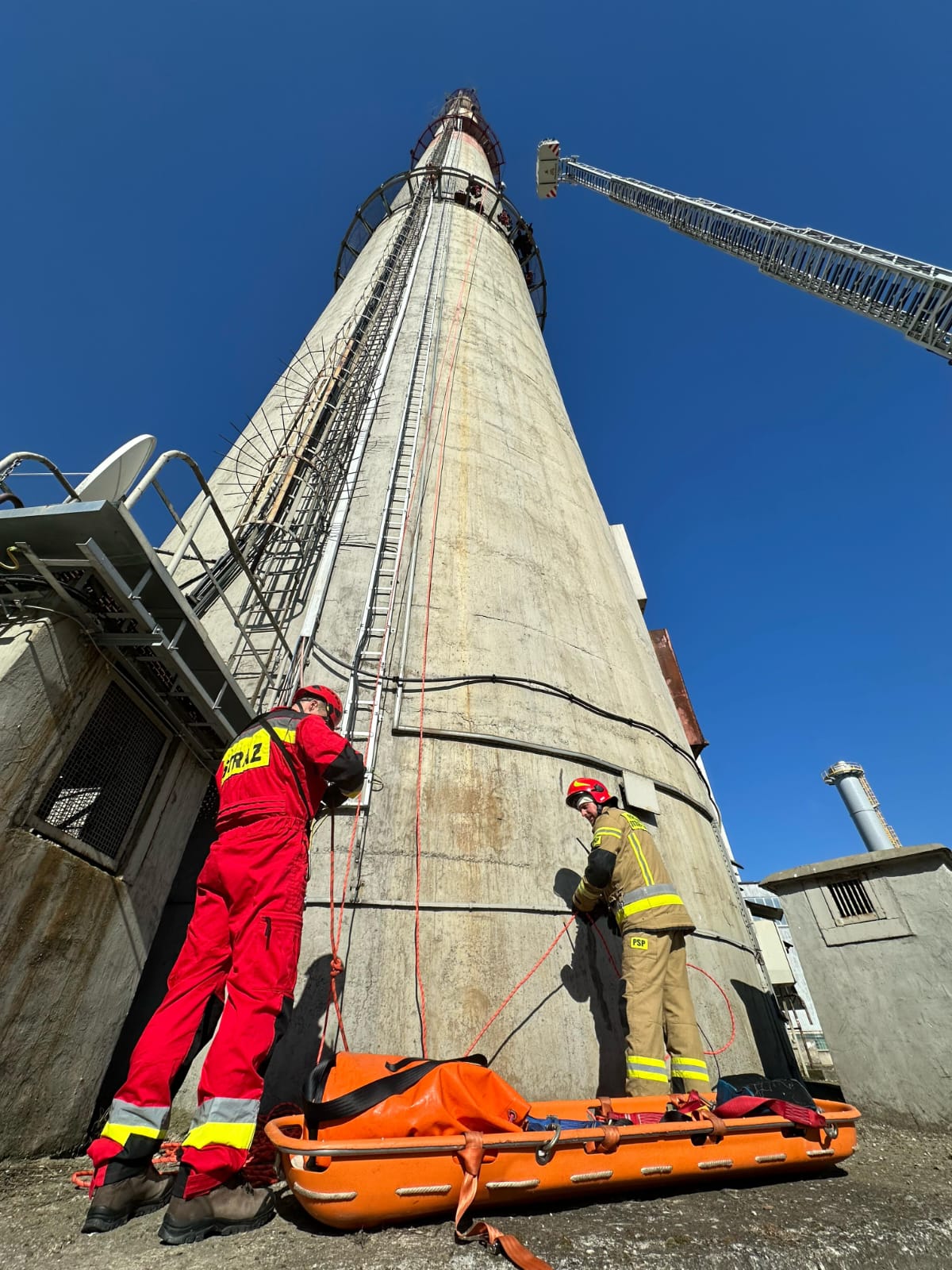 W dniach 1-3 kwietnia br. na terenie PGE Energia Cieplna S.A. oddział Elektrociepłownia w Gorzowie Wielkopolskim odbyły się ćwiczenia Specjalistycznej Grupy Ratownictwa Wysokościowego. Scenariusz ćwiczeń zakładał iż na terenie zakładu Elektrociepłowni prowadzone są prace konserwacyjne na kominie. W trakcie prac dochodzi do wypadku, w wyniku którego dwie osoby znajdujące się na linach na wysokości około 40 metrów (5 m nad pierwszą galerią komina), spadają na poniższą galerię, doznając poważnych urazów (istnieje podejrzenie urazu kręgosłupa).