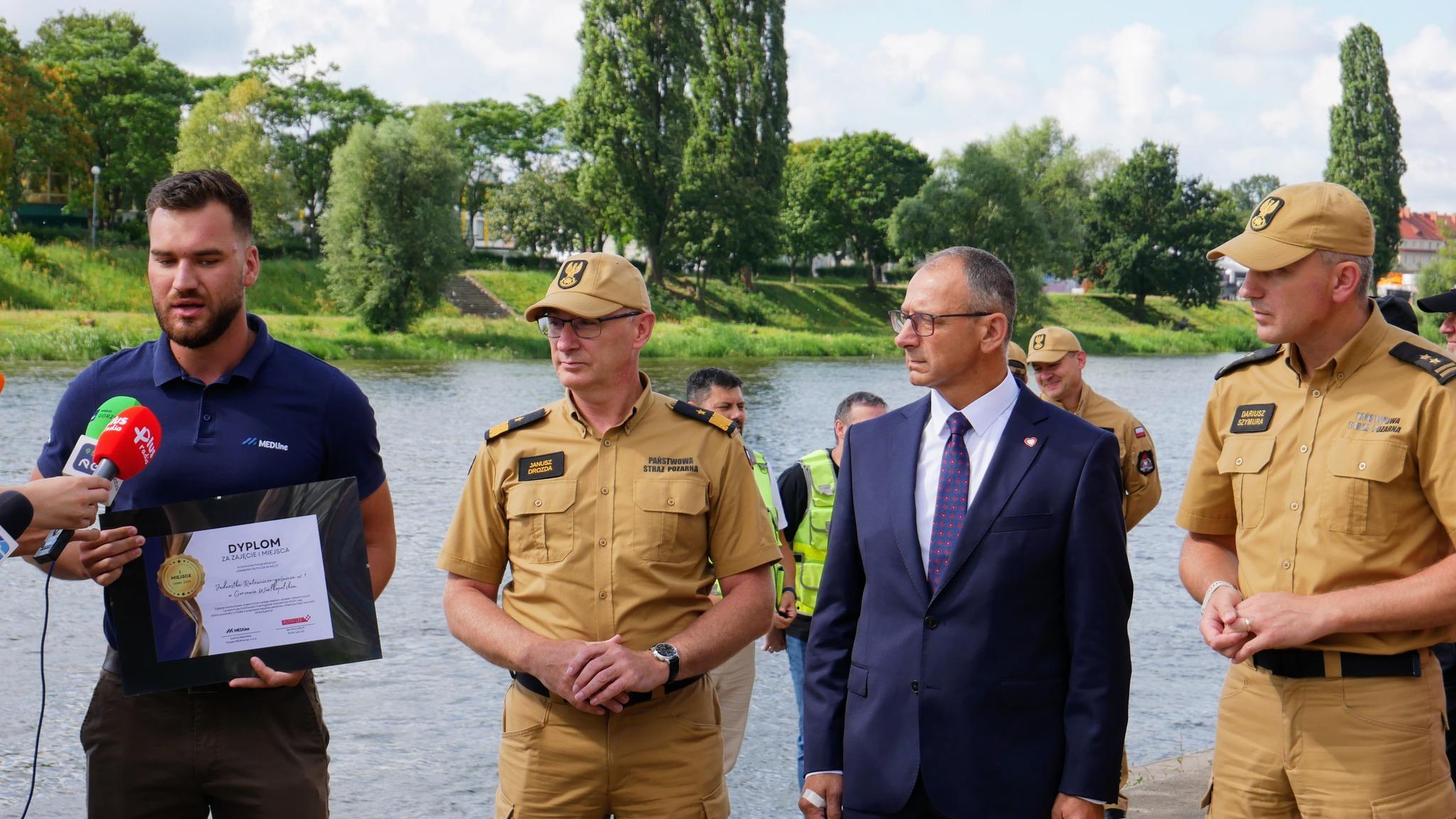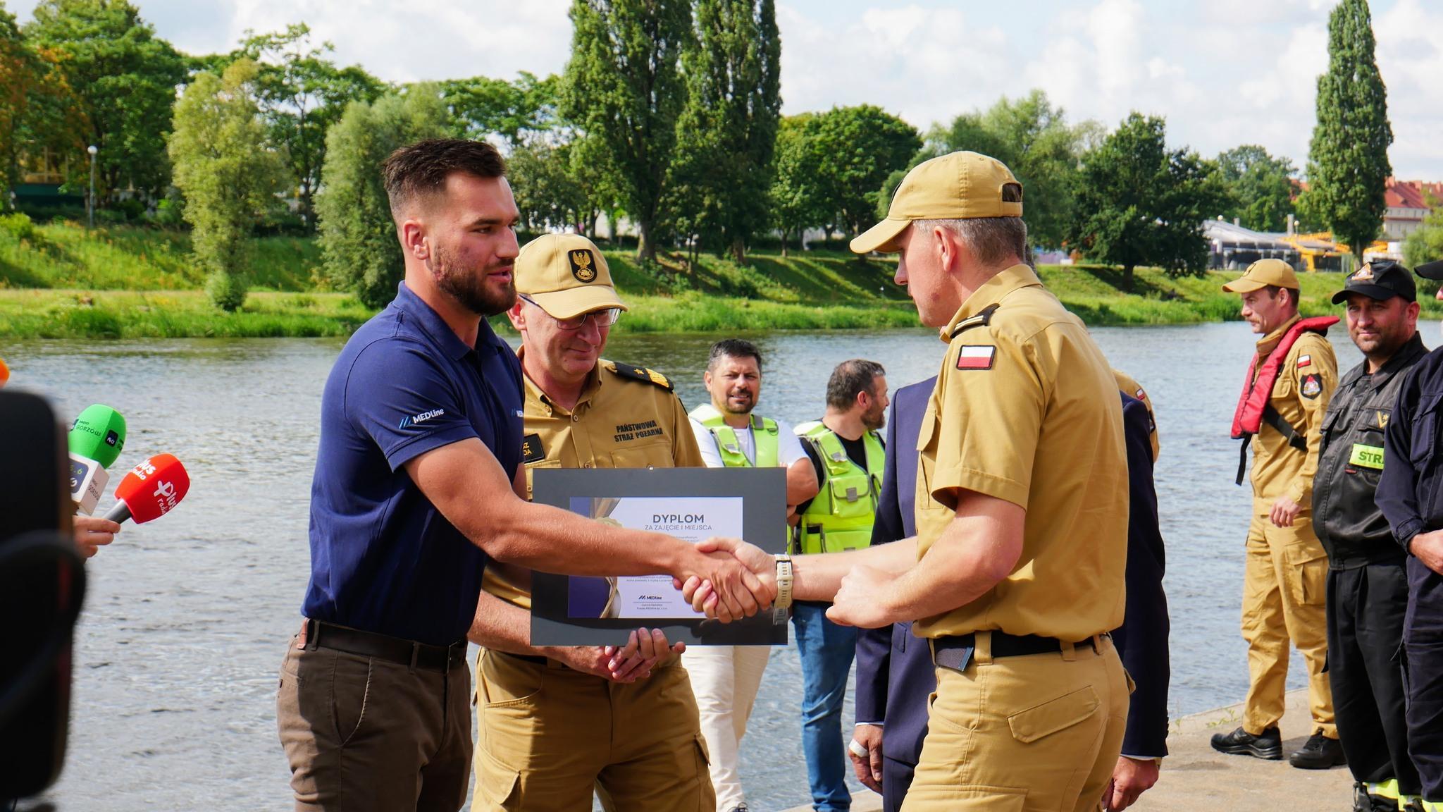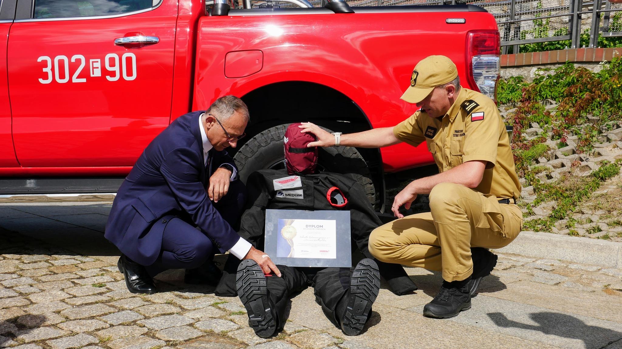 Manekina ewakuacyjnego Ruth Lee Duty Range z rąk menagera produktu MEDline Group Konrada Błaszaka odebrał komendant miejski Państwowej Straży Pożarnej w Gorzowie Wielkopolskim bryg. Dariusz Szymura.