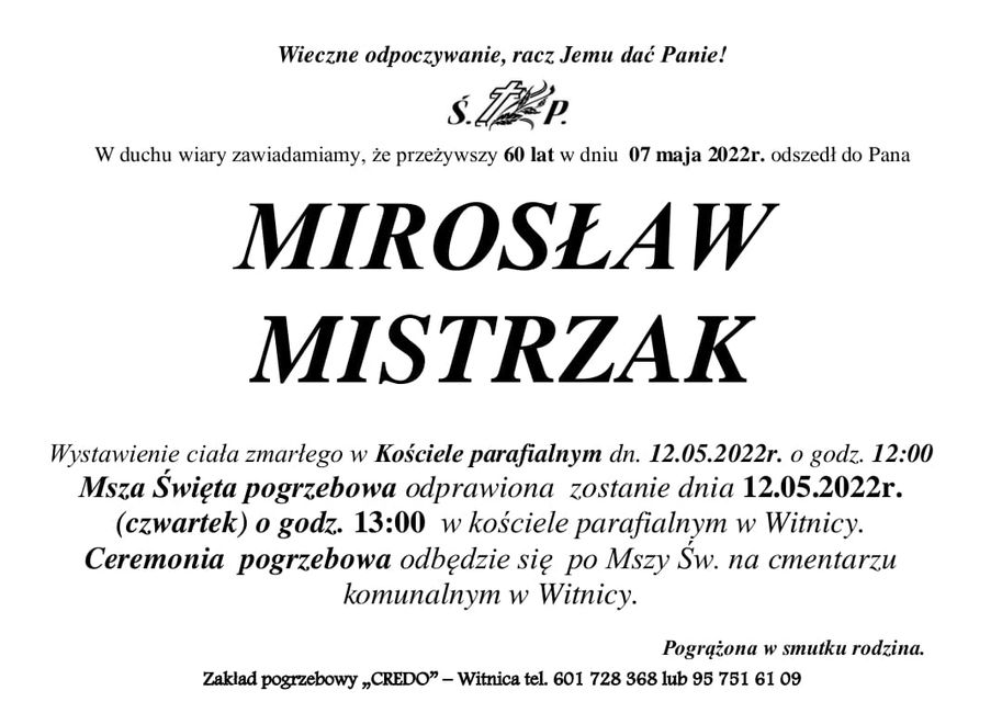 Z głębokim żalem zawiadamiamy, że dnia 7 maja, w wieku 60 lat, odszedł od nas na wieczną służbę dh Mirosław Mistrzak.