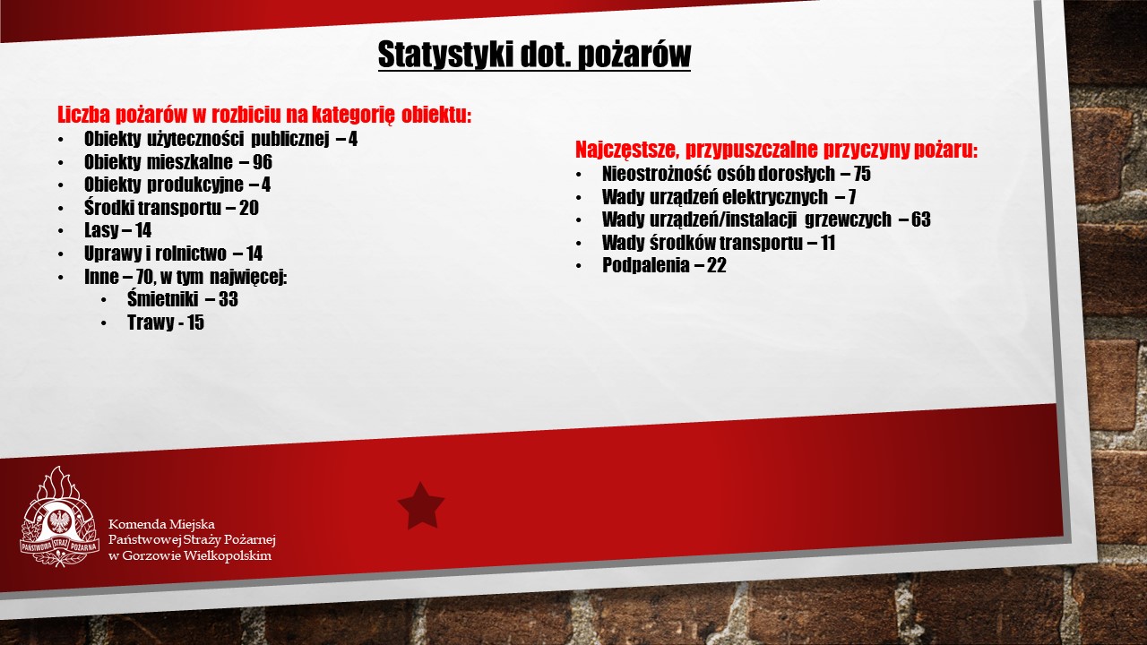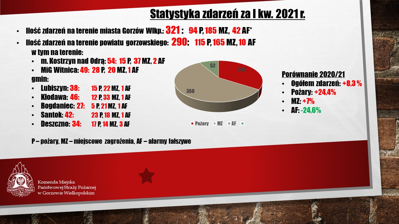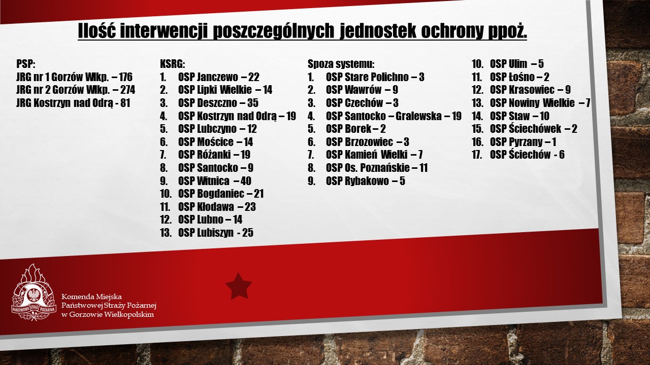 Poniżej prezentujemy garść danych statystycznych dot. zdarzeń do jakich doszło na terenie miasta Gorzów Wlkp. oraz powiatu gorzowskiego, czyli całego terenu chronionego przez jednostki ochrony przeciwpożarowej podległych operacyjnie pod KM PSP w Gorzowie Wlkp.